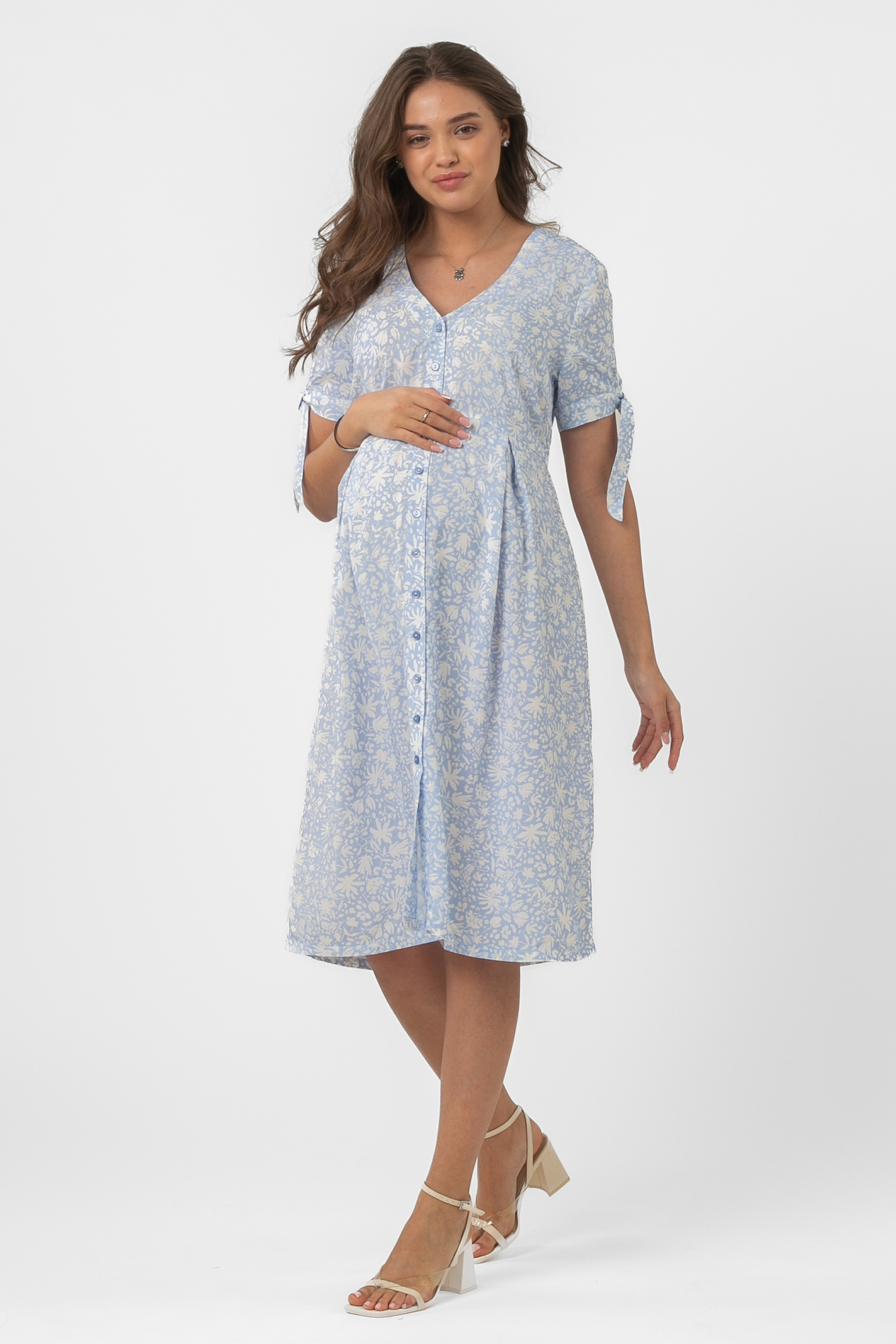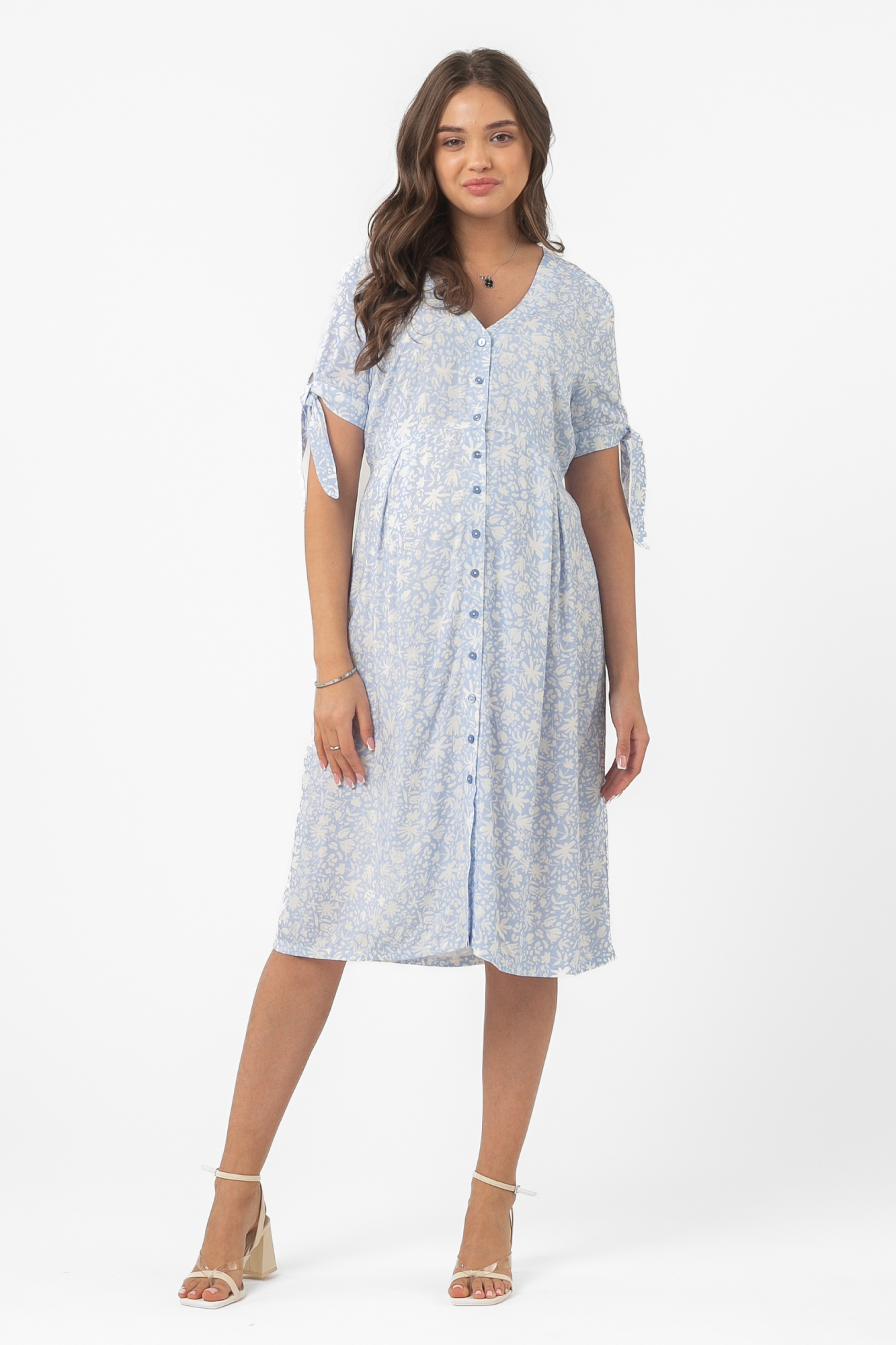 Красивое летнее платье для беременных выполнено из струящейся вискозной ткани с рисунком. Классический приталенный силуэт, свободный крой, длина миди делают модель универсальной для любого месяца беременности. Комфорт в носке добавляют детали: короткий рукав с завязками, застежка на пуговице. Юбка сарафана достаточно свободна, не мешает растущему животику, но в то же время плавно подчеркивает фигуру. Яркое платье с принтом пригодится будущей маме для прогулок, встреч с подругами, праздников или на выписку. Оно отлично комбинируется с другими вещами и обувью из женского гардероба. На выбор предлагается две симпатичные расцветки.