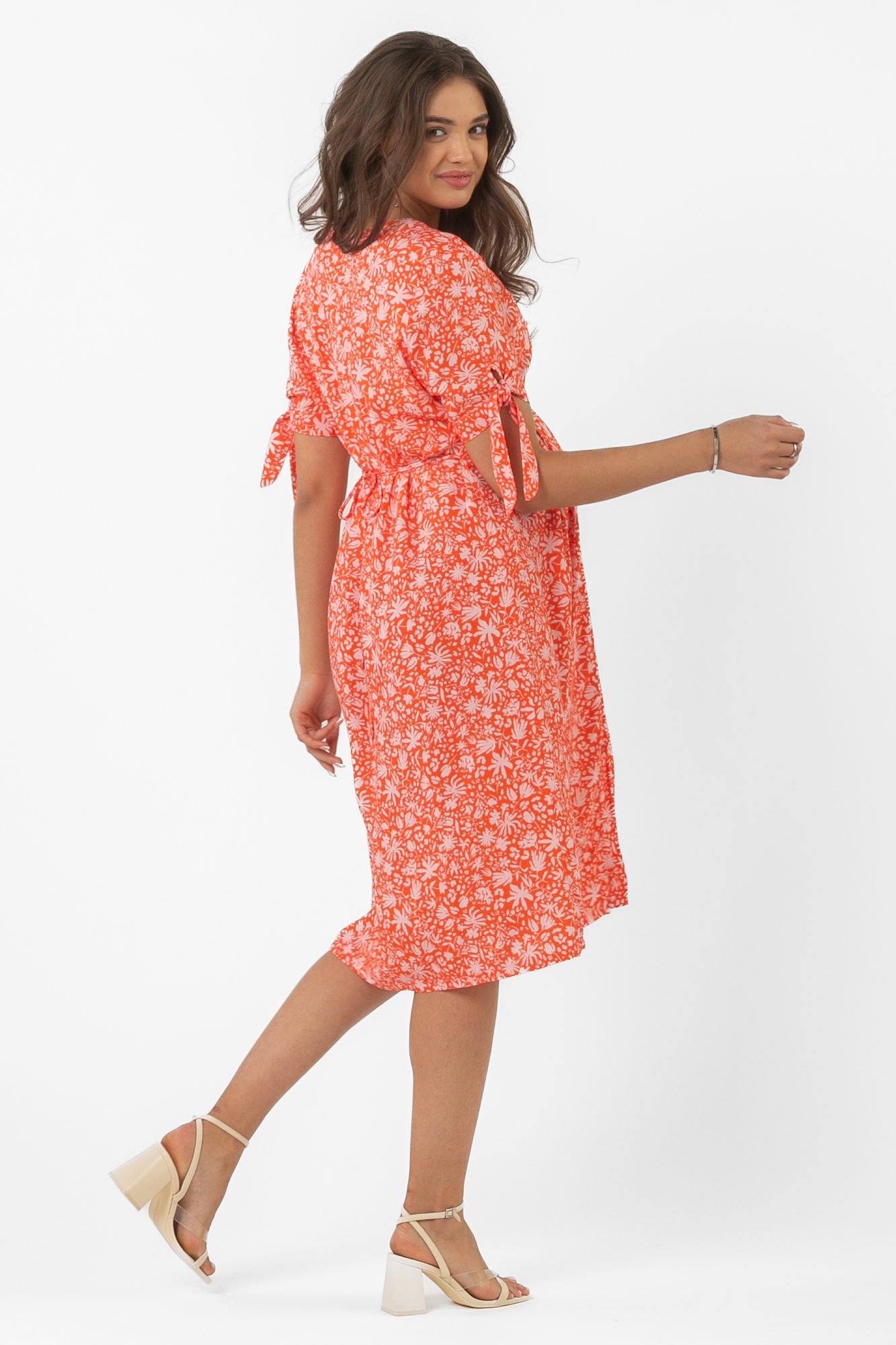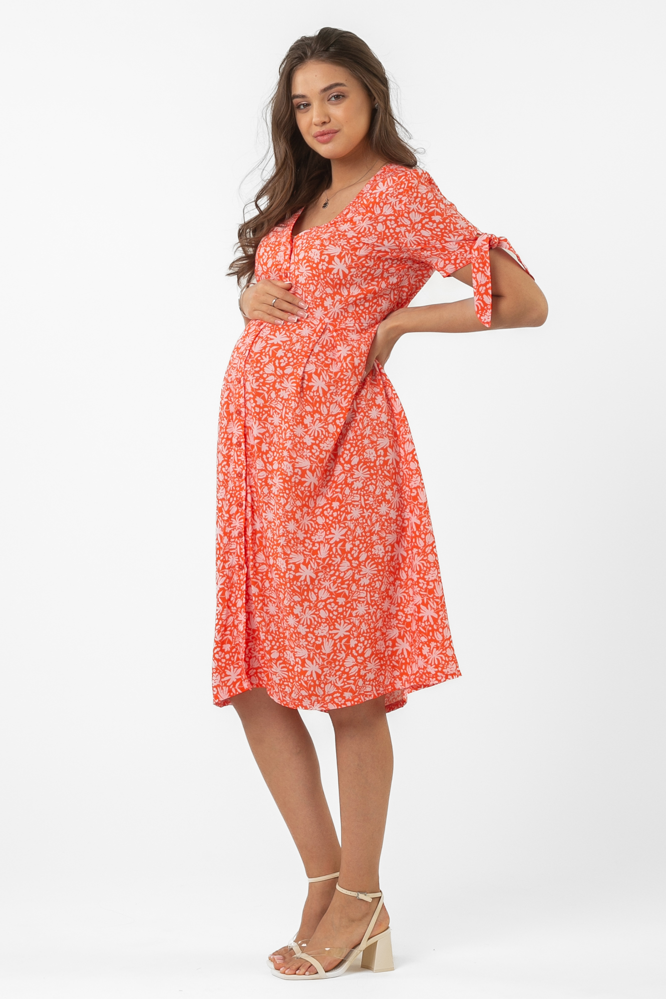 Красивое летнее платье для беременных выполнено из струящейся вискозной ткани с рисунком. Классический приталенный силуэт, свободный крой, длина миди делают модель универсальной для любого месяца беременности. Комфорт в носке добавляют детали: короткий рукав с завязками, застежка на пуговице. Юбка сарафана достаточно свободна, не мешает растущему животику, но в то же время плавно подчеркивает фигуру. Яркое платье с принтом пригодится будущей маме для прогулок, встреч с подругами, праздников или на выписку. Оно отлично комбинируется с другими вещами и обувью из женского гардероба. На выбор предлагается две симпатичные расцветки.
