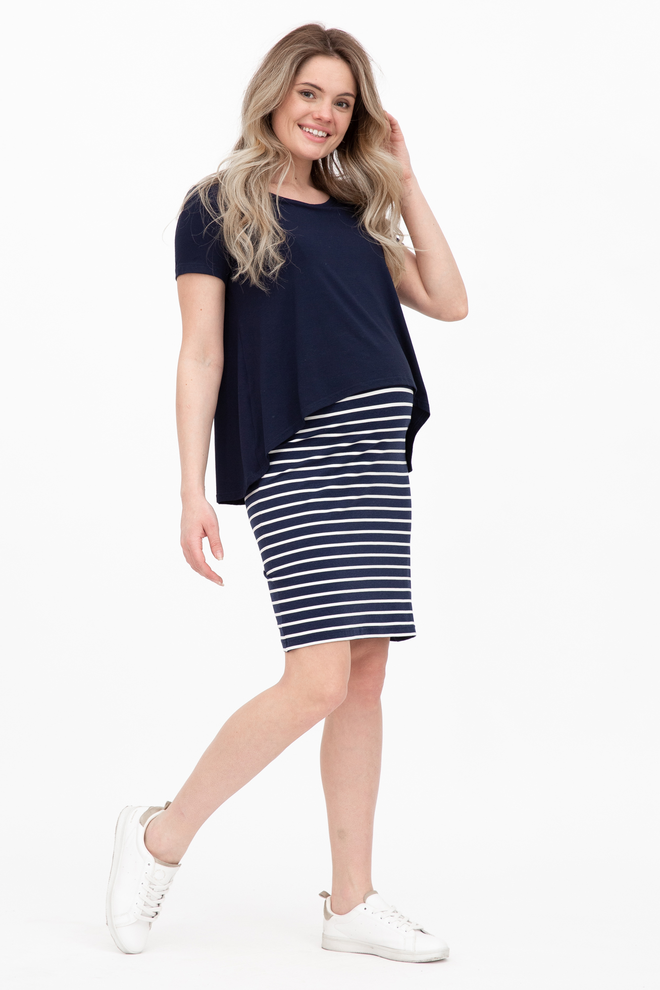 Оригинальное платье с модным эффектом многослойности скомбинировано из мягкого, очень эластичного тонкого трикотажа двух цветов. Трикотажное платье-основа прямого свободного силуэта. Верхний слой платья выполнен в виде тонкого топа с коротким рукавом, с фигурной линией низа и удлиненной задней частью. «Секрет для кормления» спрятан под топом. Прекрасный вариант для работы и прогулки летом как в период беременности, так и в период кормления.