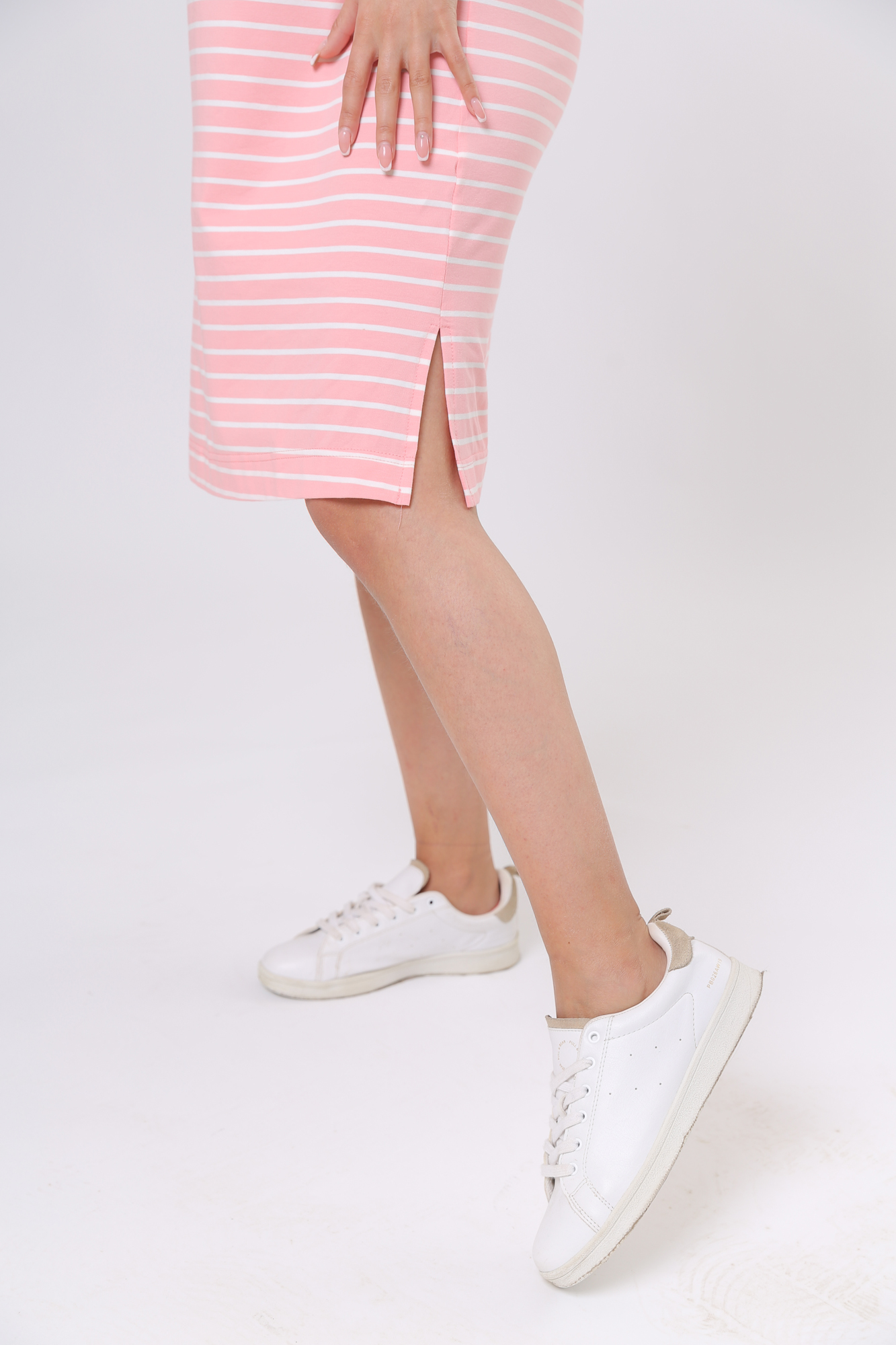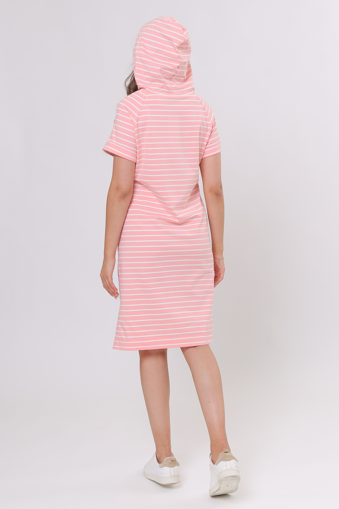 Трикотажное платье для беременных и кормящих. Короткий рукав, на спине капюшон, по бокам разрезы. Эластичная ткань подарит свободу движения и комфорт в носке. Платье великолепно сочетается как со спортивной обувью, так и с классической.