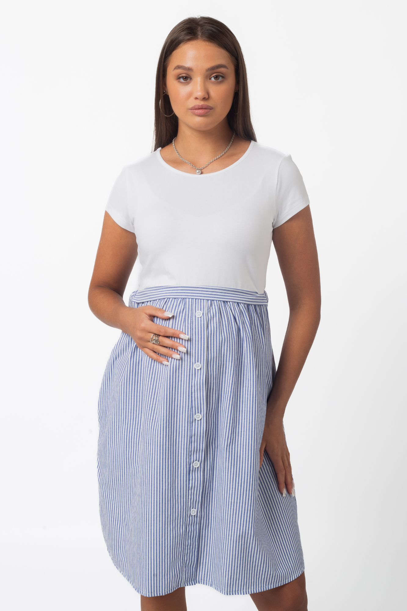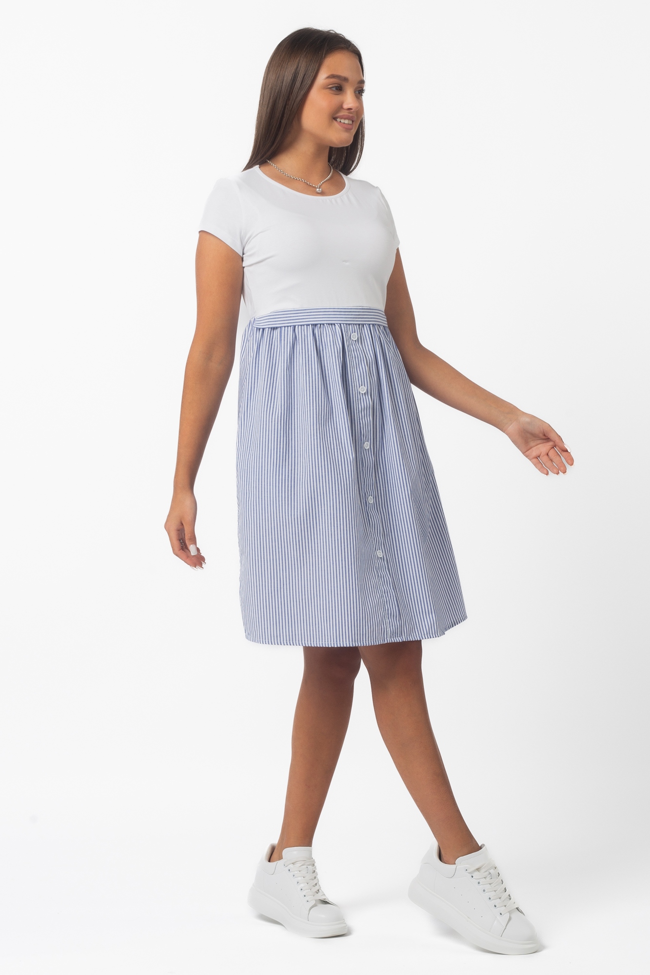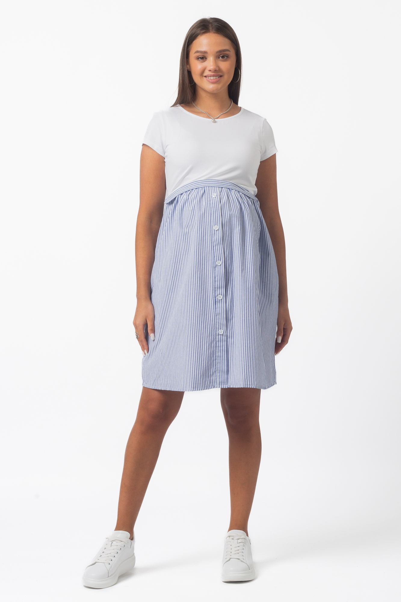 Летнее платье в стиле casual из комбинированных тканей для беременных и кормящих. Верхняя часть изделия выполнена из высококачественной кулирной глади пенье, нижняя - из хлопка. С ним не нарушается кожное дыхание, легко происходит впитывание и испарение влаги. В такой одежде вы будете чувствовать себя комфортно и легко. Детали: округлый вырез горловины, короткий рукав, практичная длина. Платье идеально подчеркивает округлившийся животик, но при этом не сковывает движений. Благодаря встречным потайным молниям под грудью Вам удастся покормить малыша с комфортом в любой ситуации. Платье прекрасно сидит на любом сроке беременности, а после родов скроет временные несовершенства фигуры.