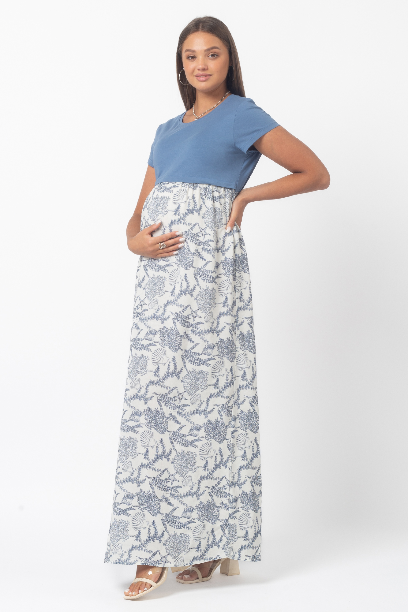 Стильное платье из комбинированных тканей для беременных и кормящих мам. Платье подходит для использования на всем протяжении беременности, а также в период грудного вскармливания. Секрет кормления – встречные потайные молнии - позволяет с комфортом покормить малыша в любой ситуации.