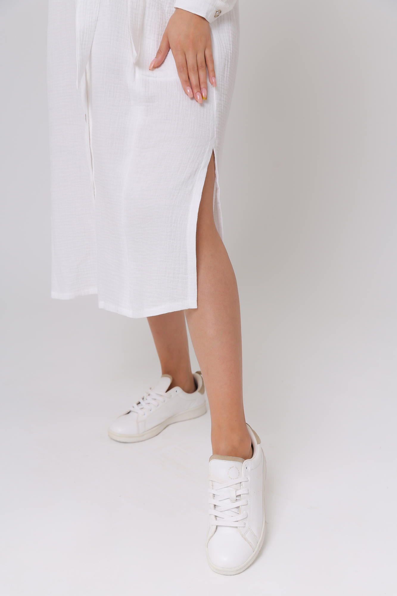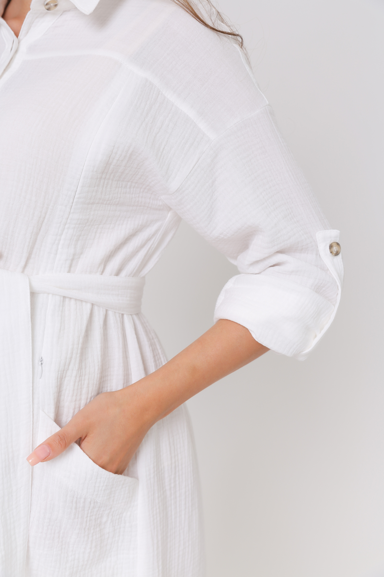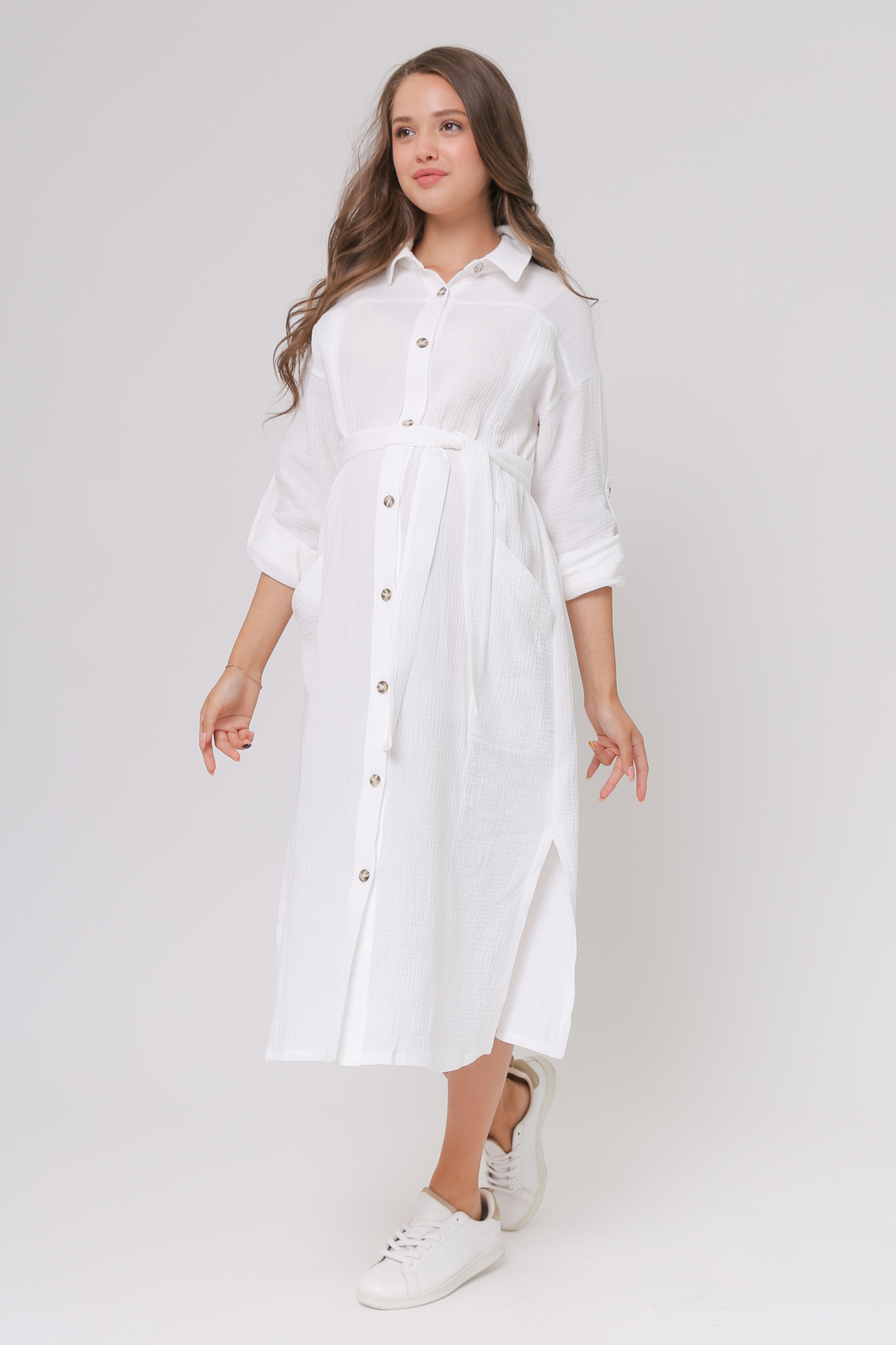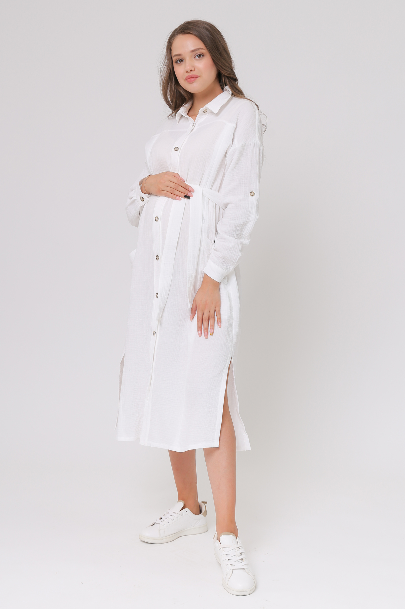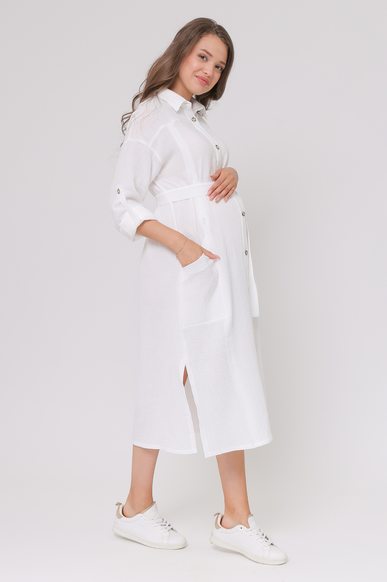 Платье рубашка для беременных из высококачественного муслина (натуральный хлопок) - идеальный повседневный вариант для теплого лета. Модель чуть приталенный крой и универсальную длину миди. Длинные рукава дополнены хлястиками для фиксации отворотов, воротник классический отложной, застежка на пуговицы, разрезы по бокам изделия. Для удобства платье дополнено боковыми карманами. Фасон сафари считается модным трендом летнего сезона; он удачно сочетается с кедами, кроссовками, классическими лодочками и босоножками. Красивое повседневное платье подойдет для офиса, деловых и дружеских встреч, посещений врача, прогулок с ребенком. В теплую погоду такую модель можно выбрать в качестве наряда на выписку. Сарафан предлагается в нескольких классических оттенках.