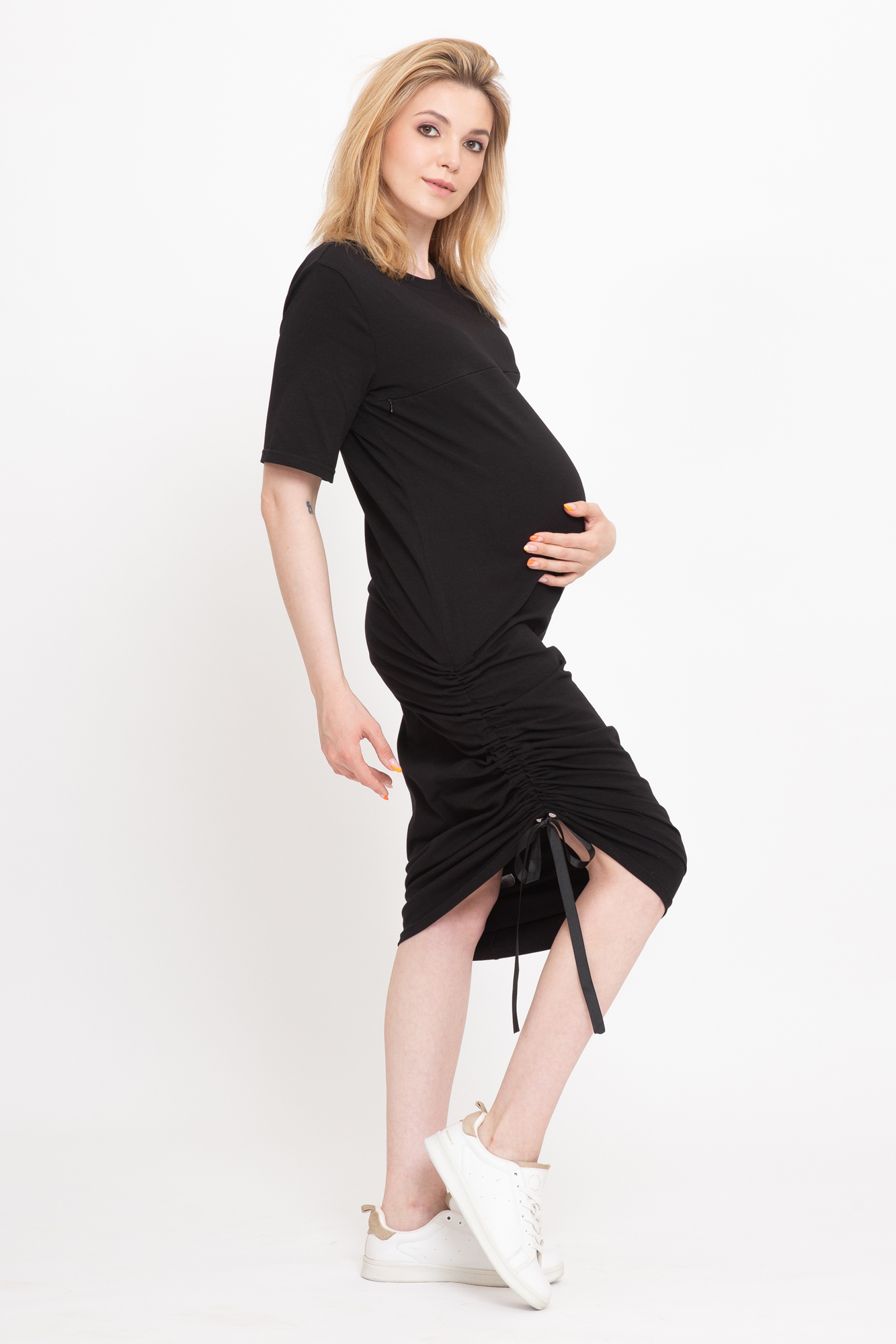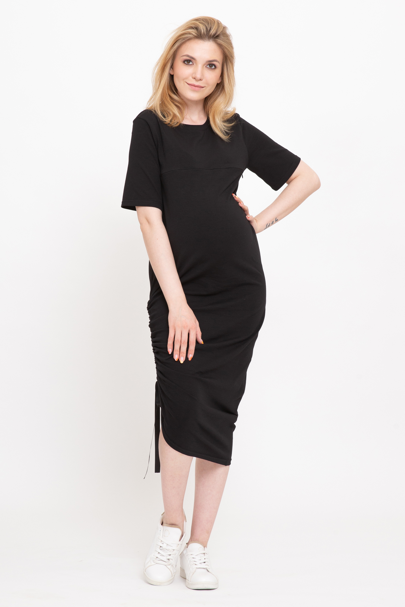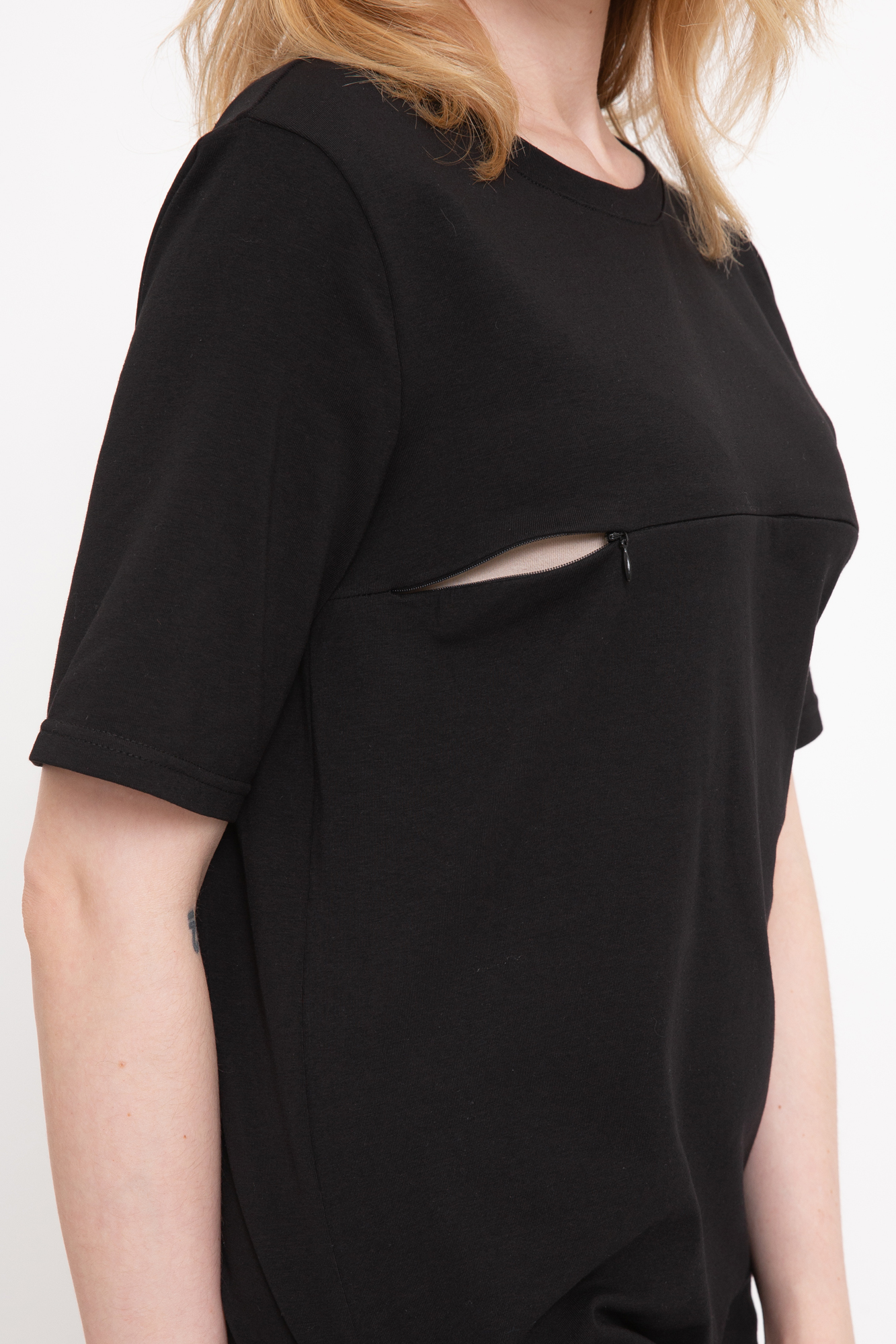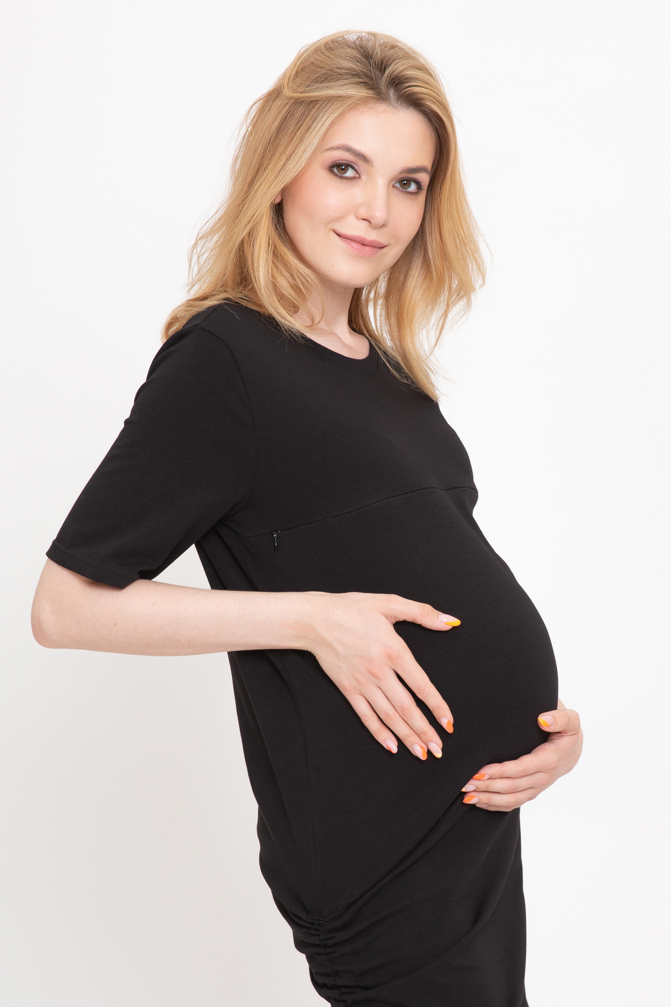 Платье-футболка для беременных и кормящих выполнено из высококачественного хлопкового полотна с добавлением эластана. Гипоаллергенный хлопок подходит абсолютно всем, с ним не нарушается кожное дыхание, легко происходит впитывание и испарение влаги. В такой одежде вы будете чувствовать себя комфортно и легко. Особый крой платья обеспечит комфорт на всем протяжении беременности, а после родов скроет временные несовершенства фигуры. Горизонтальные потайные молнии позволят покормить малыша в любой ситуации.