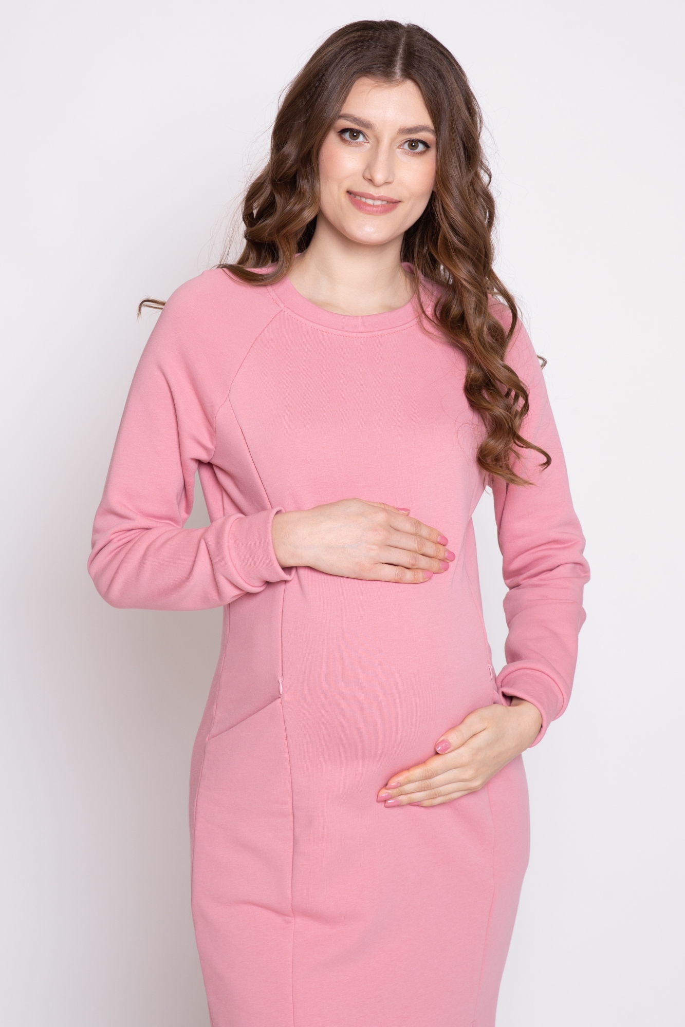 Платье в спортивном стиле для беременных и кормящих выполнено из высококачественного трехниточного футера (петля). Детали: высокий воротник-стойка, втачные карманы, на рукавах манжеты. Свободный крой платья позволяет носить его до последних сроков беременности, снизу предусмотрен разрез для удобного передвижения. Конструкция для кормления - вертикальные потайные молнии. Мягкое уютное платье на каждый день.