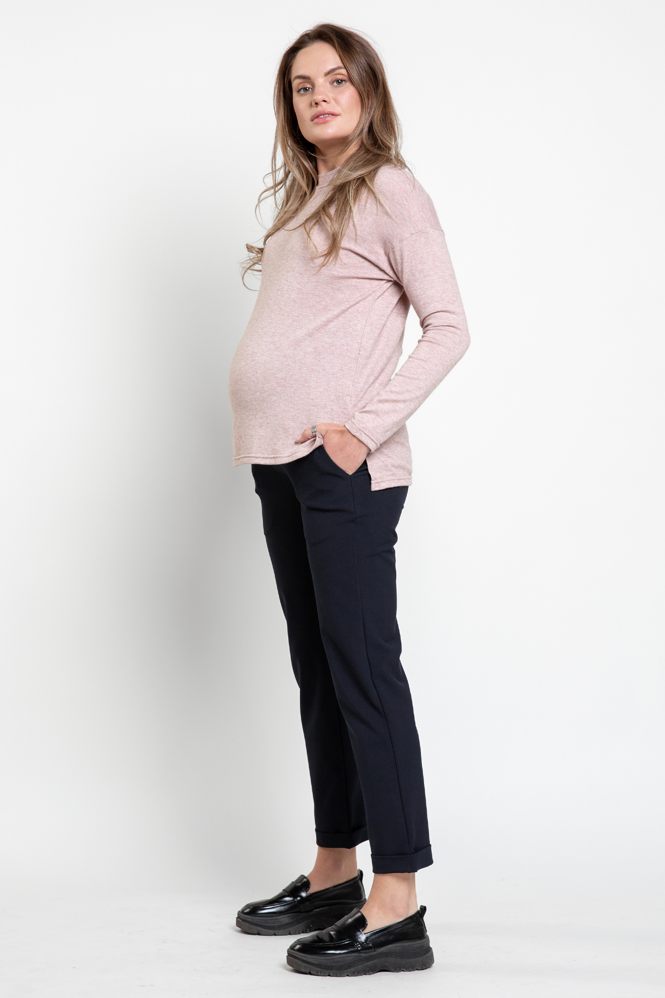 Брюки из высококачественного трикотажа для будущих мам. Детали: высокий эластичный бандаж, скошенные карманы, регулировка объема для животика осуществляется при помощи резинки, продетой в пояс брюк. В зависимости от подобранных дополнений они могут стать частью и офисного костюма, и одежды для непринуждённого отдыха, и наряда для торжественного события.
