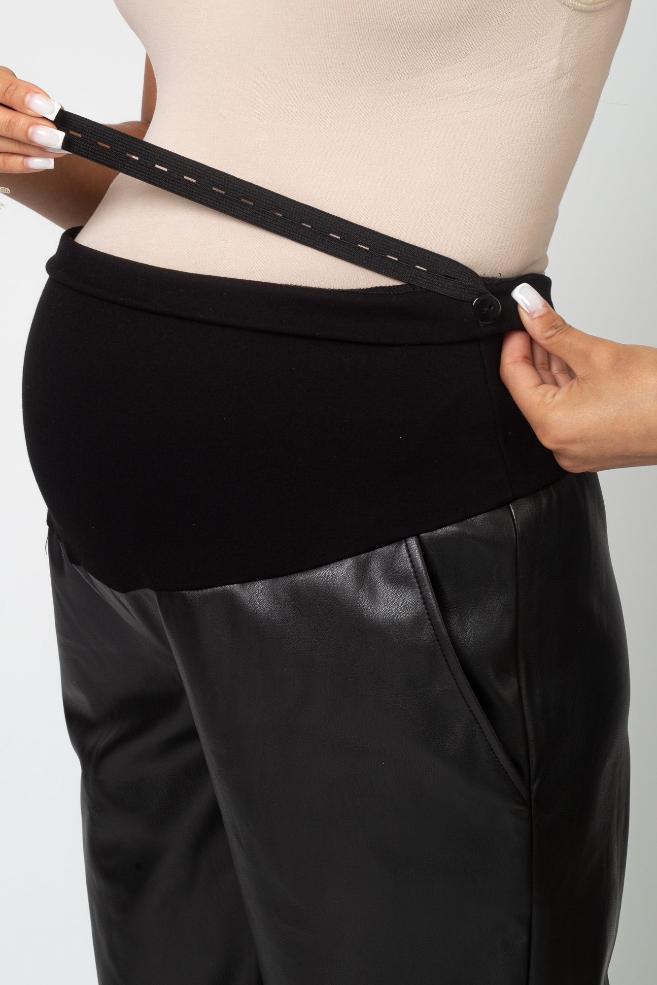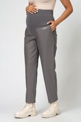 Стильные брюки для беременных из качественной экокожи с эффектной полуматовой фактурой отлично впишутся в гардероб современной будущей мамы. Фасон модели бананы гармонично смотрится на любой фигуре, а высокая посадка с эластичным поясом обеспечивают комфорт на любом месяце беременности. Брюки для беременных из экокожи подойдут для повседневной носки, гармонично впишутся в классический офисный образ, дополнят городской casual look, а при наличии пары ярких аксессуаров вполне может стать частью выходного наряда.