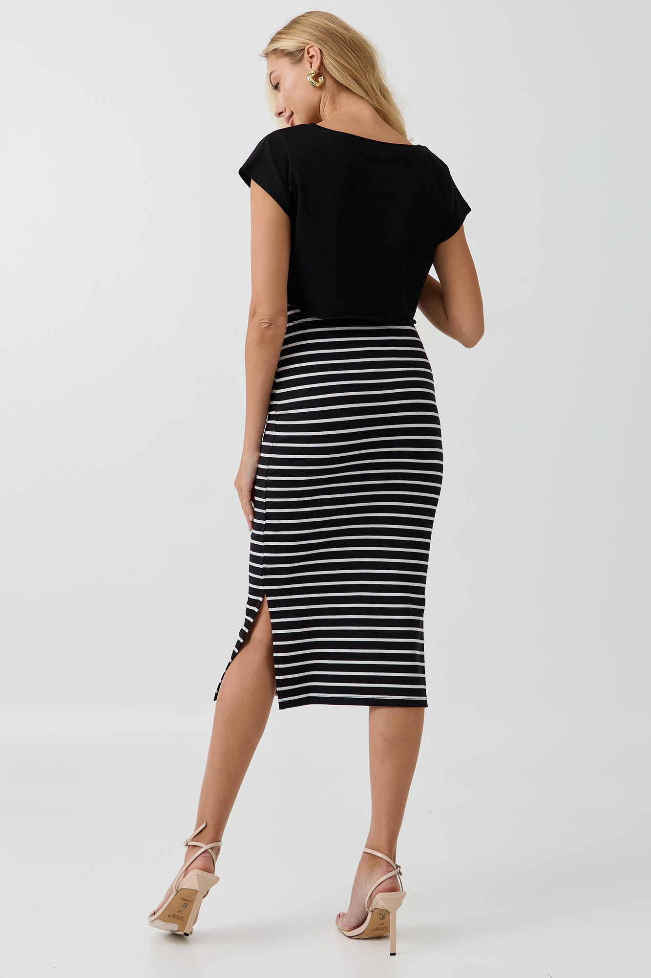 Стильный комплект для беременных состоит из футболки и трикотажной юбки. Футболка-топ с завязками выполнена из хлопка с добавлением эластана. С ним не нарушается кожное дыхание, легко происходит впитывание и испарение влаги. В такой одежде вы будете чувствовать себя комфортно и легко. Особый крой позволяет носить изделие на всем протяжении беременности. Эластичная юбка с завышенной талией мягко облегает и не сдавливает живот. Разрезы по бокам изделия обеспечат свободу движений. Футболку и юбку можно носить как вместе, так и сочетать с другими элементами гардероба.