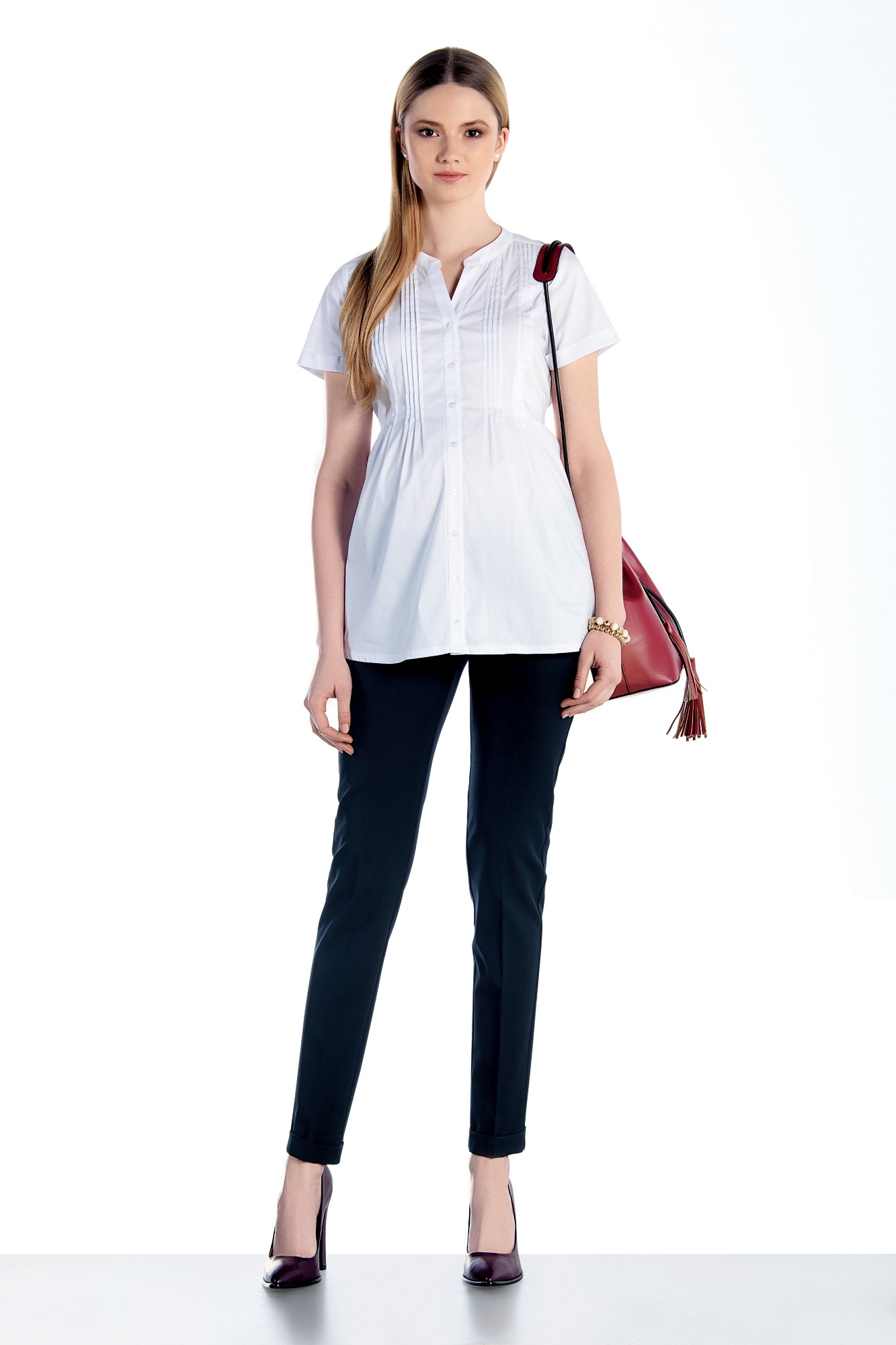 Легкая блузка для беременных, изготовлена из тонкого, приятного к телу материала, с высоким содержанием хлопка. Модель трапециевидного силуэта, с коротким рукавом, округлым вырезом горловины. Универсальный фасон обеспечивает комфорт в период беременности, после рождения малыша скрывает временные несовершенства фигуры. На спинке блузка стягивается пояском.
