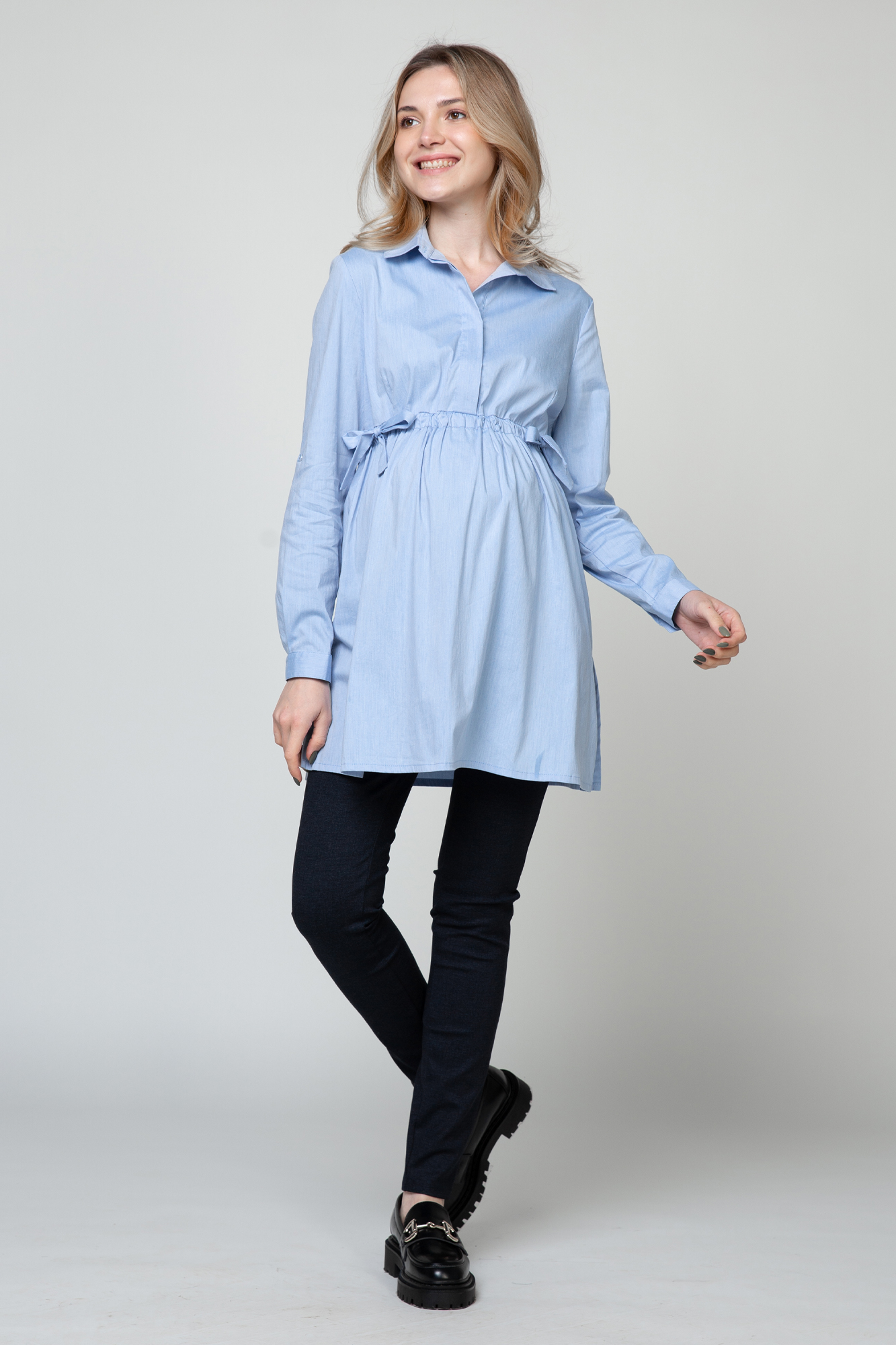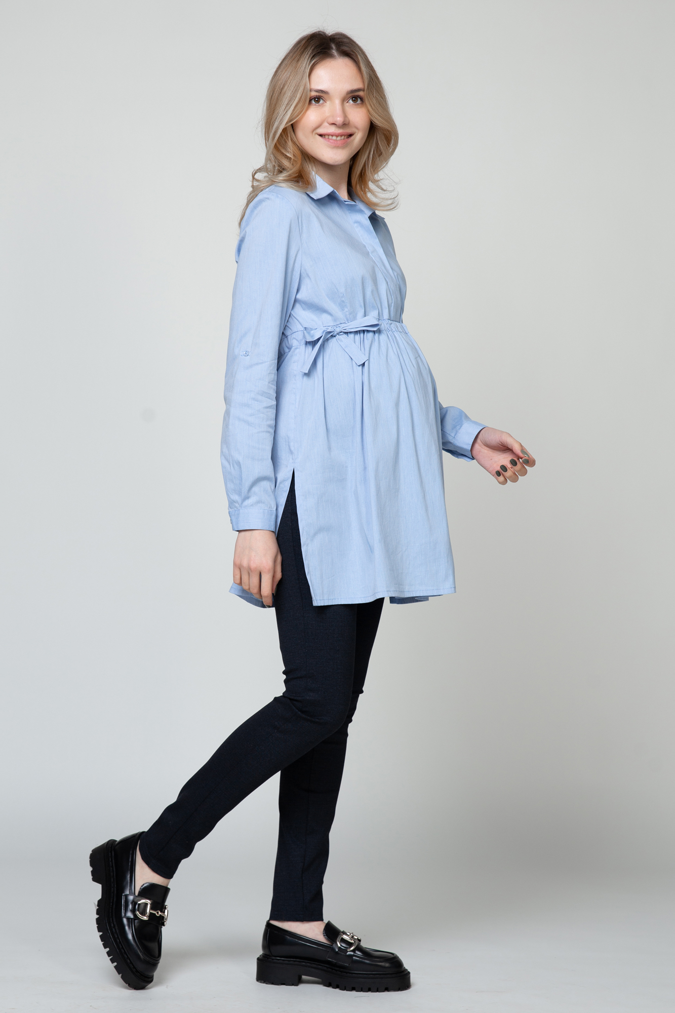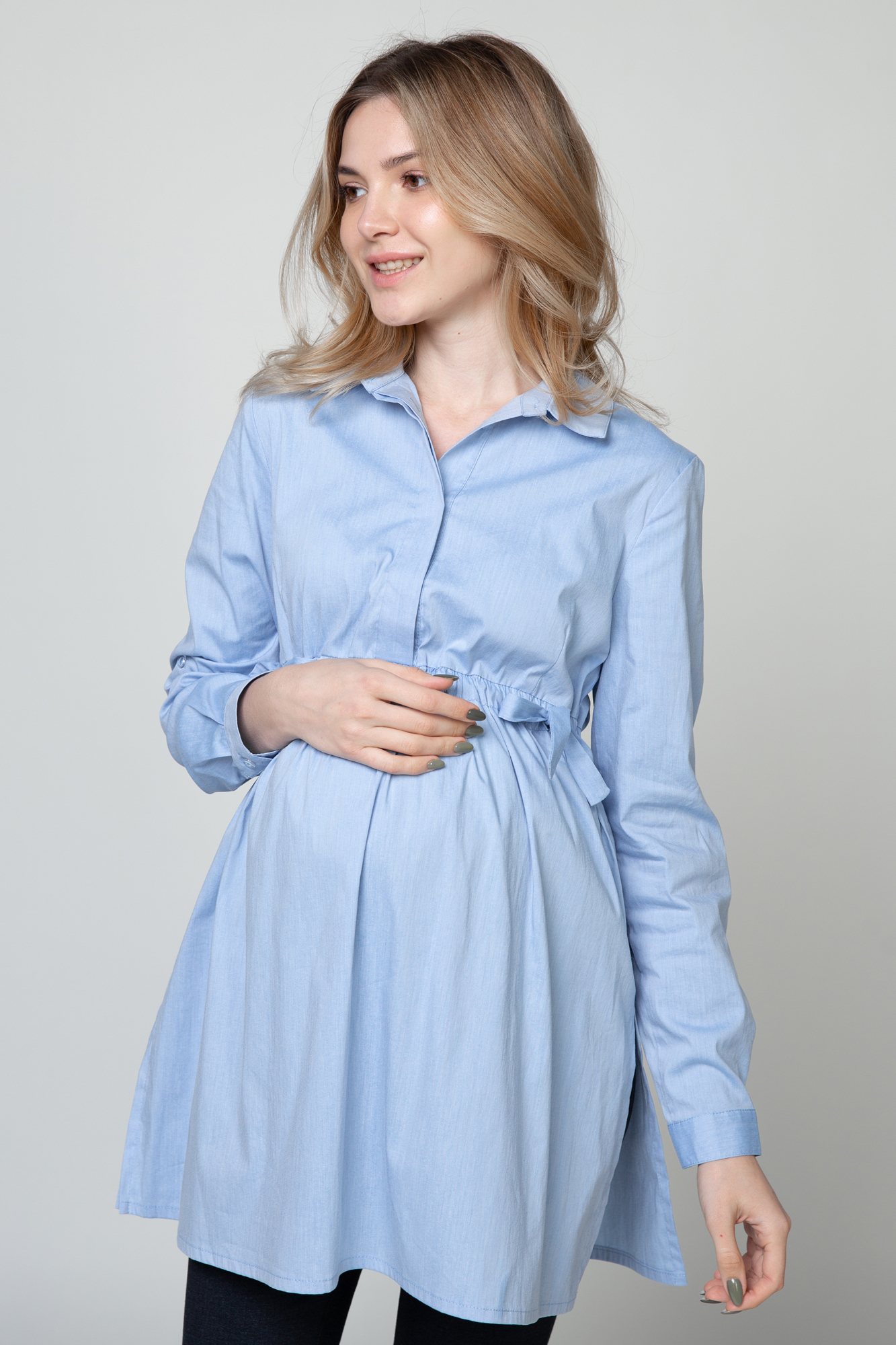 Удлиненная блузка для будущих мам. У модели отложной воротник, застежка на пуговицы, разрезы по бокам. Длинные рукава подворачиваются и фиксируются застежкой на пуговицу. Приталенный силуэт достигается за счет кулисок под грудью. Особый крой позволяет носить изделие на всем протяжении беременности, а после родов скроет временные несовершенства фигуры. Великолепный вариант для работы в офисе, встреч с друзьями и просто на каждый день.