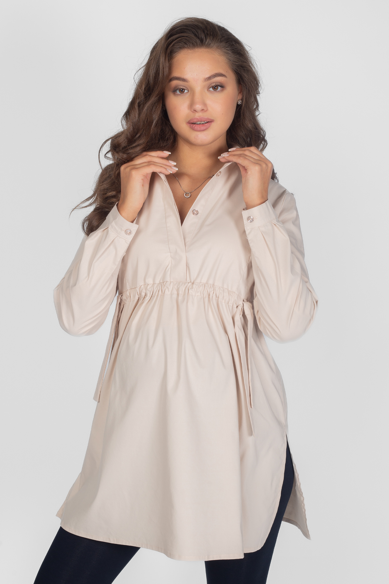 Удлиненная блузка для будущих мам. У модели отложной воротник, застежка на пуговицы, разрезы по бокам. Длинные рукава подворачиваются и фиксируются застежкой на пуговицу. Приталенный силуэт достигается за счет кулисок под грудью. Особый крой позволяет носить изделие на всем протяжении беременности, а после родов скроет временные несовершенства фигуры. Великолепный вариант для работы в офисе, встреч с друзьями и просто на каждый день.