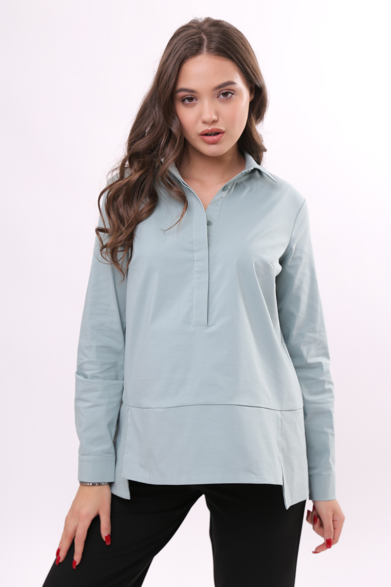 Стильная рубашка для беременных выполнена из высококачественного хлопкового полотна. С ним не нарушается кожное дыхание, легко происходит впитывание и испарение влаги. В такой одежде вы будете чувствовать себя комфортно и легко. Особый крой позволяет носить изделие на всем протяжении беременности, а после родов скроет временные несовершенства фигуры. Модель свободного силуэта, с отложным воротником, скрытой застежкой на пуговицы, длинным рукавом на манжете, асимметричным низом, разрезами по бокам изделия. Легко комбинируется с джинсами, брюками, юбками. Отличный вариант для будущих мам, работающих в офисе.