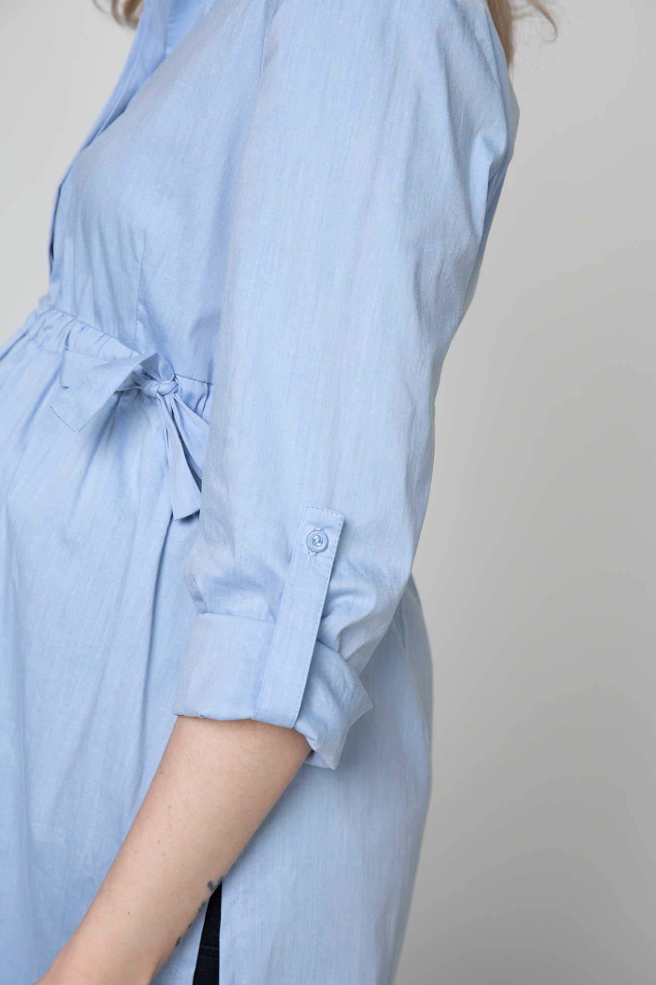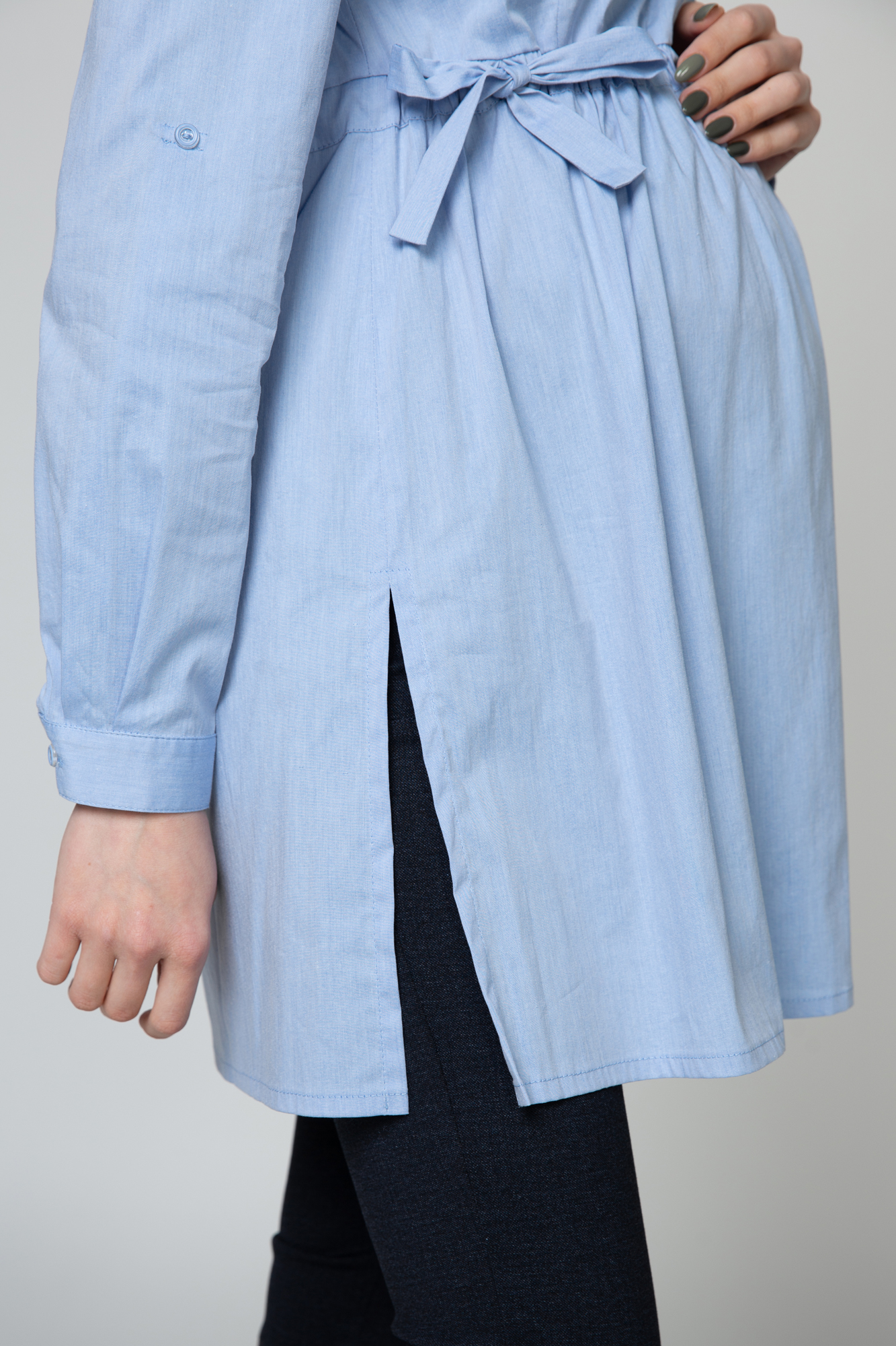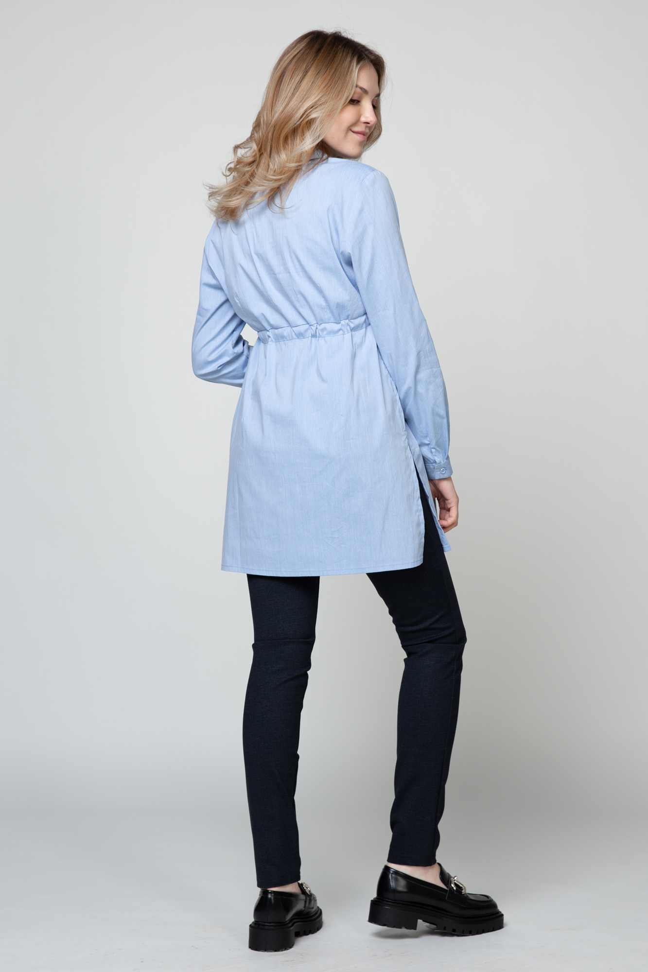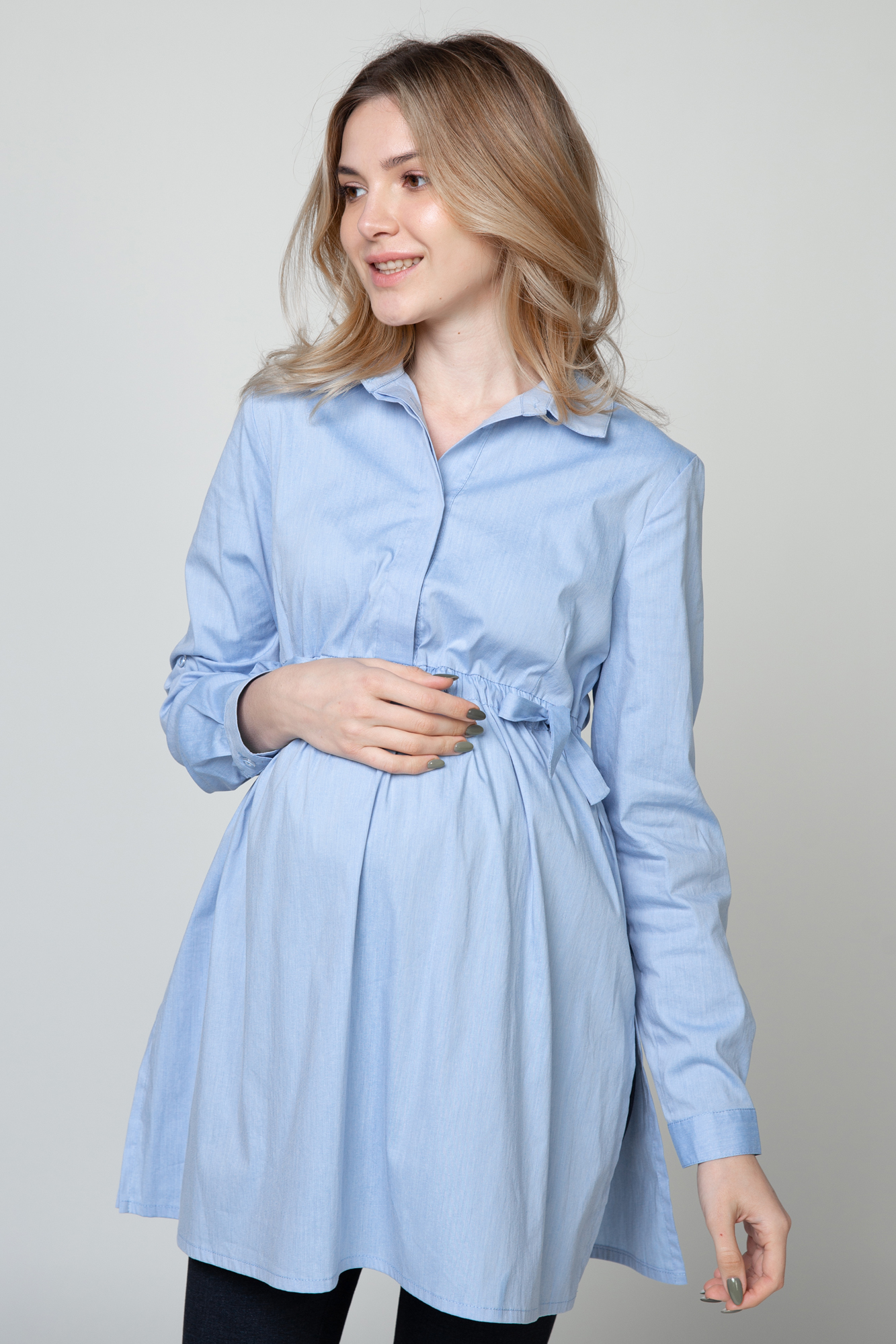 Удлиненная блузка для будущих мам. У модели отложной воротник, застежка на пуговицы, разрезы по бокам. Длинные рукава подворачиваются и фиксируются застежкой на пуговицу. Приталенный силуэт достигается за счет кулисок под грудью. Особый крой позволяет носить изделие на всем протяжении беременности, а после родов скроет временные несовершенства фигуры. Великолепный вариант для работы в офисе, встреч с друзьями и просто на каждый день.