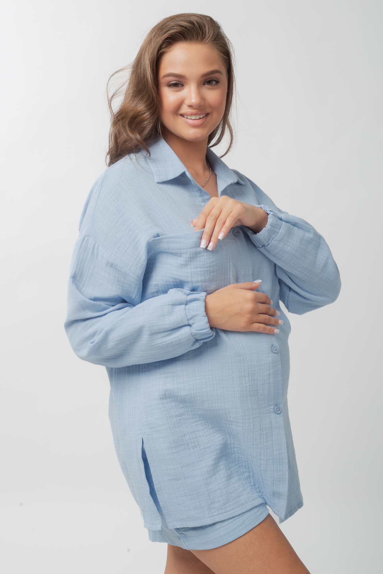Свободная блузка для беременных выполнена из качественного хлопкового муслина. Легкая мягкая ткань приятно прилегает к коже, не мнется и не вызывает раздражения. Рубашка прямого кроя, с легким эффектом оверсайз, длинными рукавами и классическим отложным воротником. На рукавах предусмотрены манжеты на мягкой резинке. На груди один накладной карман, по бокам два выреза. Оптимальная длина рубашки позволяет будущей маме чувствовать себя комфортно на любом месяце беременности. Блуза застегивается на пуговицы, что удобно для кормления ребенка вне дома. Базовая женская рубашка идеально впишется в повседневный и офисный стили, подойдет для деловых и неофициальных встреч.