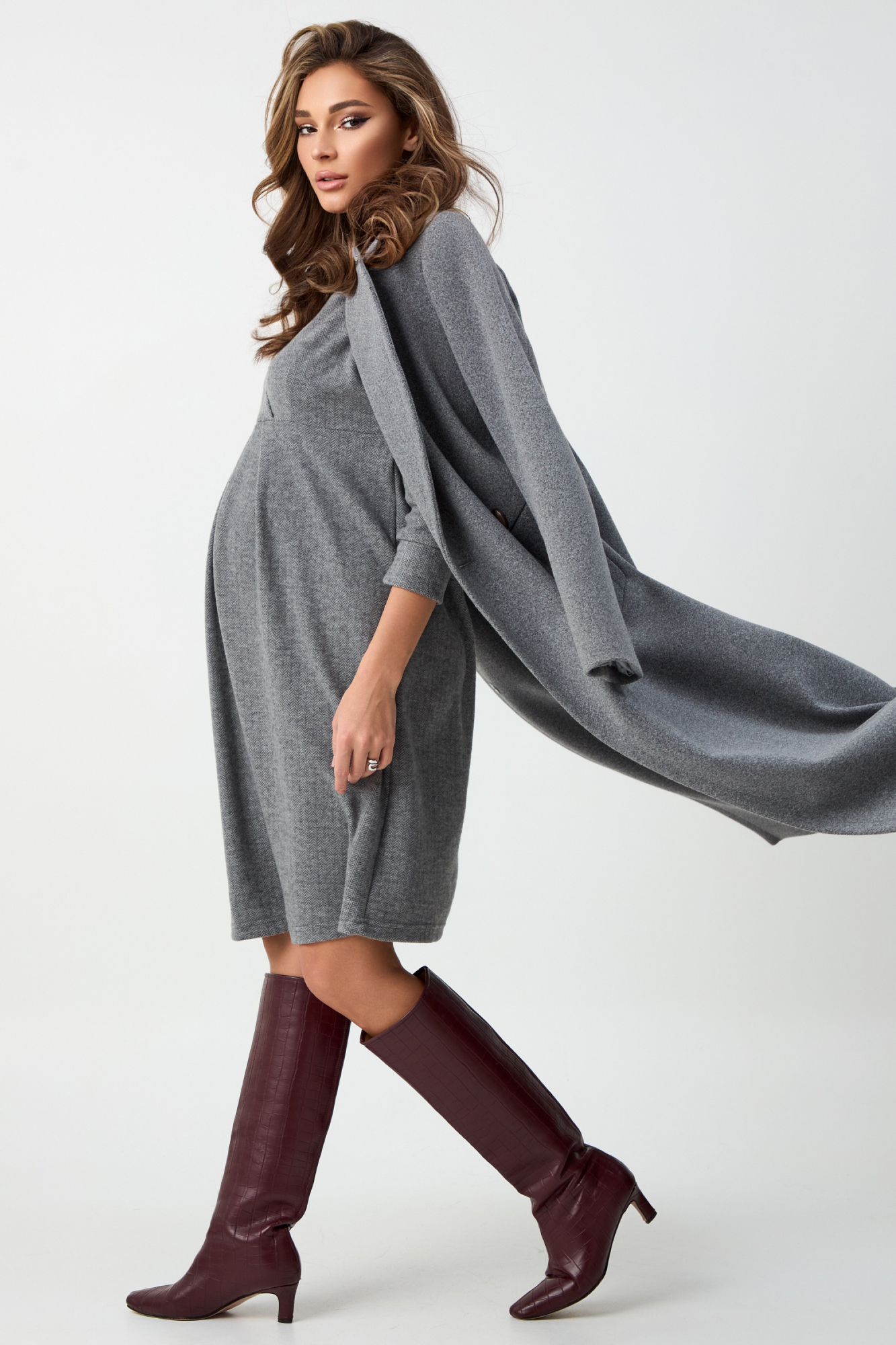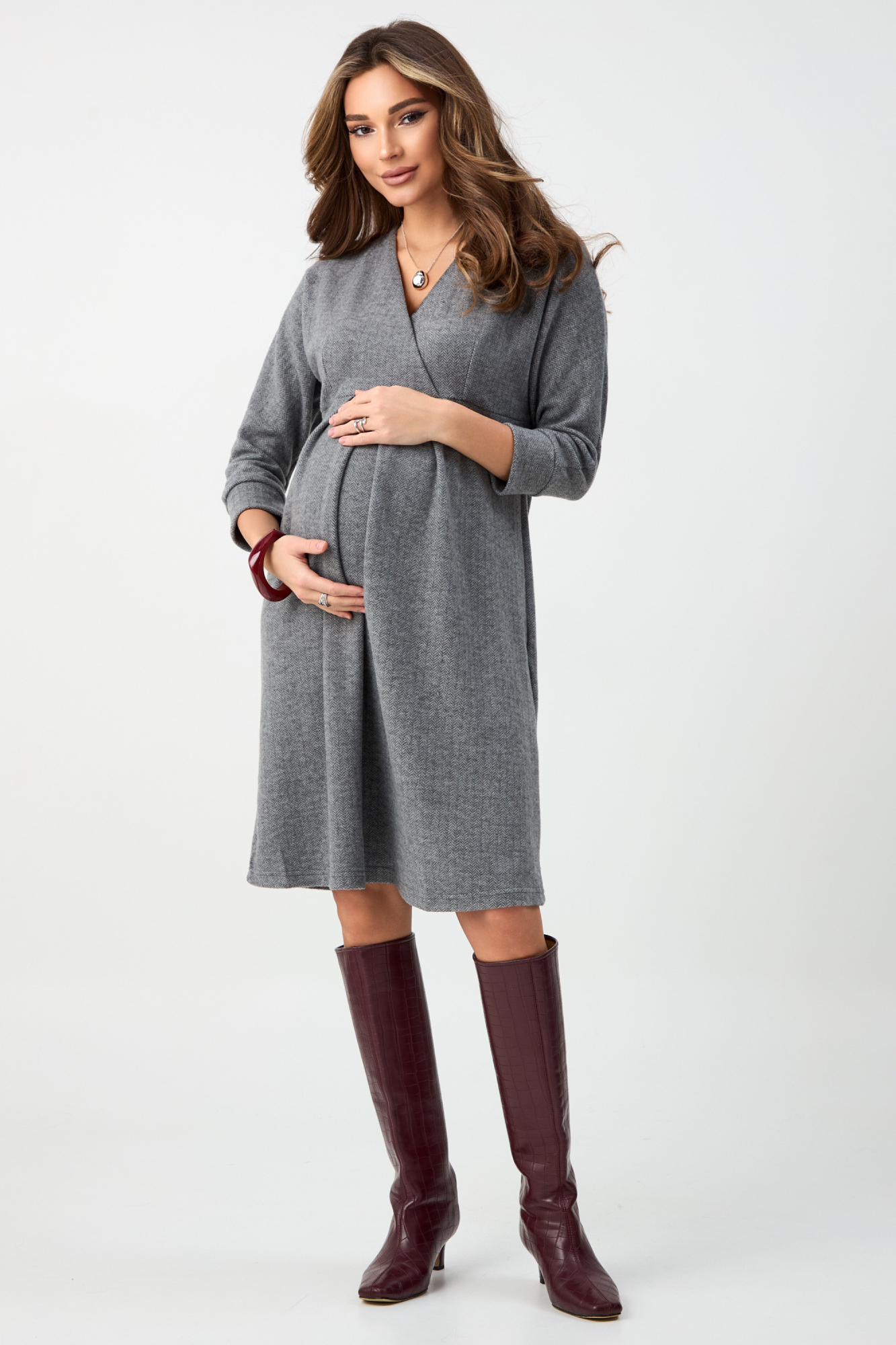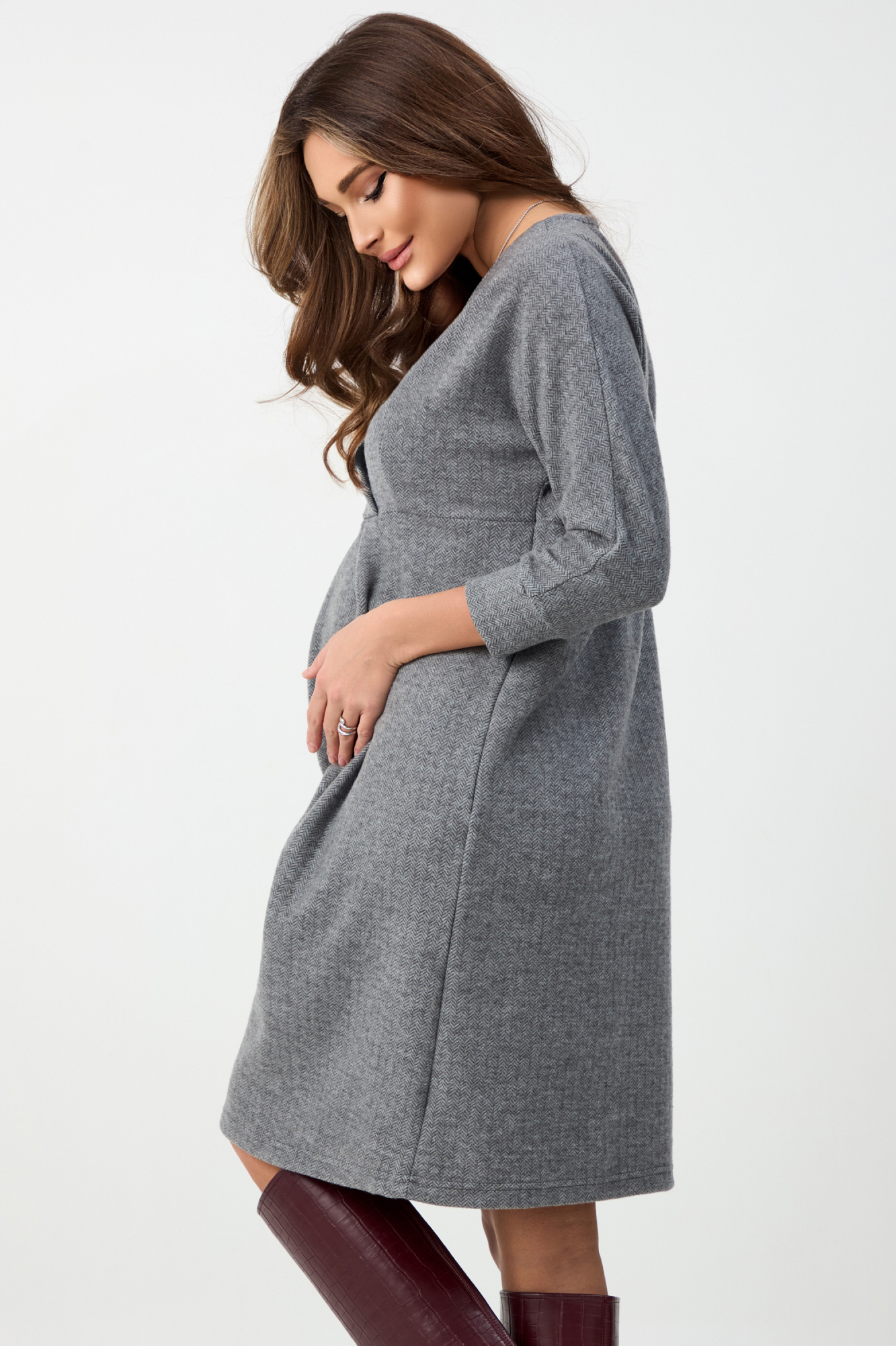 Стильное платье для беременных. Выполнено из теплой мягкой трикотажной ткани с принтом елочка, идеально в период прохладной погоды. Платье миди на запах, с рукавом 3/4. Встречная складка на живот создает необходимый объем для изменяющейся фигуры. Идеальная посадка на любом сроке беременности и после нее. Универсальное платье подойдет для офиса, деловых встреч, прогуок с друзьями и просто на каждй день. Если дополнить образ необходимыми аксессуарами - подойдет для торжественного события. Базовая модель займет достойное место в гардеробе будущей мамы.
