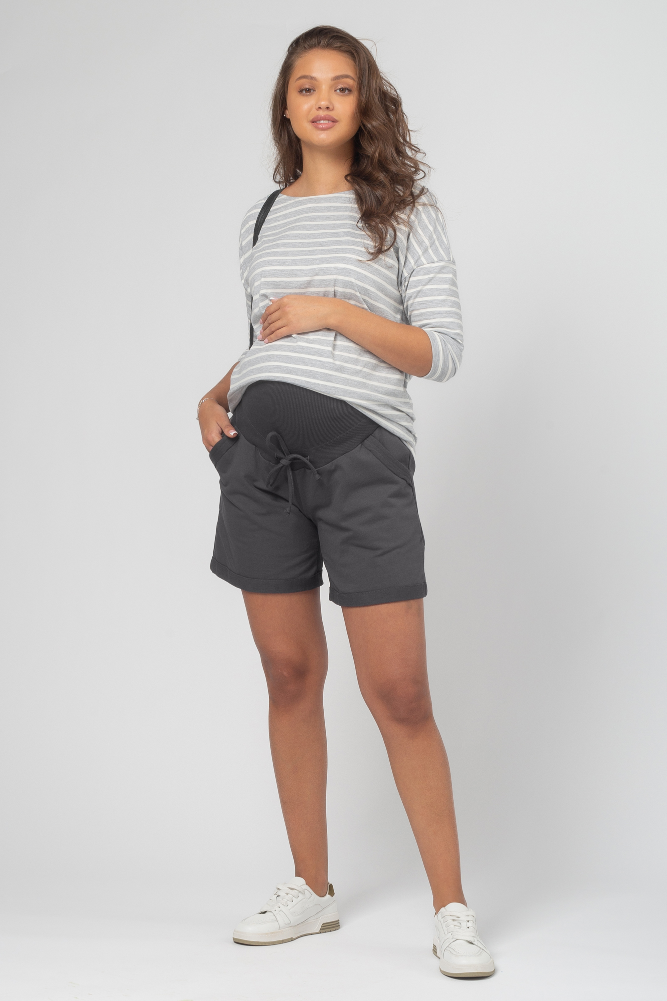 Стильные шорты из футера для беременных. Высокий эластичный бандаж мягко и деликатно поддерживает растущий животик. Объем регулируется шнурками в поясе и перфорированной резинкой, перестегивающейся на пуговицу, что позволяет носить брюки от начала до конца беременности и после родов. Невероятно комфортная модель для прогулок, занятий спортом и просто на каждый день.