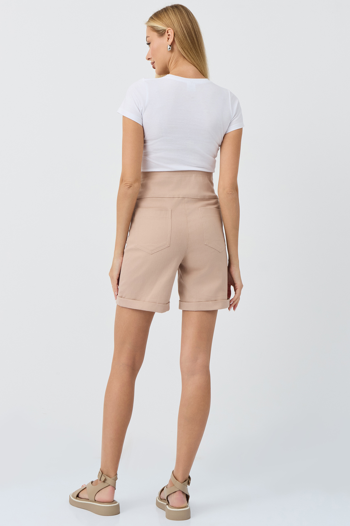 Шорты для беременных выполнены из твила, премиальной дышащей ткани на основе натурального хлопка. Материал приятен на ощупь, износостоек, не вытягивается и не дает усадки при стирке. Крой шорт свободный и прямой, универсален для обладательниц любого типа фигуры. Высокий эластичный бандаж мягко и деликатно поддерживает растущий животик. Для регулировки объема предусмотрена перфорированная резинка, перестегивающаяся на пуговицу, продетая в пояс изделия. Для удобства будущей мамы в модели предусмотрены вместительные прорезные карманы. Такие шорты подойдут для повседневной носки летом. Короткие шорты с высокой посадкой подходят девушка и женщинам больших размеров. Удобные, легкие, практичные, они выполнены в однотонных базовых расцветках. Шорты для беременных летние - отличный выбор для будущих мам на жаркое лето.