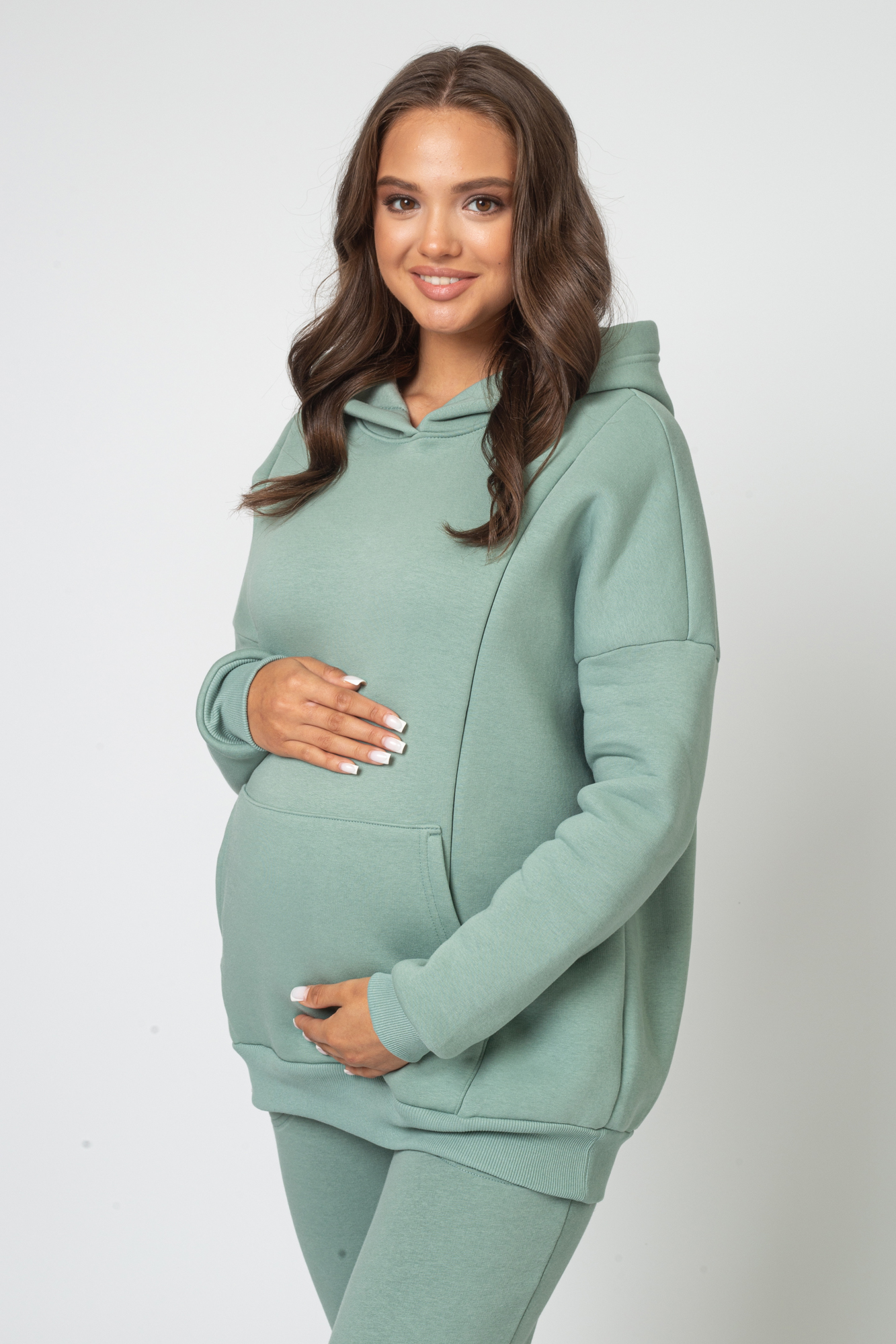 Утепленный спортивный костюм для беременных и кормящих выполнен из высококачественного трехниточного футера с начесом. Стильное теплое худи для будущих мам согреет в прохладную погоду. Особый крой позволяет носить изделие на всем протяжении беременности и после нее. Благодаря диагональным потайным молниям Вы сможете покормить малыша с комфортом в любой ситуации. Брюки с эластичным поясом рассчитаны на любой срок беременности, не сдавливают и поддерживают растущий животик. Объем регулируется с помощью перфорированной резинки, перестегивающейся на пуговицу, продетой в пояс брюк. Костюм подходит для спорта, для прогулок и просто в качестве домашней одежды.