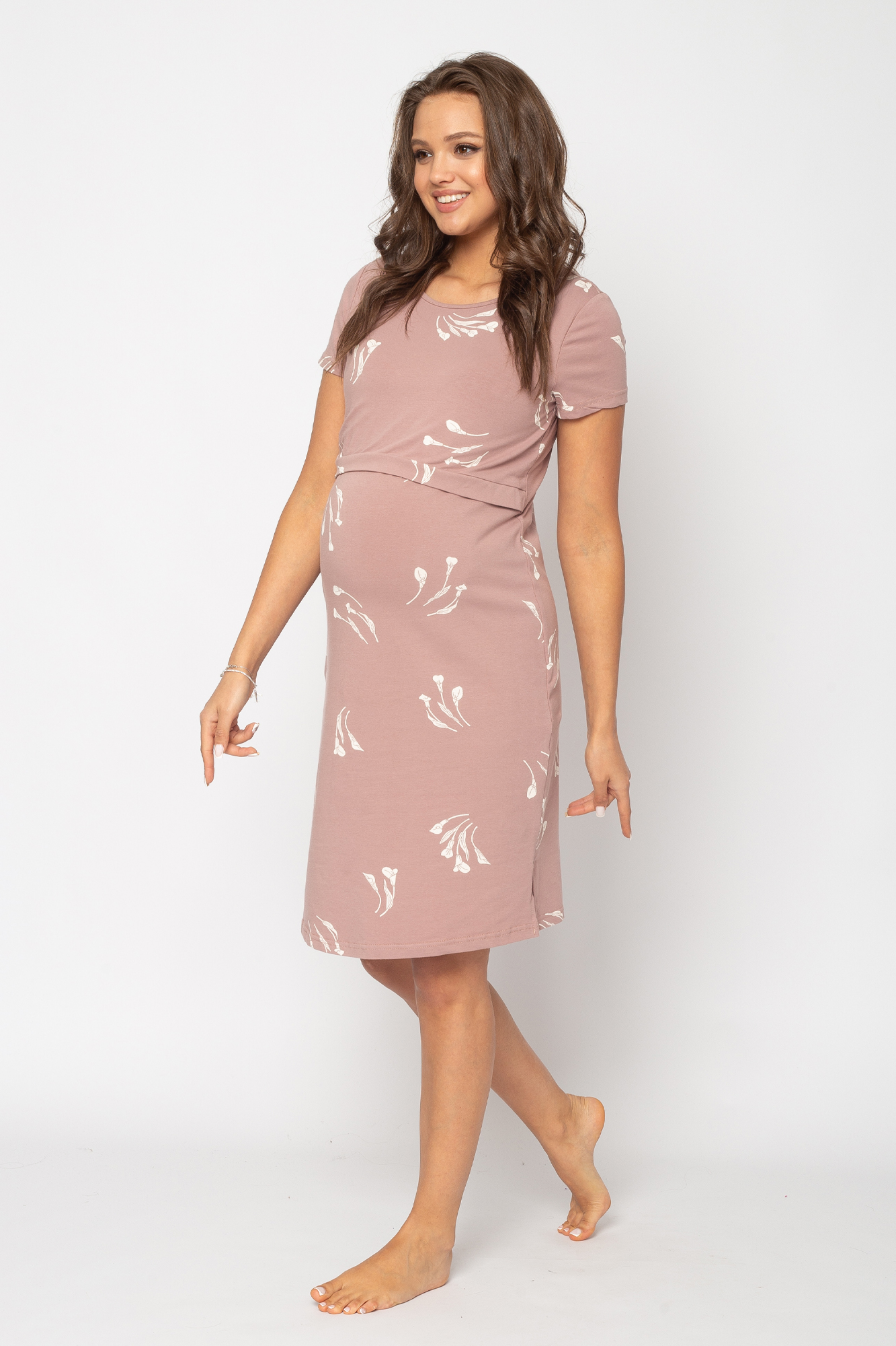 Ночная сорочка с коротким рукавом для беременных и кормящих мам выполнена из мягкого хлопкового трикотажа. Специальная конструкция обеспечивает максимальный доступ к груди во время кормления. Универсальный крой: идеальная посадка на любом сроке беременности и после родов.