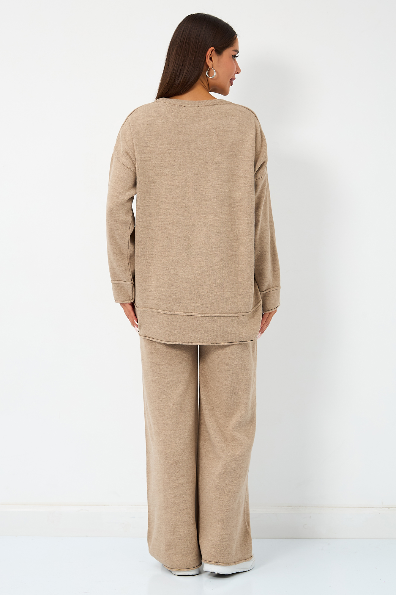 Теплый вязаный костюм для беременных. Модель выполнена из мягкого полотна мелкой вязки с добавлением акрила и шерсти. Костюм состоит из двух вещей. Джемпер прекрасно садится на фигуру будущей мамы, не обтягивая животик. Дополнен декоративными элементами в виде закрученного края и оригинальной вязки. Широкие штаны палаццо оснащены эластичной мягкой резинкой, которая не давит на животик. Брюки дополнены карманами спереди. Данная модель идеально садится на животик с первых месяцев и до последнего. За счет удобной резинки костюм можно будет носить и после рождения малыша. Такой костюм можно носить в офис, на прогулку, на мероприятия. Свободный крой оверсайз обеспечивает комфорт и удобство на протяжении всего срока беременности. Идеальная модель на весну или прохладное лето.