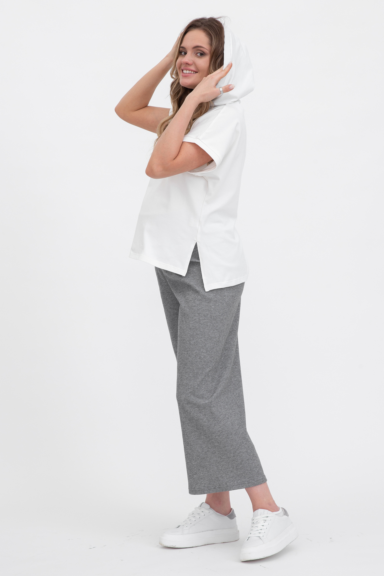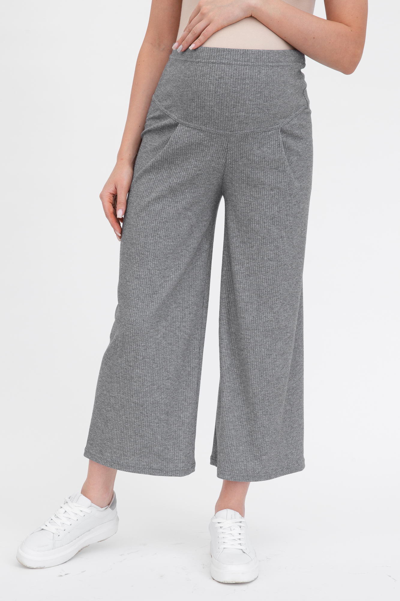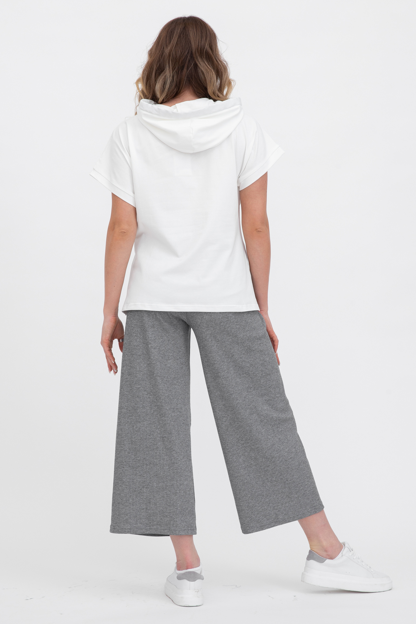 Оригинальный костюм из комбинированых тканей для беременных и кормящих. Костюм состоит из джемпера и брюк. Джемпер с капюшоном, коротким рукавом, разрезами по бокам изделия. Выполнен из высококачественного двухниточного футера. Конструкция для кормления - горизонтальные потайные молнии - позволит покормить малыша с комфортом в любой ситуации. Брюки-кюлоты в рубчик с эластичной высокой вставкой-бандажом рассчитаны на весь период беременности. Объем регулируется с помощью перфорированной резинки, перестегивающейся на пуговицу. Идеальное сочетание стиля и комфорта.