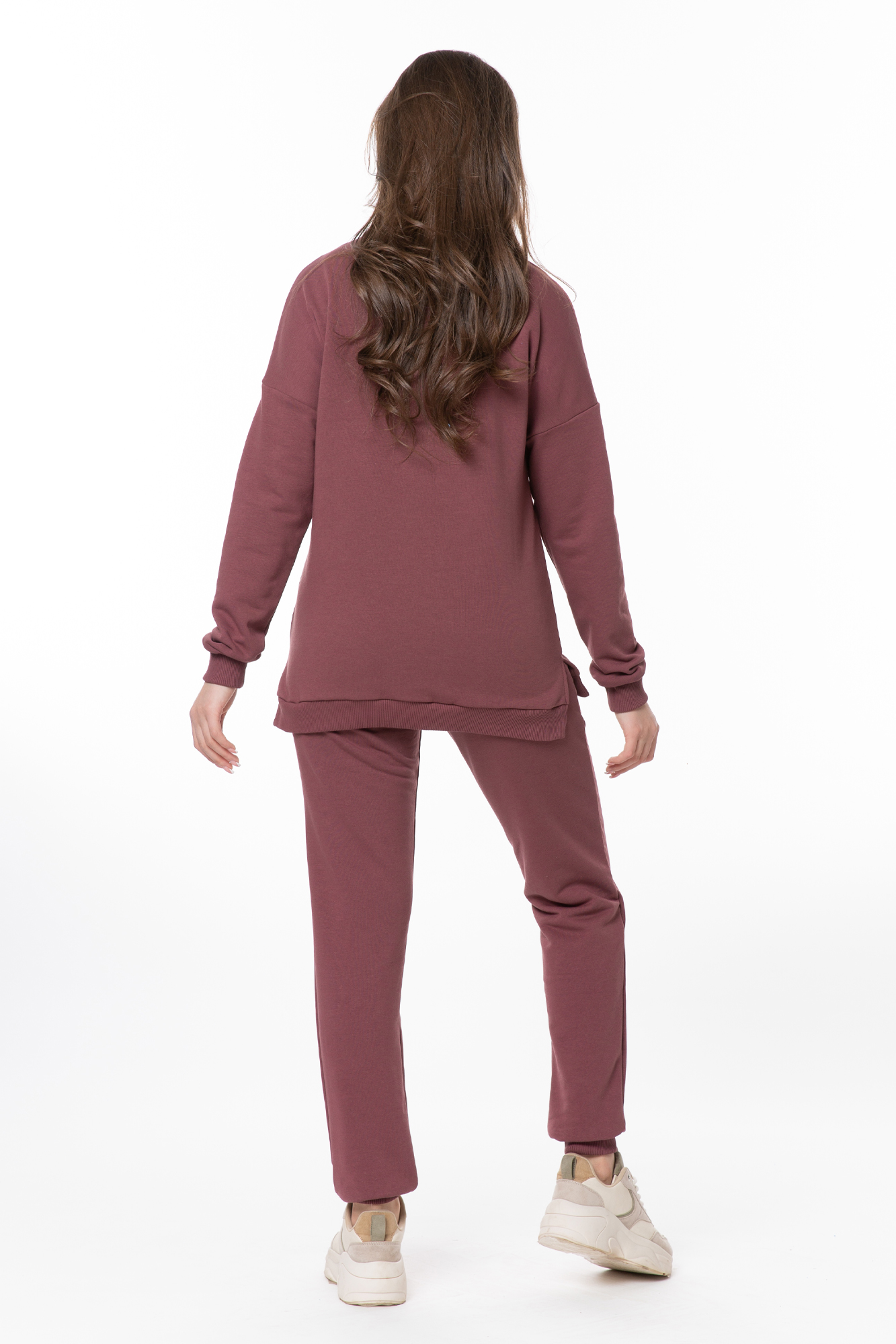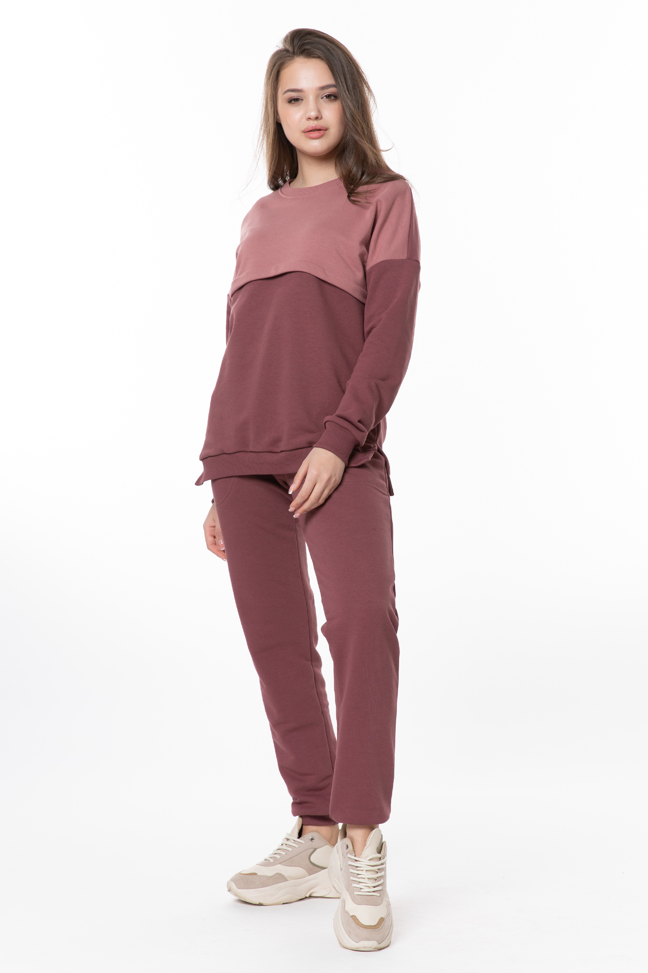 Спортивный костюм из высококачественного трехниточного футера (петля). Свитшот имеет «секрет» кормления – встречные горизонтальные потайные молнии – позволит покормить малыша с повышенным комфортом в любой ситуации. Округлый вырез горловины, удлиненная линия плеча, манжет по низу изделия и на рукавах. Брюки с высокой трикотажной вставкой предназначены для ношения в период беременности и после родов. Объем регулируется при помощи перфорированной резинки, перестегивающейся на пуговицу, продетой в пояс брюк. Костюм подойдет для прогулок, занятий спортом и в качестве домашней одежды.