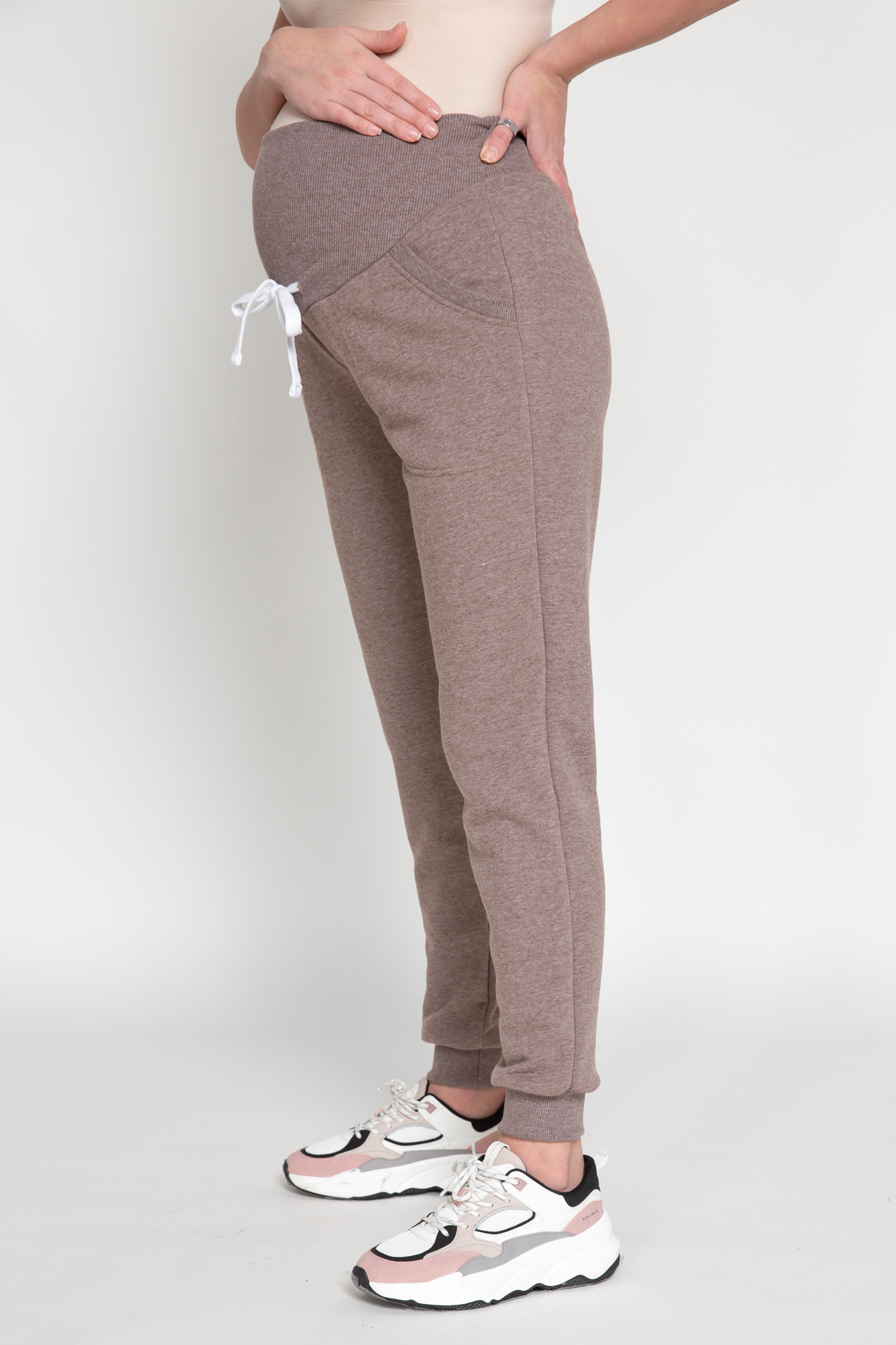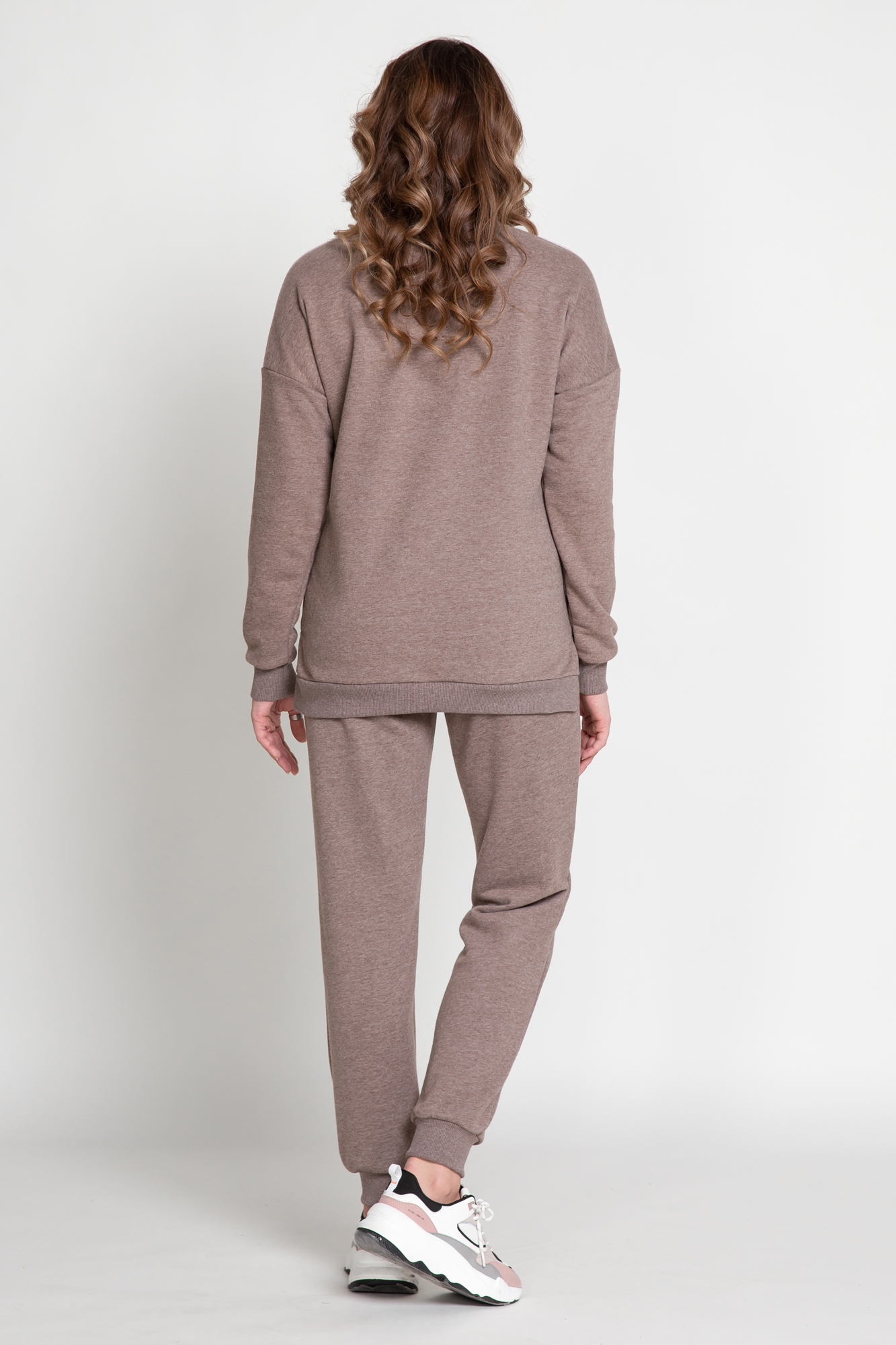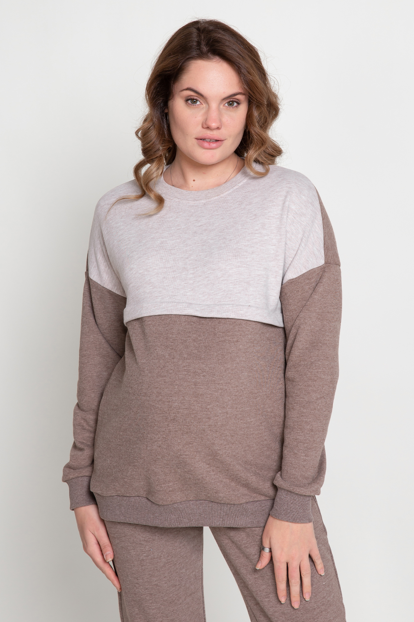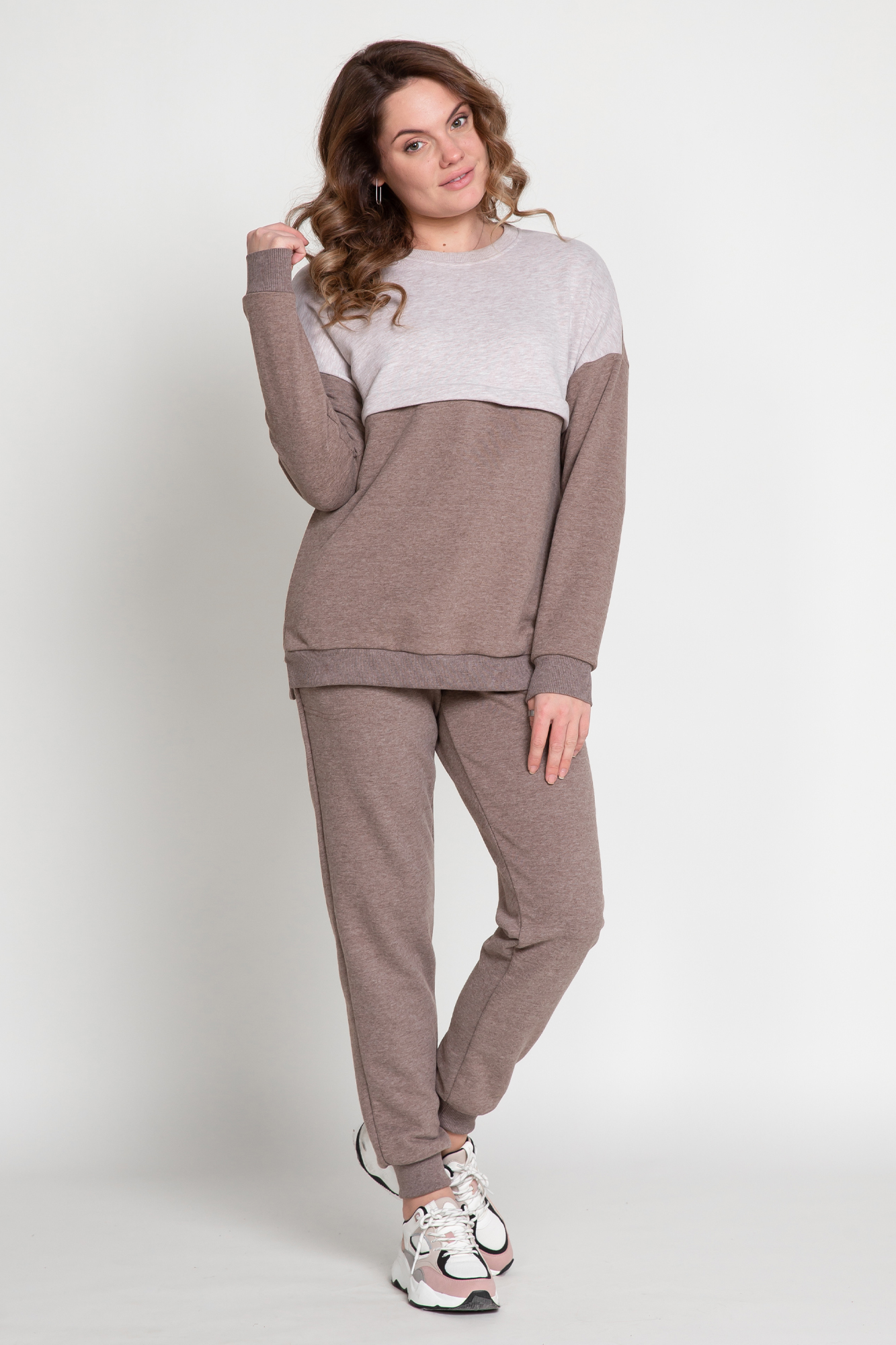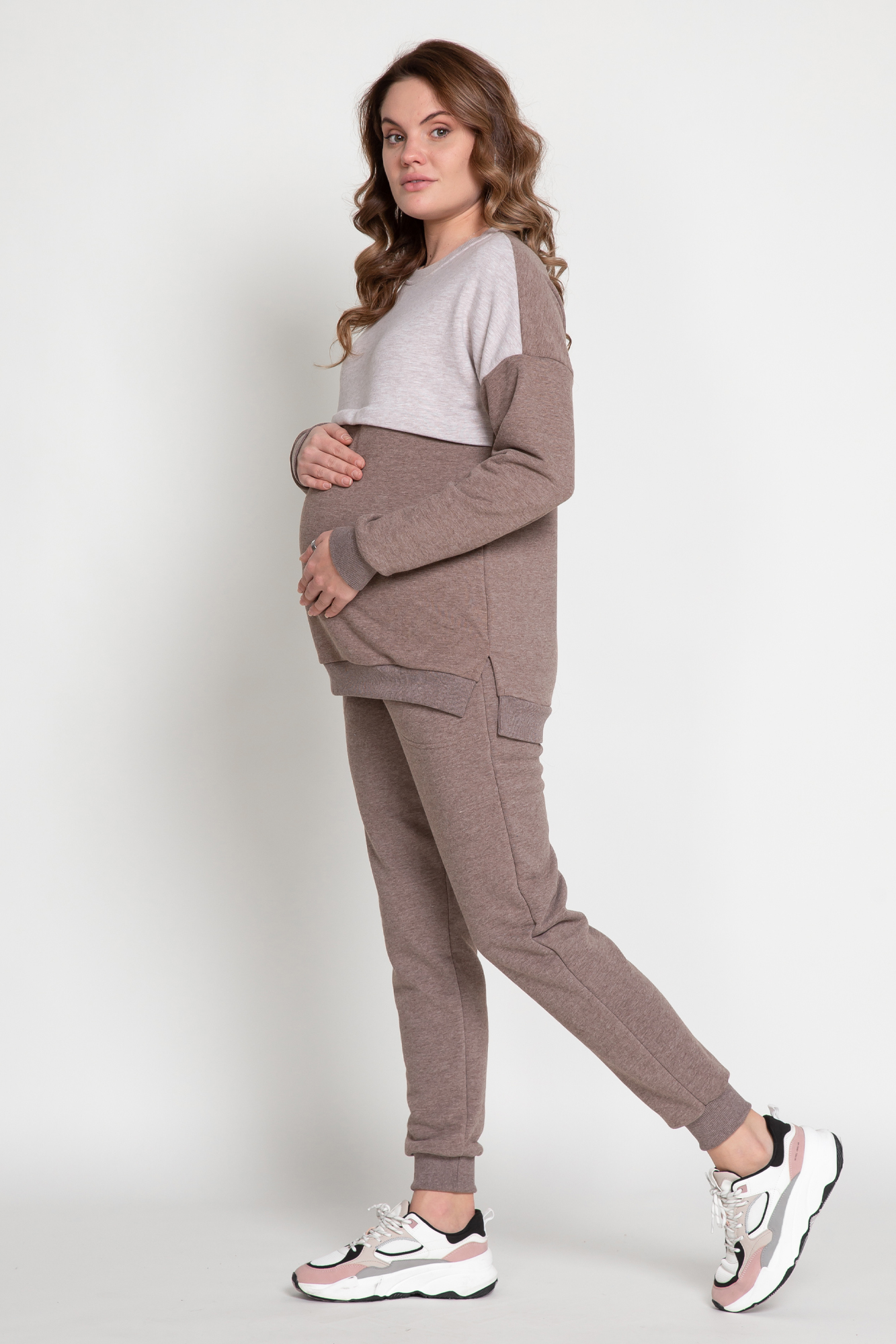 Спортивный костюм из высококачественного трехниточного футера (петля). Свитшот имеет «секрет» кормления – встречные горизонтальные потайные молнии – позволит покормить малыша с повышенным комфортом в любой ситуации. Округлый вырез горловины, удлиненная линия плеча, манжет по низу изделия и на рукавах. Брюки с высокой трикотажной вставкой предназначены для ношения в период беременности и после родов. Объем регулируется при помощи перфорированной резинки, перестегивающейся на пуговицу, продетой в пояс брюк. Костюм подойдет для прогулок, занятий спортом и в качестве домашней одежды.