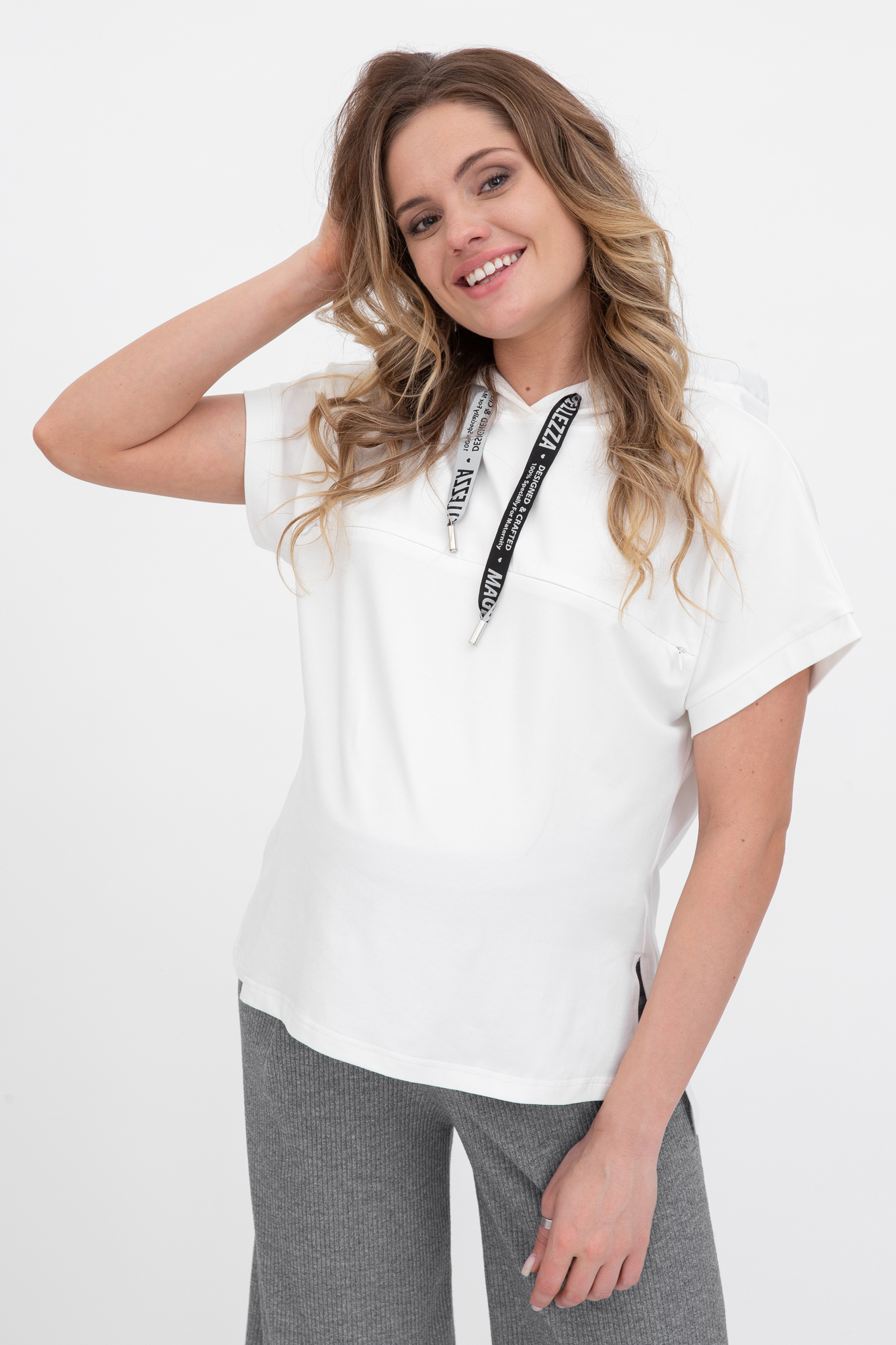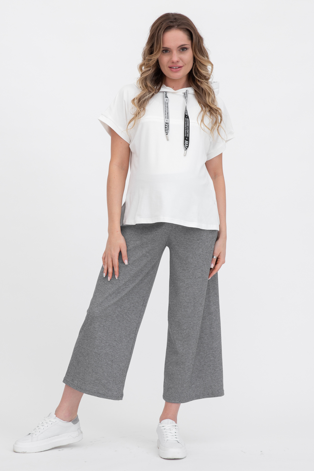 Оригинальный костюм из комбинированых тканей для беременных и кормящих. Костюм состоит из джемпера и брюк. Джемпер с капюшоном, коротким рукавом, разрезами по бокам изделия. Выполнен из высококачественного двухниточного футера. Конструкция для кормления - горизонтальные потайные молнии - позволит покормить малыша с комфортом в любой ситуации. Брюки-кюлоты в рубчик с эластичной высокой вставкой-бандажом рассчитаны на весь период беременности. Объем регулируется с помощью перфорированной резинки, перестегивающейся на пуговицу. Идеальное сочетание стиля и комфорта.
