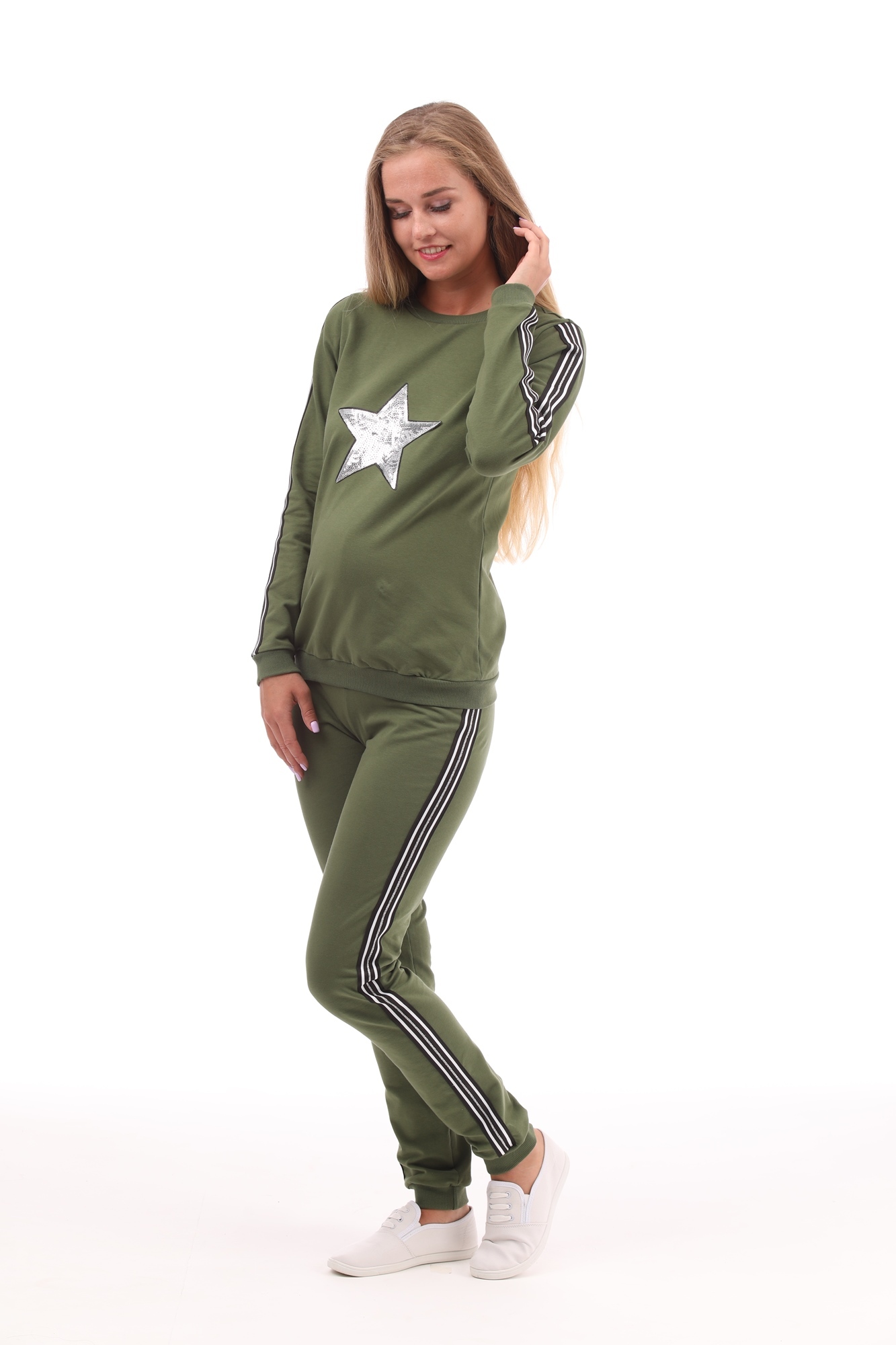 Модный спортивный костюм для будущих мам. Удобный джемпер с округлым вырезом горловины и манжетами по низу изделия и на рукавах. Брюки с резинкой под живот и манжетами по низу брючин. Особый крой костюма позволяет носить его на любом сроке беременности и после нее. Невероятно комфортный для прогулок, занятий спортом и просто в качестве домашней одежды.