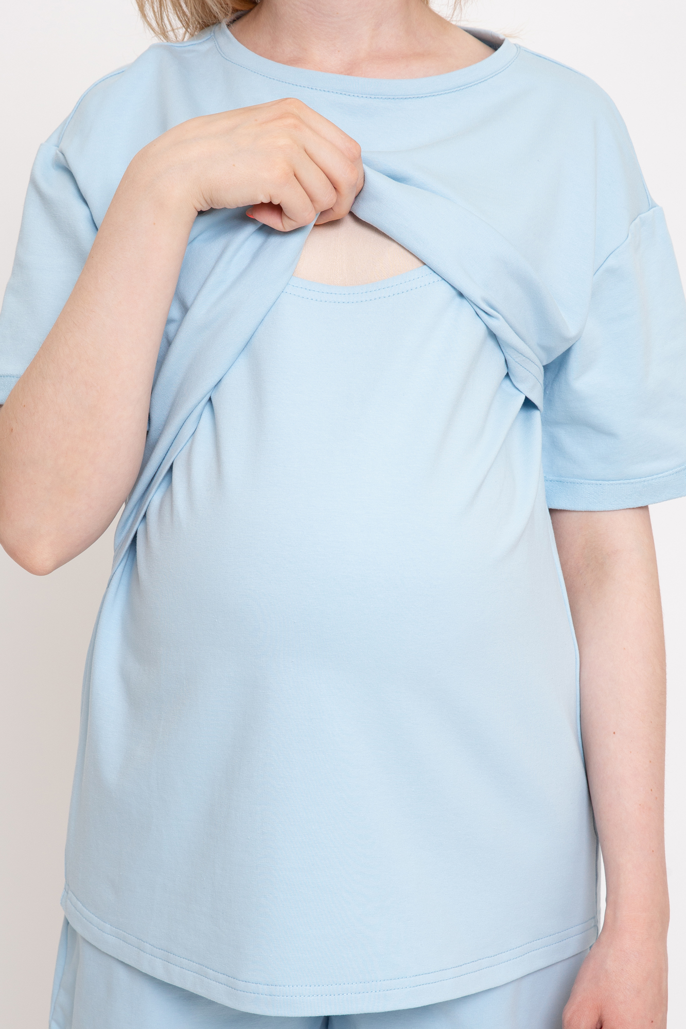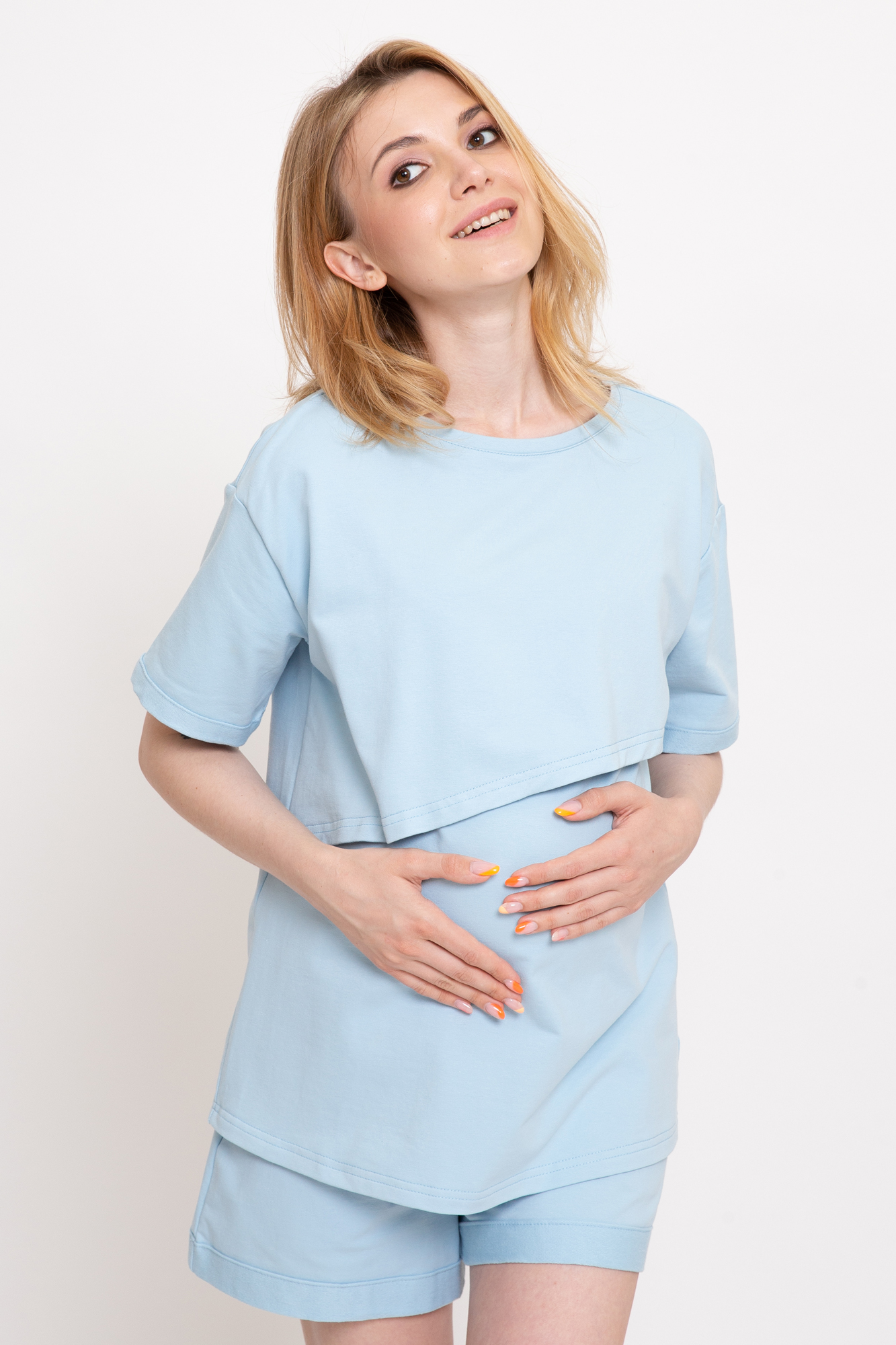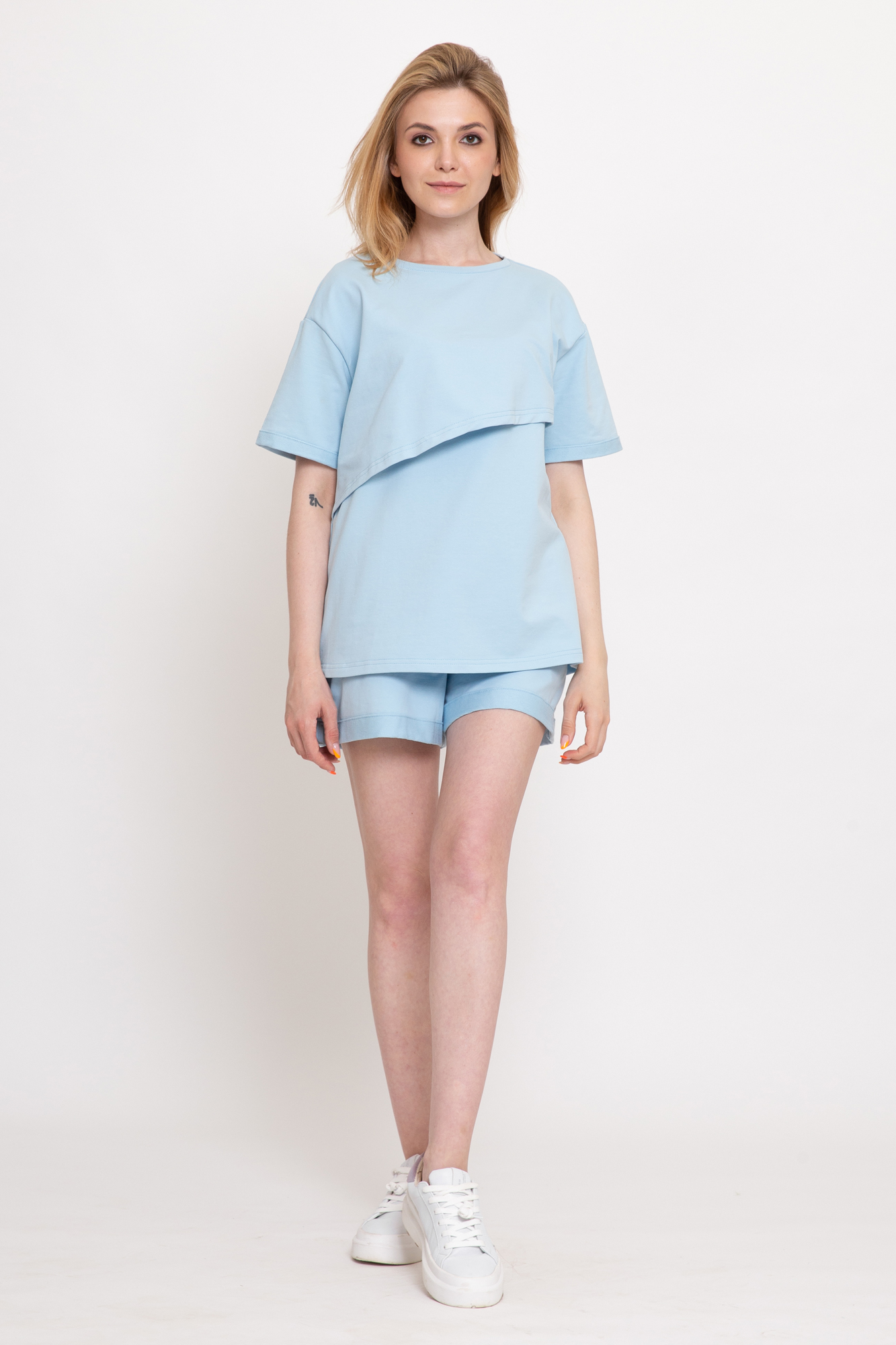 Летний костюм из высококачественного двухниточного футера для беременных и кормящих. Футболка кроя оверсайз имеет специальную конструкцию, позволяющую покормить малыша с повышенным комфортом в любой ситуации. Шорты с эластичным поясом предназначены для ношения в период беременности и после родов. Костюм подойдет для прогулок, занятий спортом и в качестве домашней одежды.