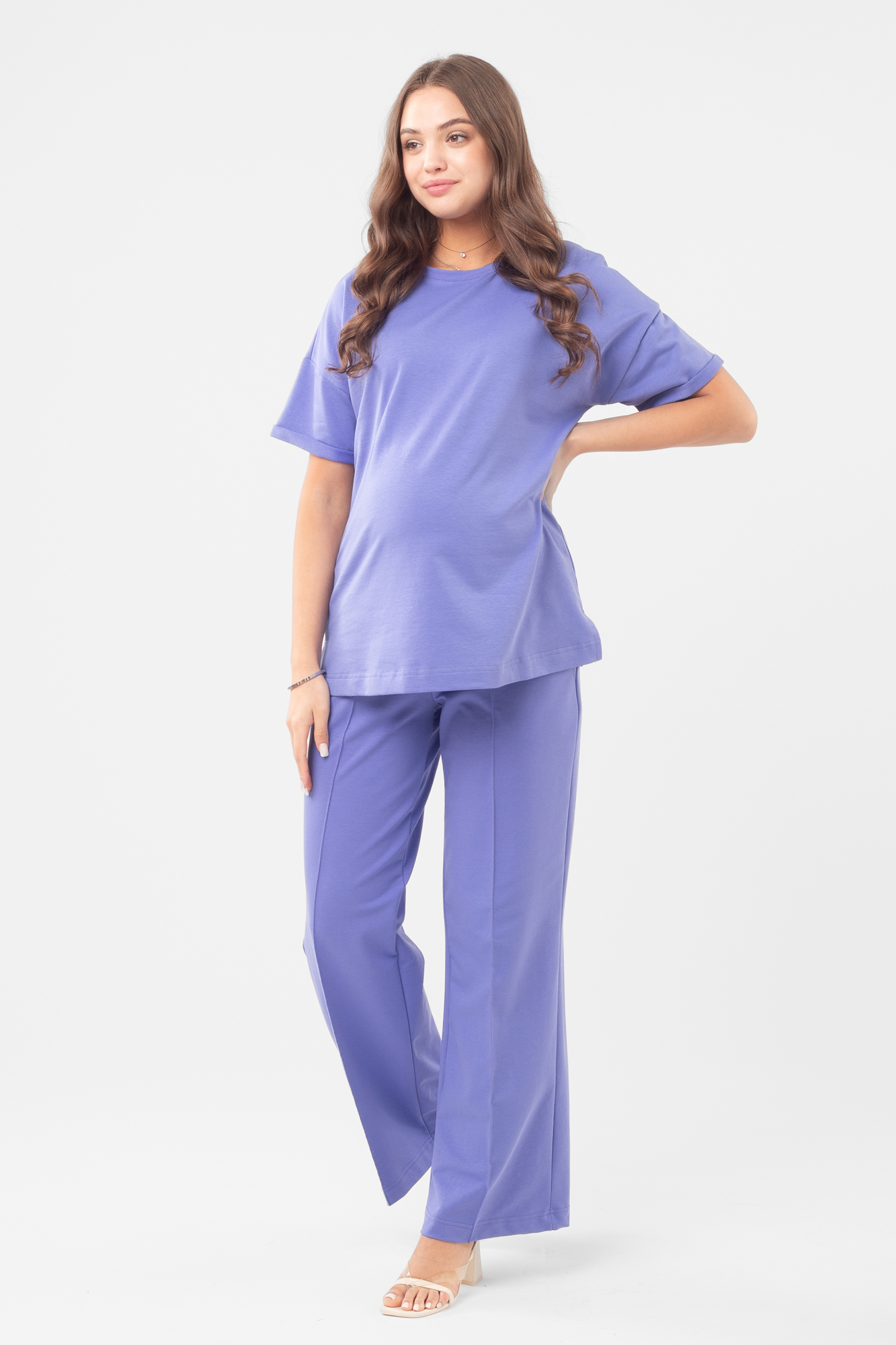 Легкий женский костюм для будущих мам подойдет для прогулок, выписки из роддома, занятий спортом, путешествий и домашней носки. Летний женский костюм для беременных изготовлен из турецкого двухниточного футера премиум-класса. Комплект состоит из двух вещей: футболки и брюк. Кофта с коротким рукавом и круглым вырезом имеет среднюю длину и в меру свободный крой. Брюки прямые, широкие, с отстроченными стрелками и боковыми карманами. В пояс вшита потайная регулировка объема на пуговице, поэтому костюм подходит для ношения на любом месяце беременности и после родов. Модель из легкого хлопкового трикотажа дополнит повседневный женский гардероб. Данная модель подходит для любого типа фигур.