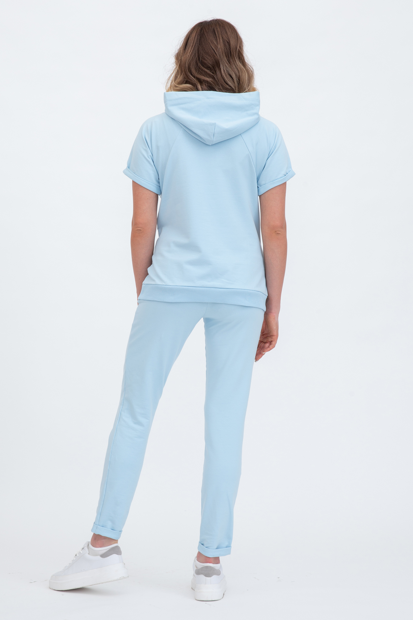 Спортивный костюм для беременных и кормящих. Модель выполнена из высококачественного хлопкового трикотажа. Джемпер с капюшоном, короткими рукавами, оригинальным принтом и манжетой по низу изделия. Секрет кормления - диагональные потайные молнии - позволит покормить малыша с комфортом в любой ситуации. Брюки с эластичным поясом под живот не стесняют движений, особый крой рассчитан на весь срок беременности. Для регулировки объема предусмотрена перфорированная резинка, перестегивающаяся на пуговицу, продетая в пояс брюк.