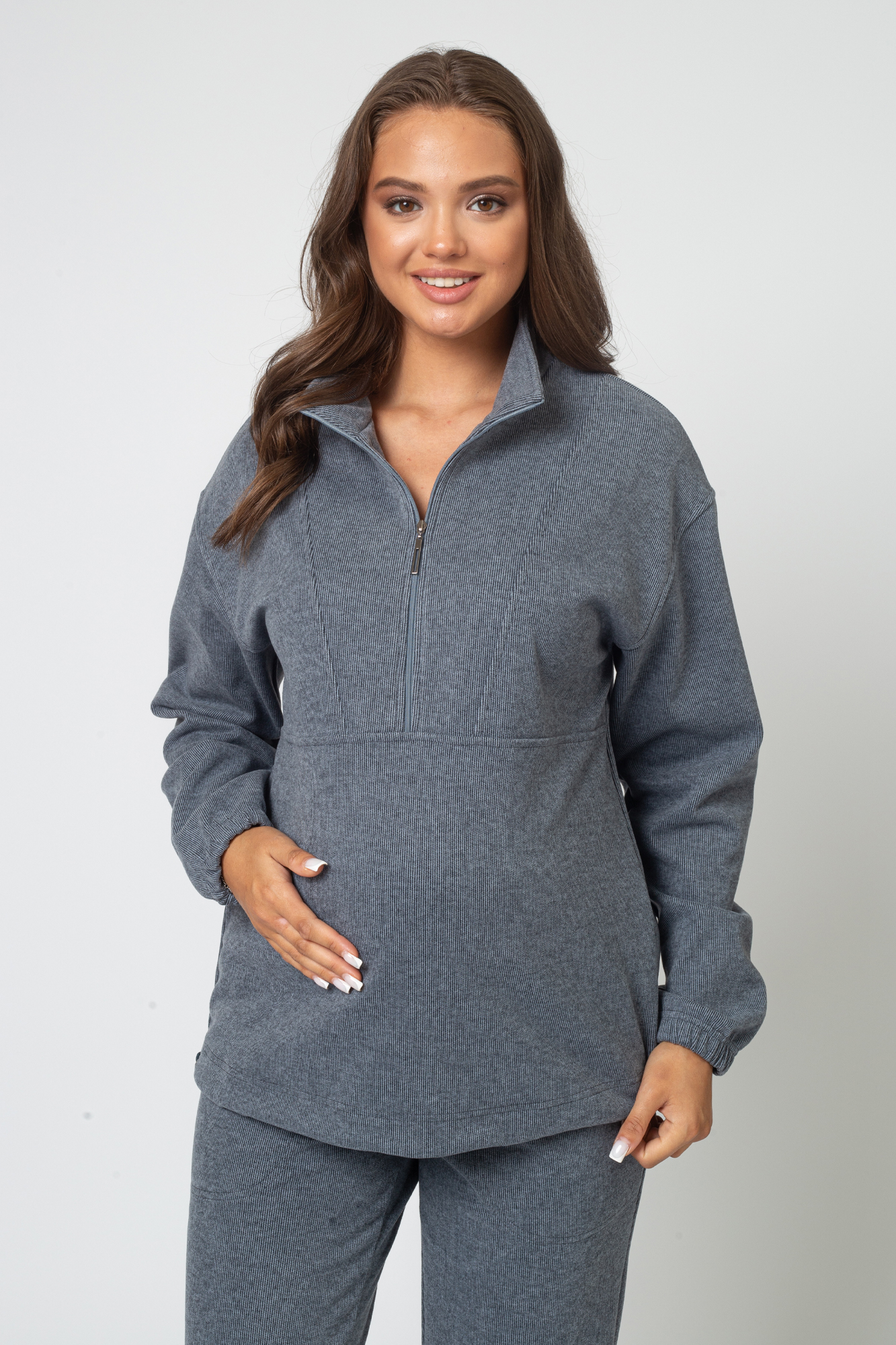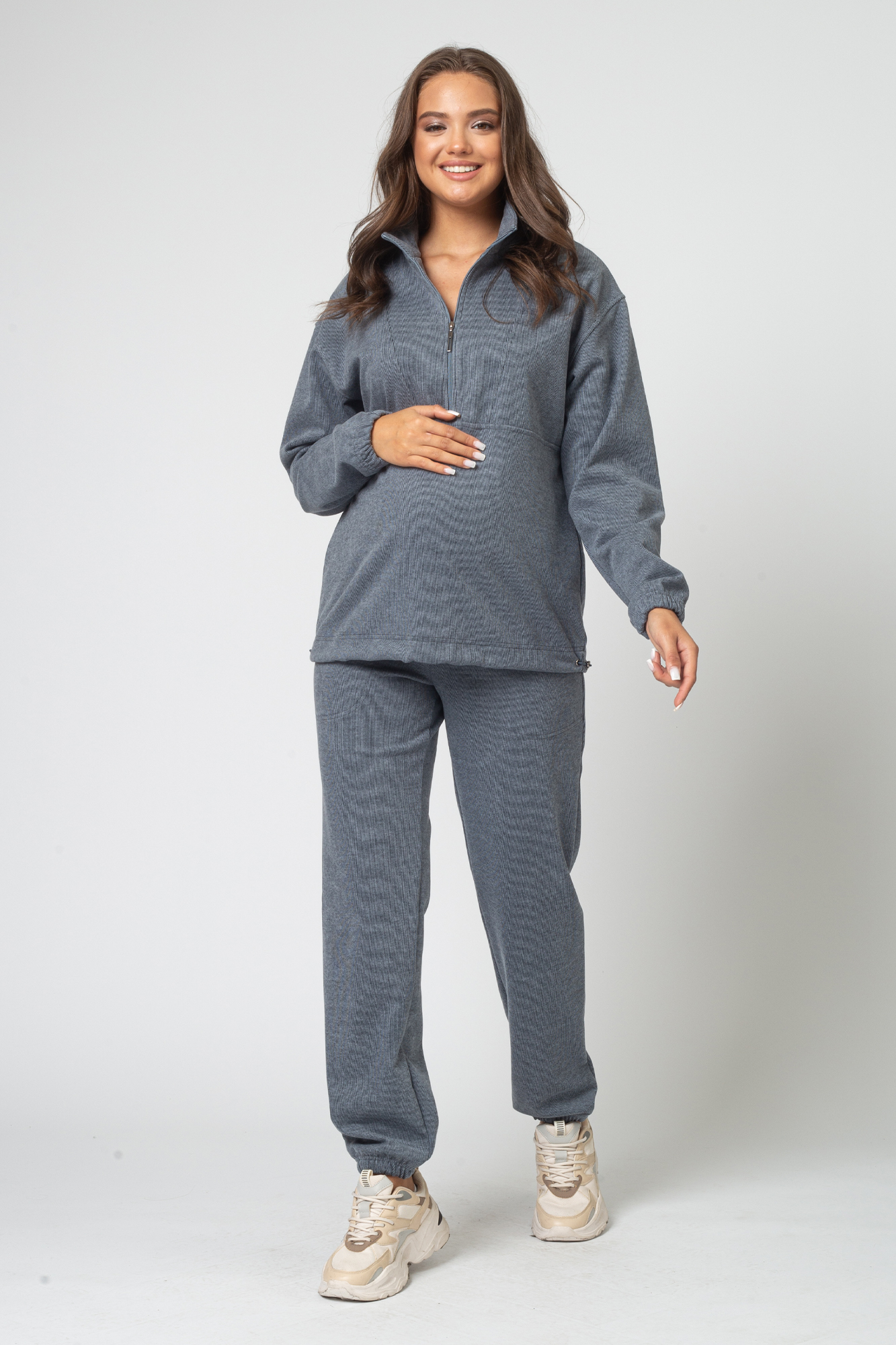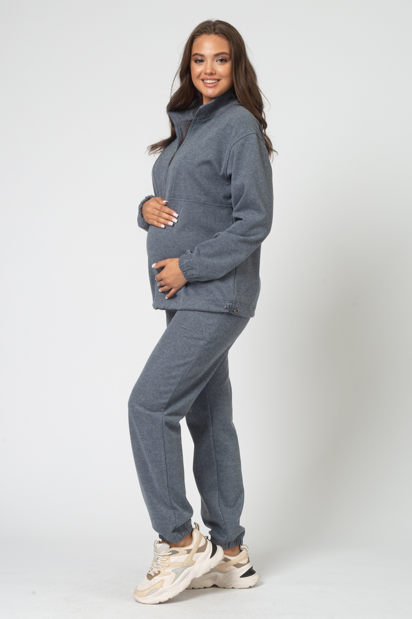 Костюм для беременных выполнен из плотного трикотажного полотна джерси. Брюки джоггеры оснащены высокой эластичной вставкой для живота с возможностью регулировки объема (за счет резинки на пуговице), украшены функциональными боковыми карманами. Свитшот свободного кроя с воротником. Манжеты на резинке. Низ джемпера на утяжках. Для комфортного кормления предусмотрена вертикальная молния. Стильный костюм подходит для ношения на любом месяце беременности и после родов. Костюм из трикотажа идеальный вариант повседневного образа для будущей мамы на прохладную осень.