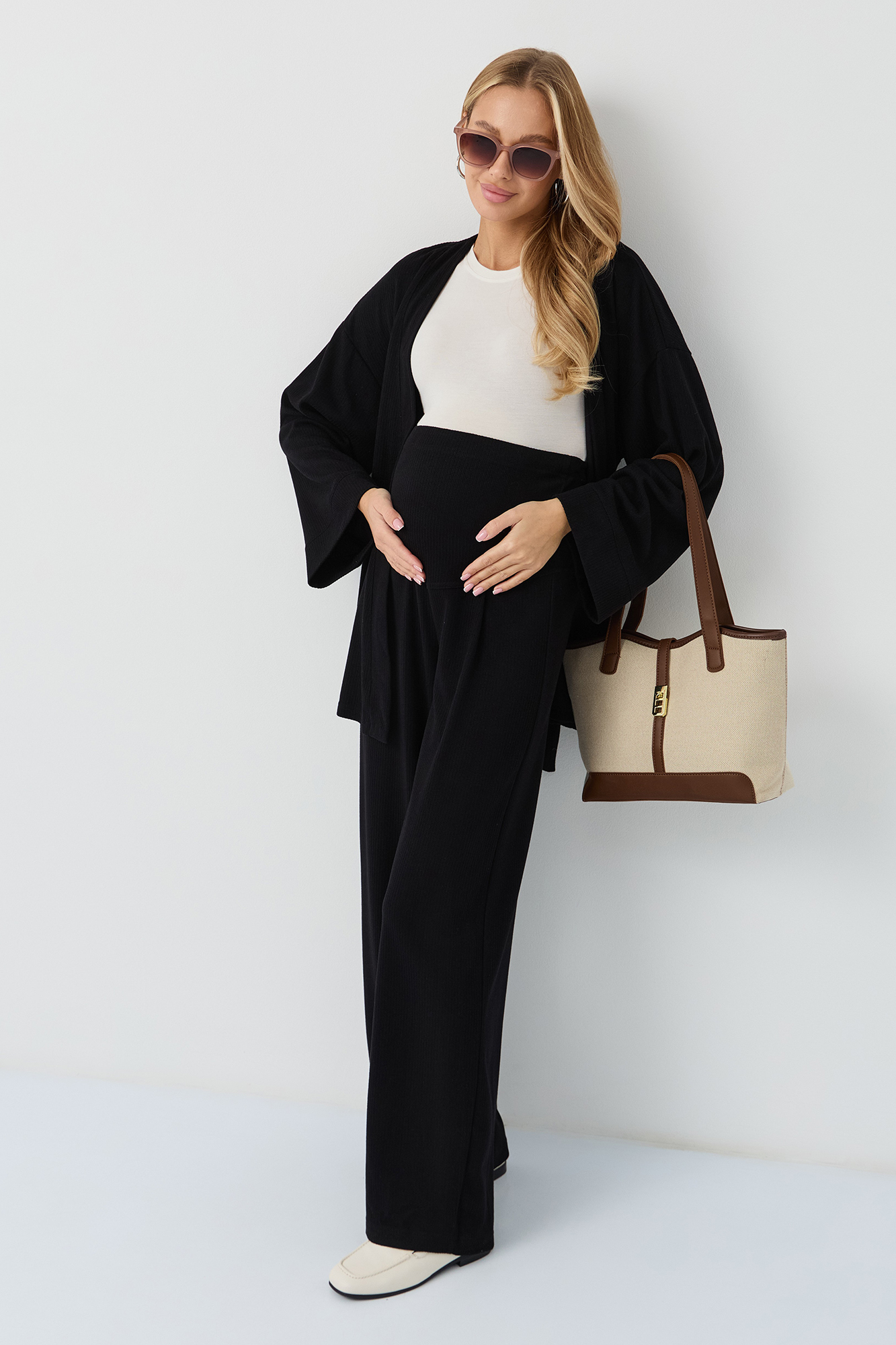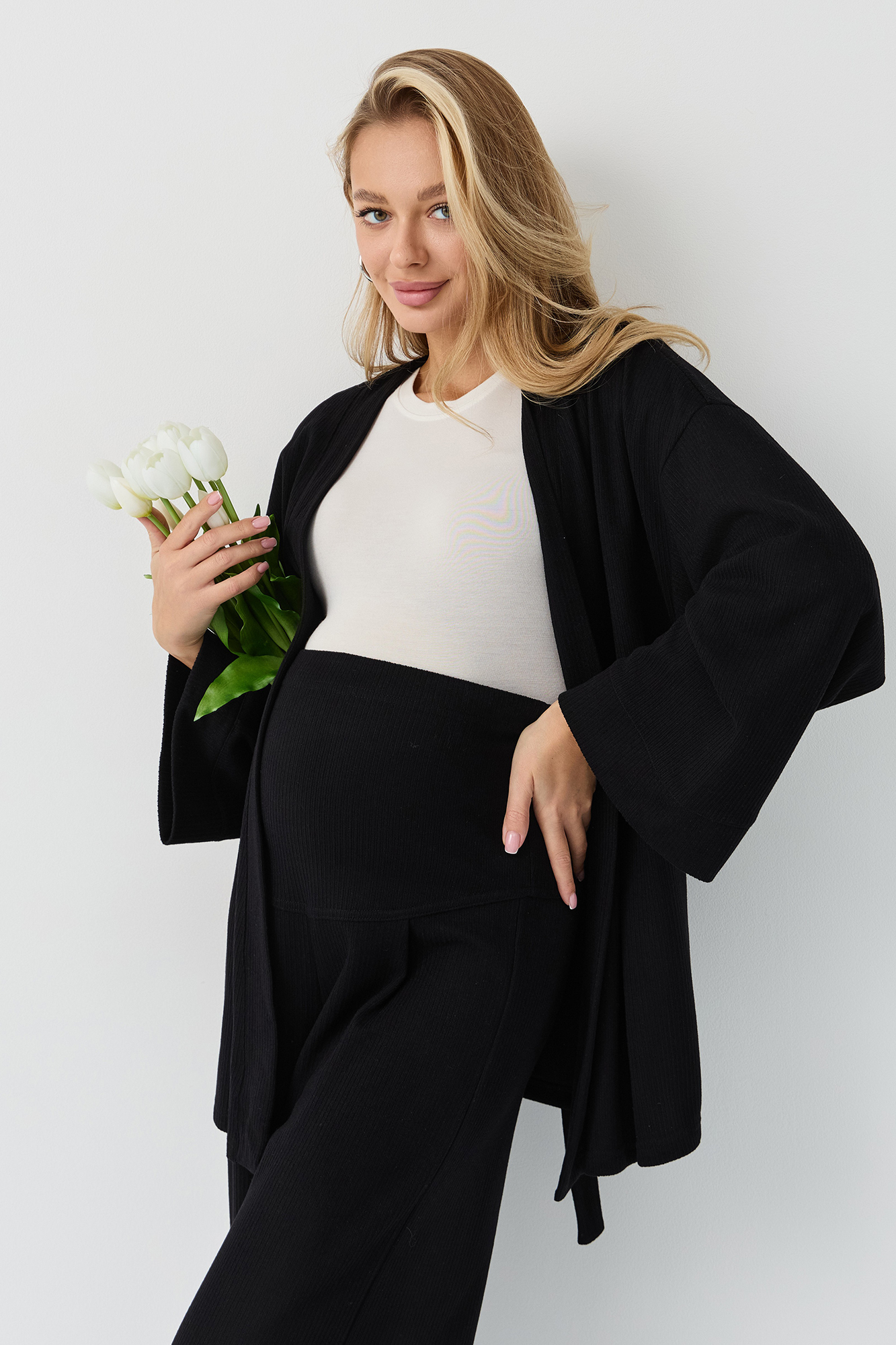 Костюм для беременных изготовлен из качественного мягкого трикотажа в рубчик. Фактурная трикотажная ткань с эффектом вельвета приятна на ощупь и гипоаллергенна. Женский брючный костюм - отличный выбор для повседневного образа. В комплект для будущих мам входят кардиган на запах и штаны. К кимоно предусмотрен пояс. Щирокие штаны оверсайз, прямого кроя, с высоким эластичным поясом, который выполняет роль бандажа. Модель рассчитана на весь период беременности: обхват регулируется за счет пуговицы на резинке. Брючный летний костюм для беременных подойдет для прогулок, офиса или носки дома. Стильный костюм двойка - незаменимая одежда для беременных в любое время года. Трикотажный однотонный костюм подходит девушкам и женщинам больших размеров плюз сайз. Состав: 65% Вискоза, 30% Полиэстер, 5% Лайкра. Костюм для беременных - отличный выбор для будущих мам на весну.