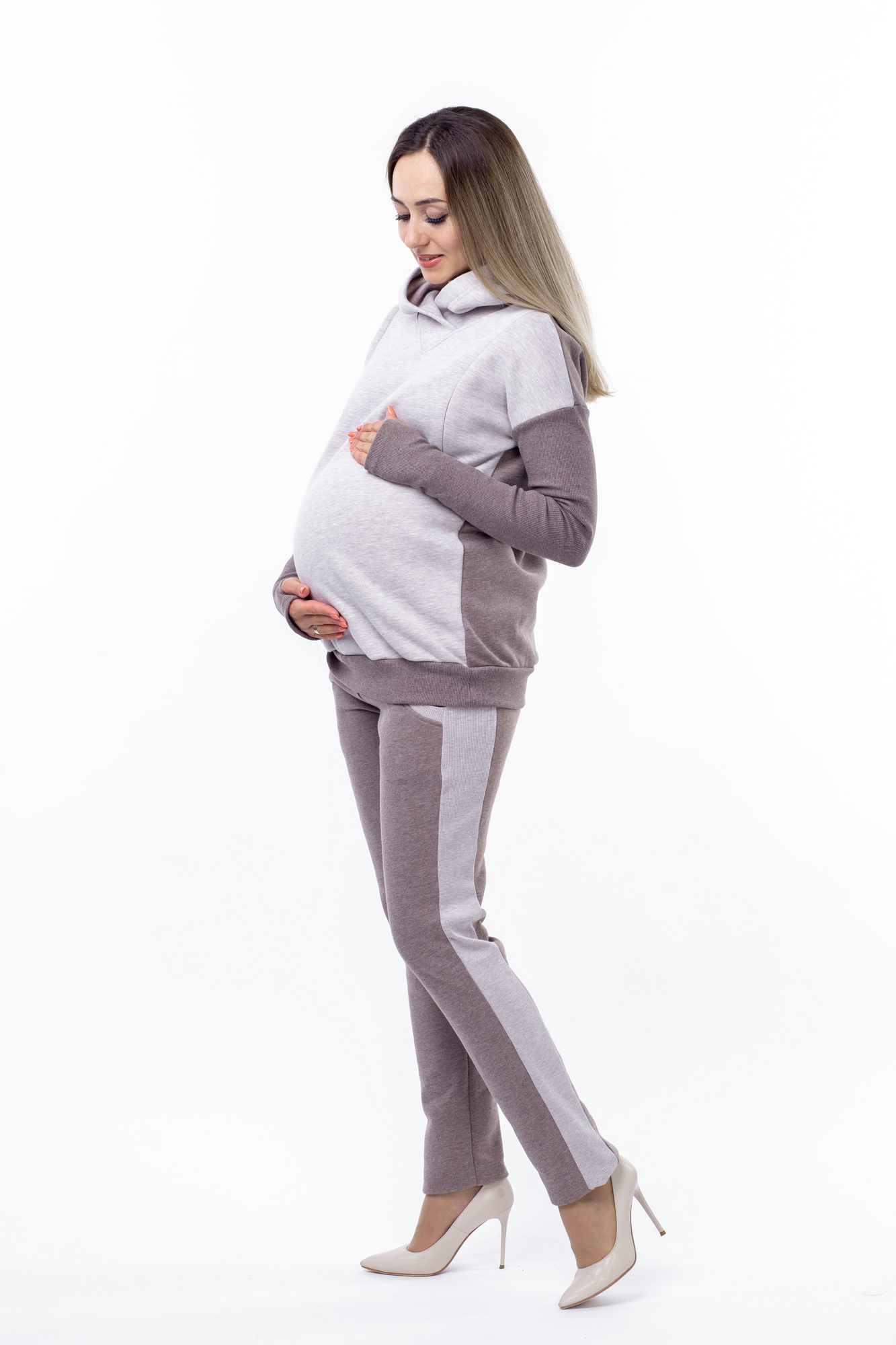 Утепленный спортивный костюм из футера с начесом. Стильная толстовка с капюшоном согреет в прохладную погоду. Особый крой позволяет носить изделие на всем протяжении беременности и после нее. Благодаря вертикальным потайным молниям Вы сможете покормить малыша с комфортом в любой ситуации. Брючки с эластичным поясом рассчитаны на любой срок беременности, не сдавливают и поддерживают растущий животик.