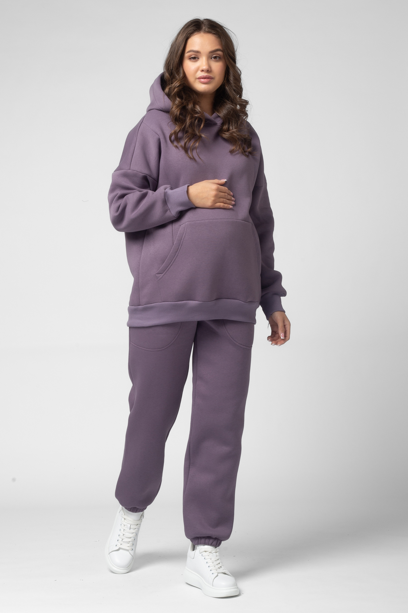 Теплый спортивный костюм для беременных и кормящих выполнен из премиального трехниточного футера с начесом. В комплект входят худи и брюки. Толстовка свободного кроя, с большим капюшоном и длинными рукавами оснащена двум потайными молниями для обеспечения комфортного кормления в общественных местах. Стильные брюки джоггеры с удобными карманами по бокам и высоким эластичным бандажом. На брюках предусмотрена утягивающая резинка, фиксирующаяся на пуговицу, для регулировки объема изделия. Высокая трикотажная вставка обеспечивает мягкую поддержку животика, позволяет носить костюм на протяжении всей беременности и после родов. Утепленный костюм для будущих и кормящих мам подойдет для прогулок и поездок, отдыха, занятий спортом, посещения консультации, а также для домашнего ношения. Особый крой с учетом анатомических особенностей позволяет носить однотонный зимний костюм на любом сроке беременности, а так же станет удобным комплектом для полных девушек и женщин.