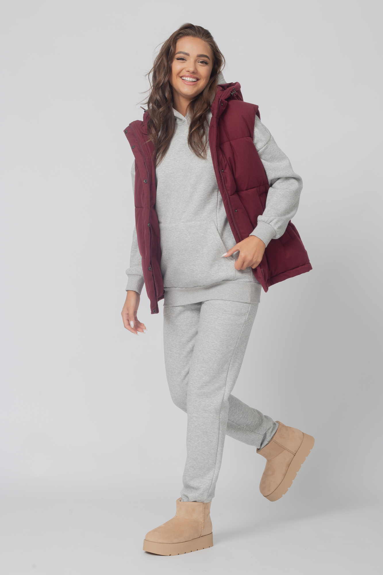 Теплый спортивный костюм для беременных и кормящих выполнен из премиального трехниточного футера "барашка". Ткань обладает высокой износостойкостью и не закатывается. В комплект входят худи и брюки. Толстовка свободного кроя, с большим капюшоном и длинными рукавами оснащена двум потайными молниями для обеспечения комфортного кормления в общественных местах. Стильные брюки джоггеры с удобными карманами по бокам и высоким эластичным бандажом. На брюках предусмотрена утягивающая резинка, фиксирующаяся на пуговицу, для регулировки объема изделия. Высокая трикотажная вставка обеспечивает мягкую поддержку животика, позволяет носить костюм на протяжении всей беременности и после родов. Утепленный костюм для будущих и кормящих мам подойдет для прогулок и поездок, отдыха, занятий спортом, посещения консультации, а также для домашнего ношения. Особый крой с учетом анатомических особенностей позволяет носить однотонный зимний костюм на любом сроке беременности, а так же станет удобным комплектом для полных девушек и женщин.