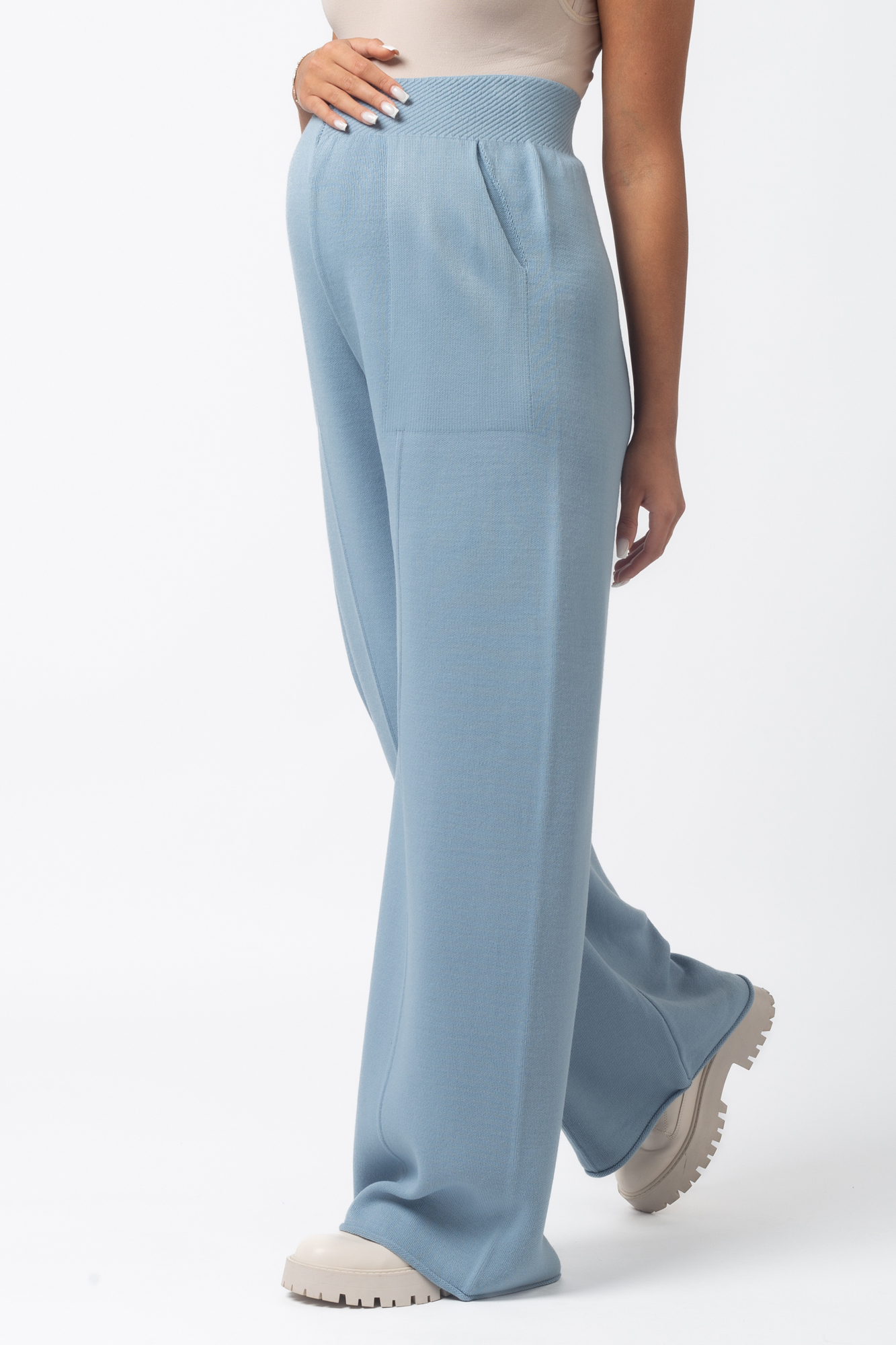 Теплый вязаный костюм для беременных. Модель выполнена из мягкого полотна мелкой вязки с добавлением акрила и шерсти. Костюм состоит из двух вещей. Джемпер прекрасно садится на фигуру будущей мамы, не обтягивая животик. Дополнен декоративными элементами в виде закрученного края и оригинальной вязки. Широкие штаны палаццо оснащены эластичной мягкой резинкой, которая не давит на животик. Брюки дополнены карманами спереди. Данная модель идеально садится на животик с первых месяцев и до последнего. За счет удобной резинки костюм можно будет носить и после рождения малыша. Такой костюм можно носить в офис, на прогулку, на мероприятия. Свободный крой оверсайз обеспечивает комфорт и удобство на протяжении всего срока беременности. Идеальная модель на весну или прохладное лето.