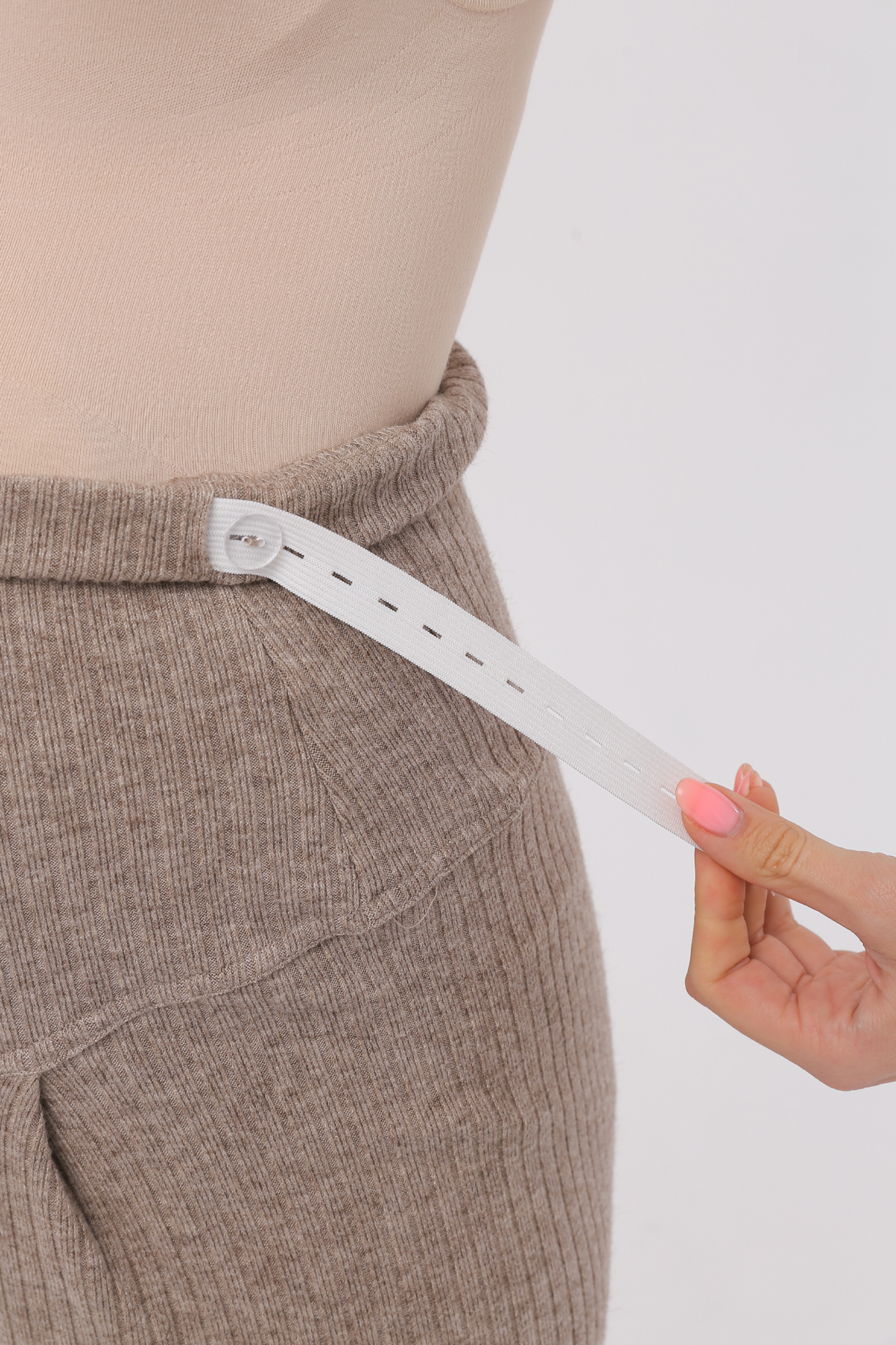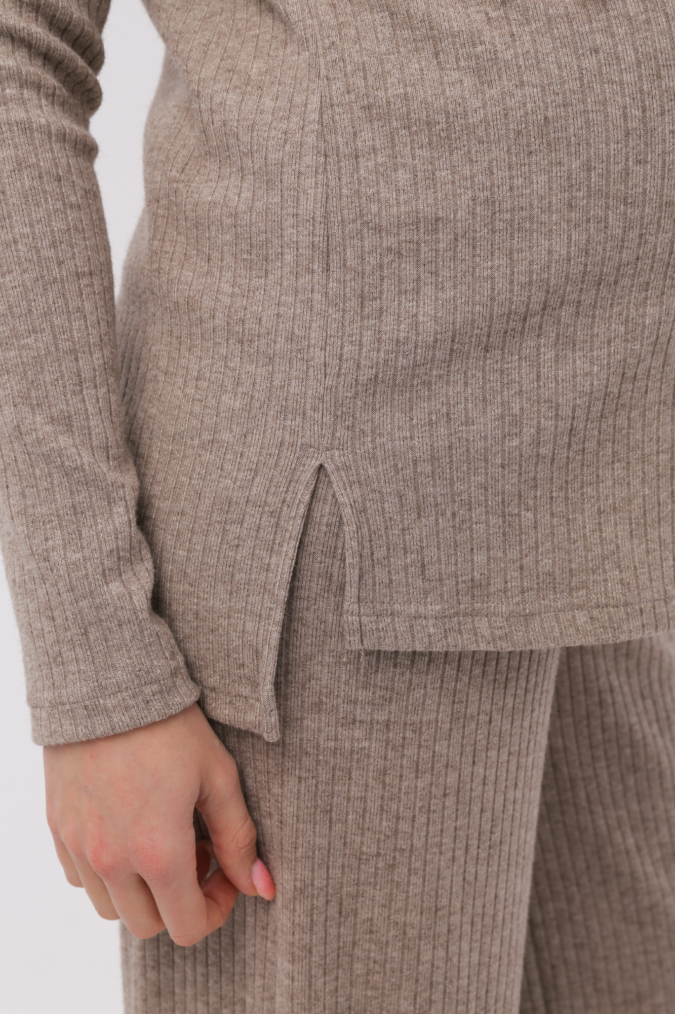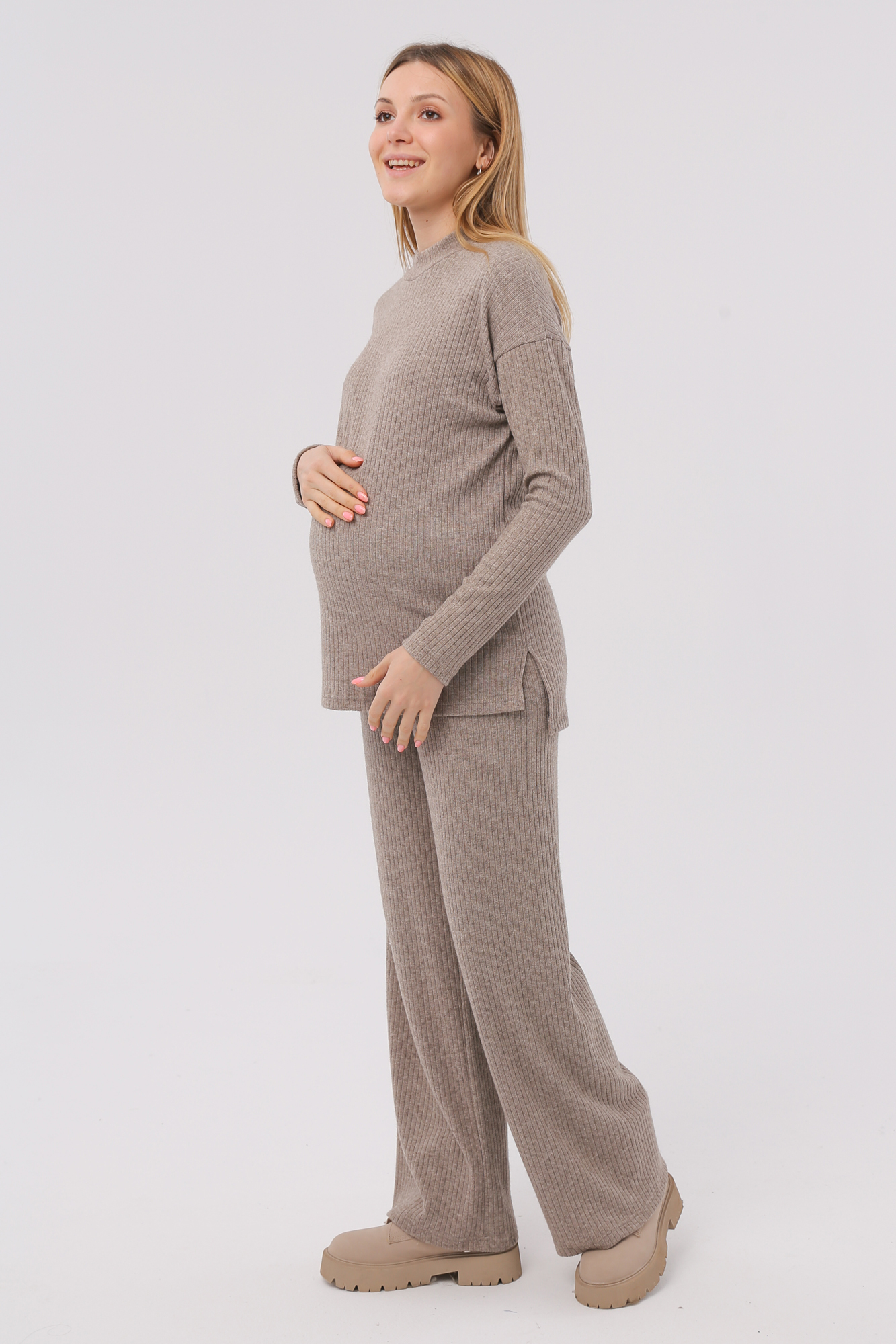 Брючный костюм для беременных сшит из качественного теплого вязанного трикотажного материала. Фактурная ткань лапша в рубчик приятна на ощупь, гипоаллергенна и отлично согревает в непогоду. Женский костюм из трикотажа - удачный выбор для повседневного ношения в холодное время года. В комплект для будущих мам включены кофта и штаны. Джемпер со спущенной линией плеча слегка удлинен сзади, по бокам - небольшие разрезы. Штаны широкие, прямого кроя, с высоким эластичным поясом, который выполняет роль бандажа. Модель рассчитана на весь период беременности: обхват регулируется за счет пуговицы на резинке. Брючный костюм для беременных подойдет для прогулок, офиса или ношения дома. В осенний и весенний периоды он пригодится на выписку. Модель предлагается в нескольких однотонных расцветках и полной размерной линейке.