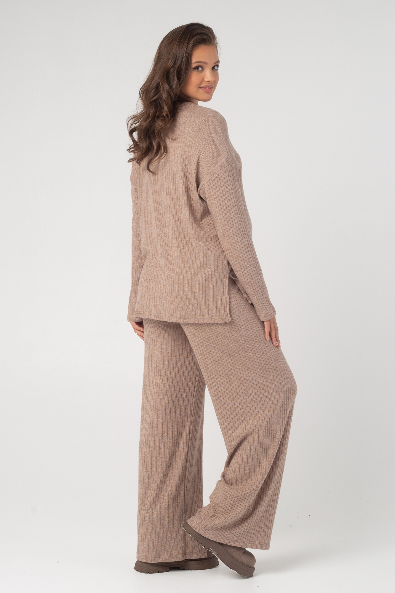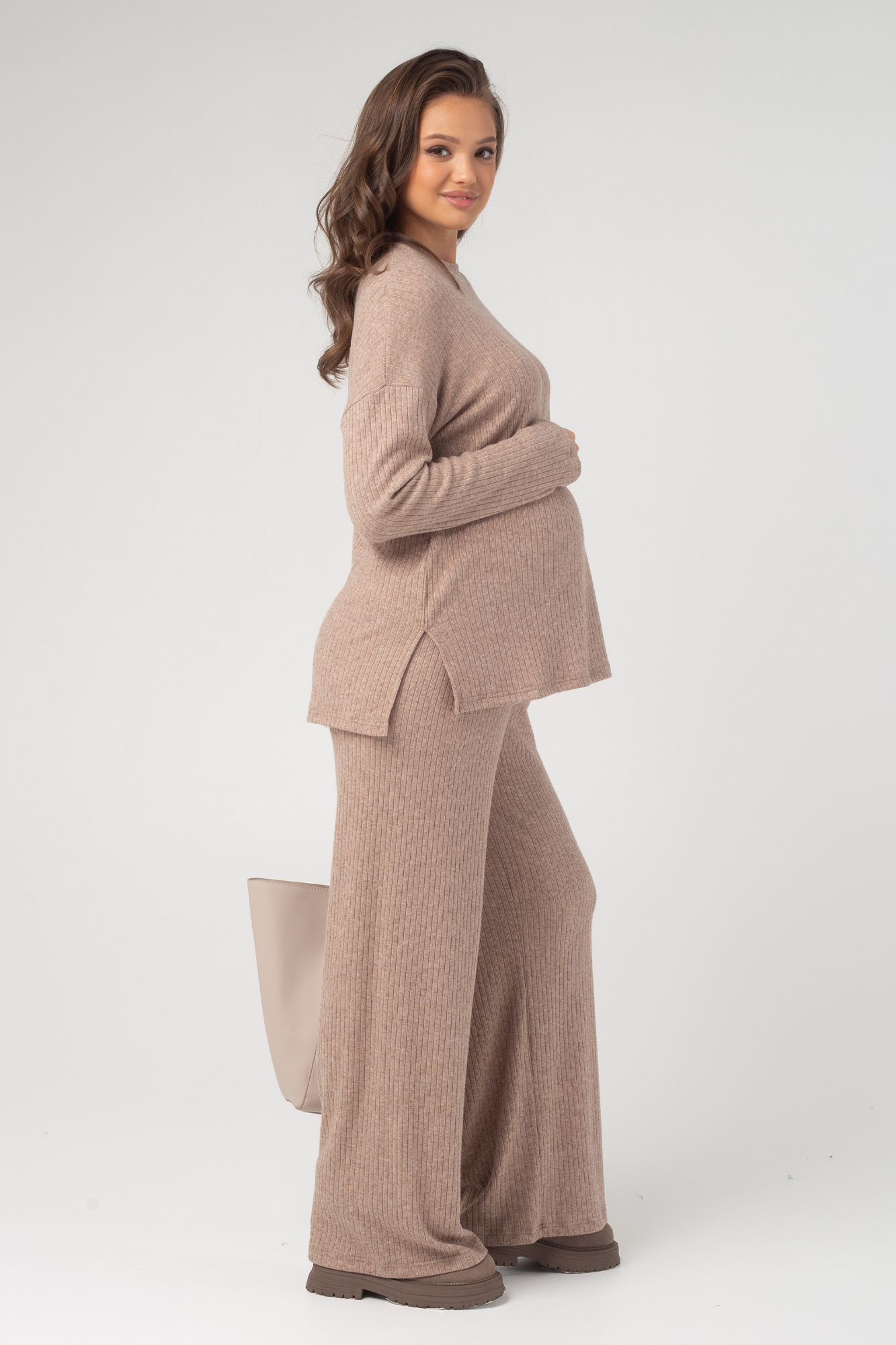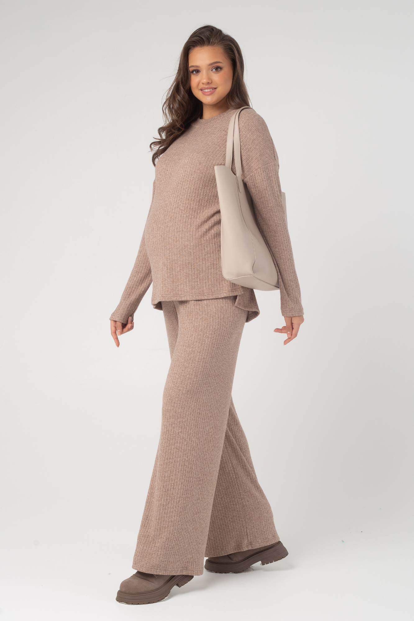 Брючный костюм для беременных сшит из качественного теплого вязанного трикотажного материала. Фактурная ткань лапша в рубчик приятна на ощупь, гипоаллергенна и отлично согревает в непогоду. Женский костюм из трикотажа - удачный выбор для повседневного ношения в холодное время года. В комплект для будущих мам включены кофта и штаны. Джемпер со спущенной линией плеча слегка удлинен сзади, по бокам - небольшие разрезы. Штаны широкие, прямого кроя, с высоким эластичным поясом, который выполняет роль бандажа. Модель рассчитана на весь период беременности: обхват регулируется за счет пуговицы на резинке. Брючный костюм для беременных подойдет для прогулок, офиса или ношения дома. В осенний и весенний периоды он пригодится на выписку. Модель предлагается в нескольких однотонных расцветках и полной размерной линейке.