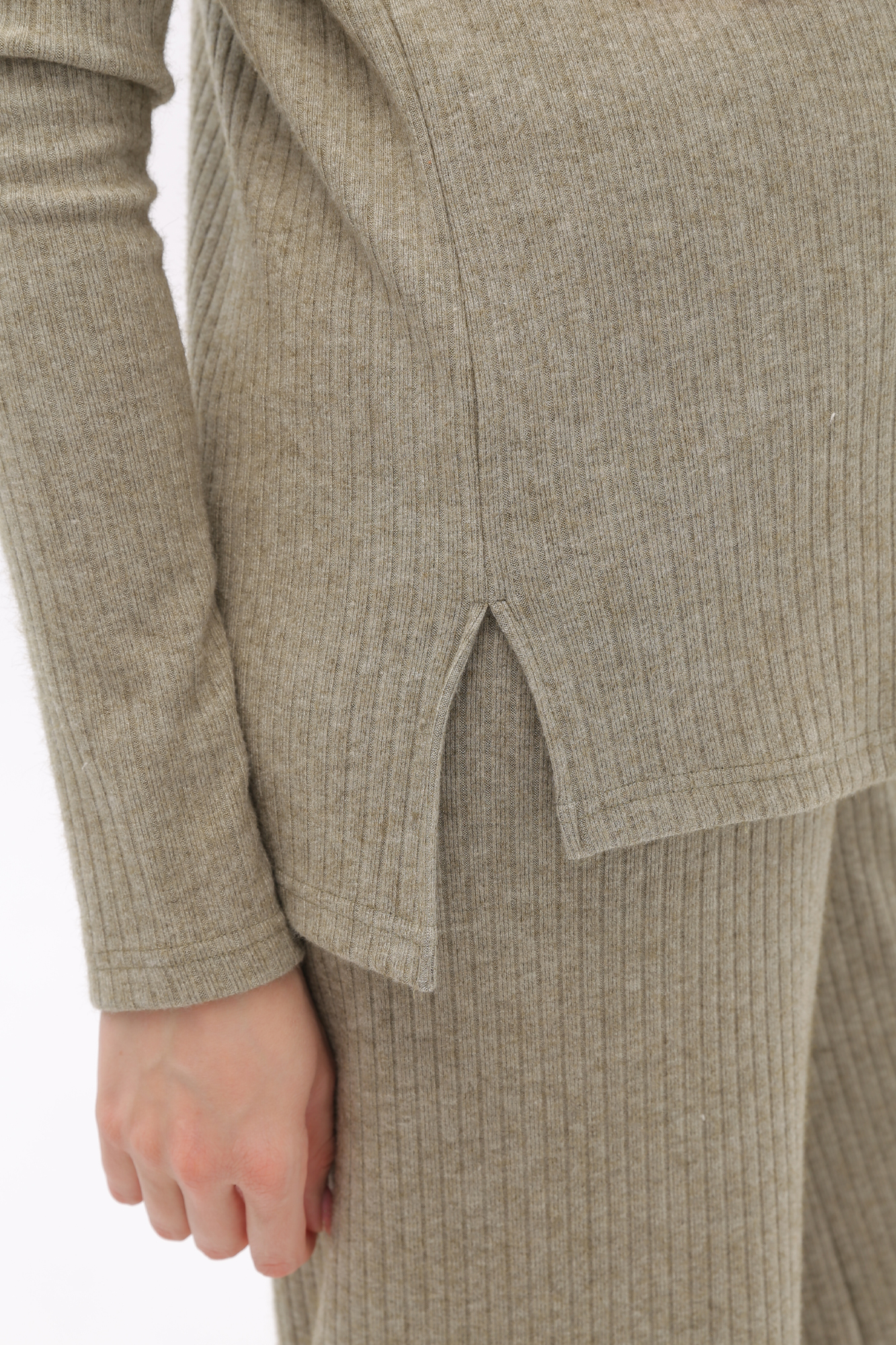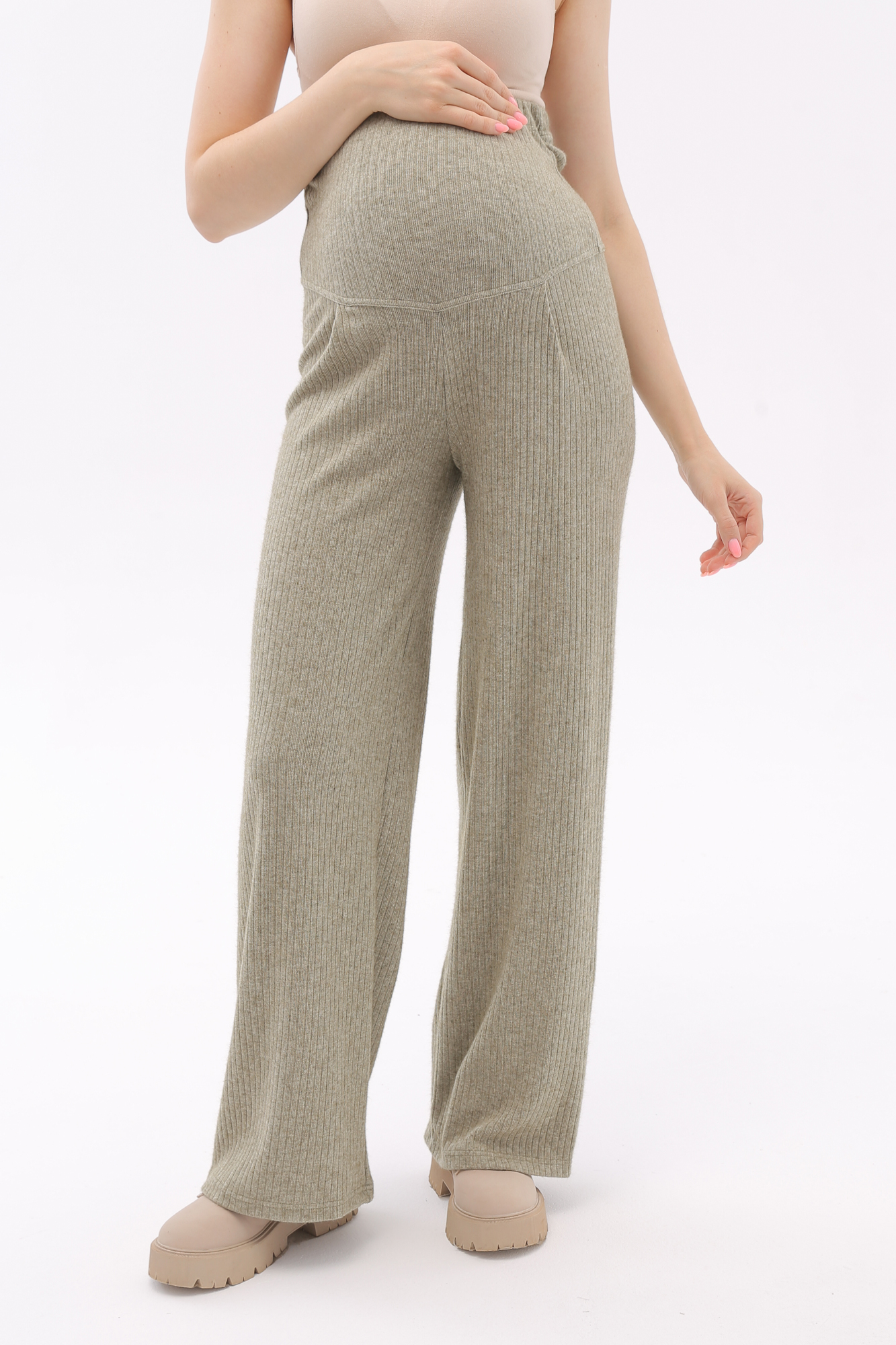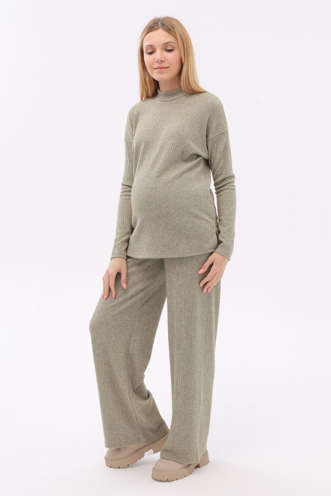 Брючный костюм для беременных сшит из качественного теплого вязанного трикотажного материала. Фактурная ткань лапша в рубчик приятна на ощупь, гипоаллергенна и отлично согревает в непогоду. Женский костюм из трикотажа - удачный выбор для повседневного ношения в холодное время года. В комплект для будущих мам включены кофта и штаны. Джемпер со спущенной линией плеча слегка удлинен сзади, по бокам - небольшие разрезы. Штаны широкие, прямого кроя, с высоким эластичным поясом, который выполняет роль бандажа. Модель рассчитана на весь период беременности: обхват регулируется за счет пуговицы на резинке. Брючный костюм для беременных подойдет для прогулок, офиса или ношения дома. В осенний и весенний периоды он пригодится на выписку. Модель предлагается в нескольких однотонных расцветках и полной размерной линейке.