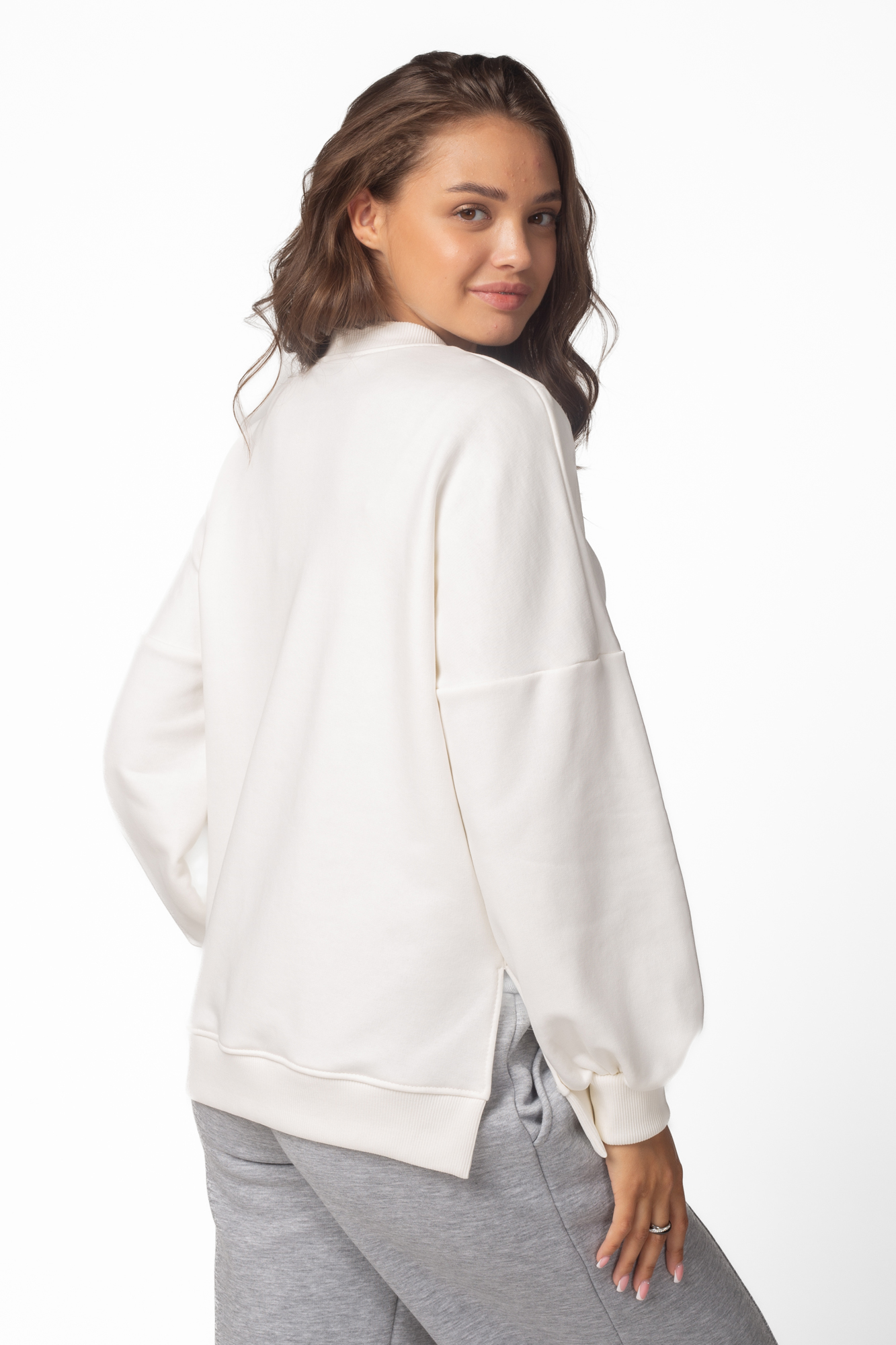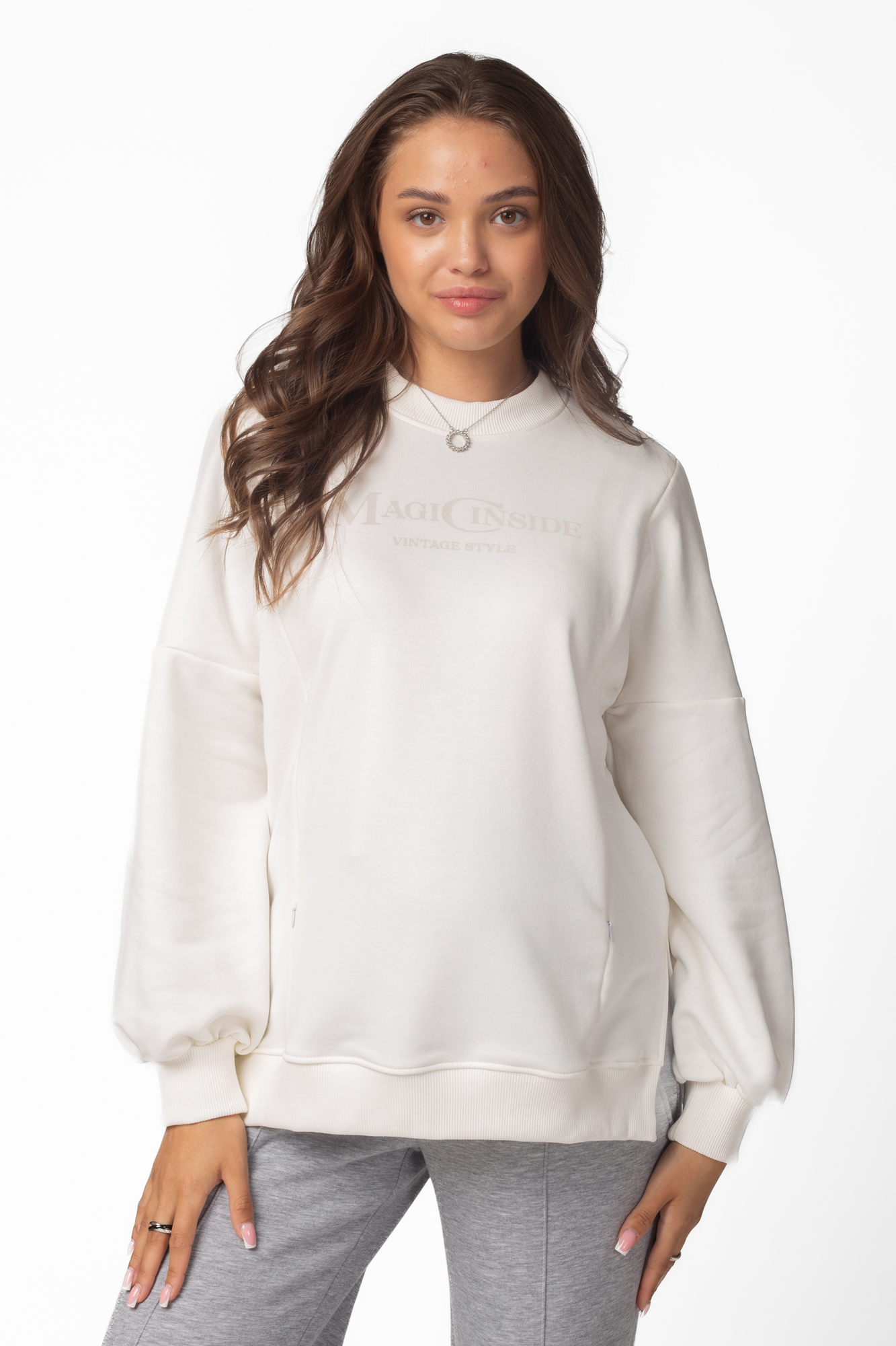 Утепленный свитшот оверсайз из трехниточного футера с начесом для беременных и кормящих. Модель со спущенной линией плеча, воротником-стойкой, разрезами по бокам и оригинальным рукавом. Идеальная посадка на всем протяжении беременности и после родов. Вертикальные потайные молнии позволят покормить малыша с комфортом в любой ситуации.