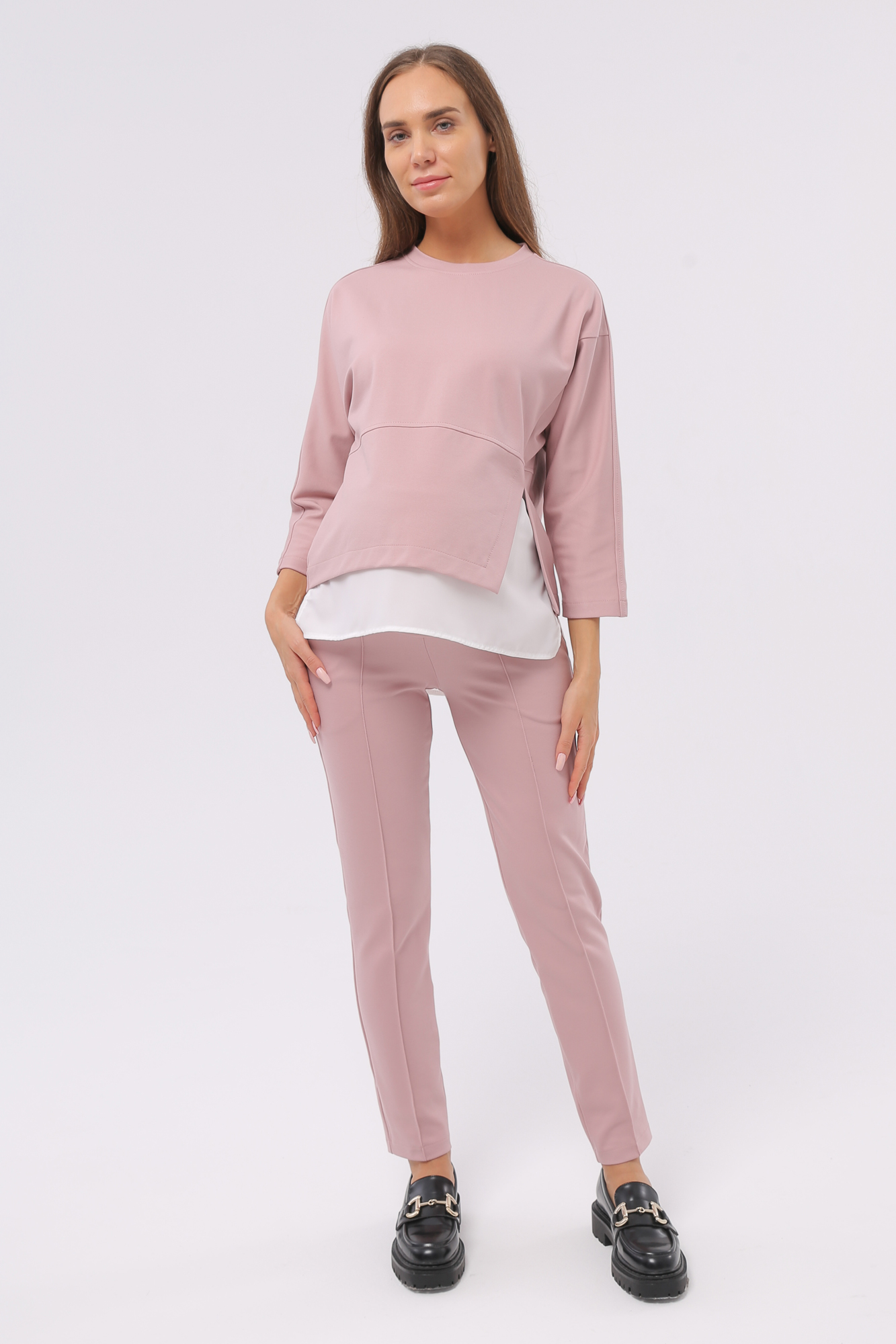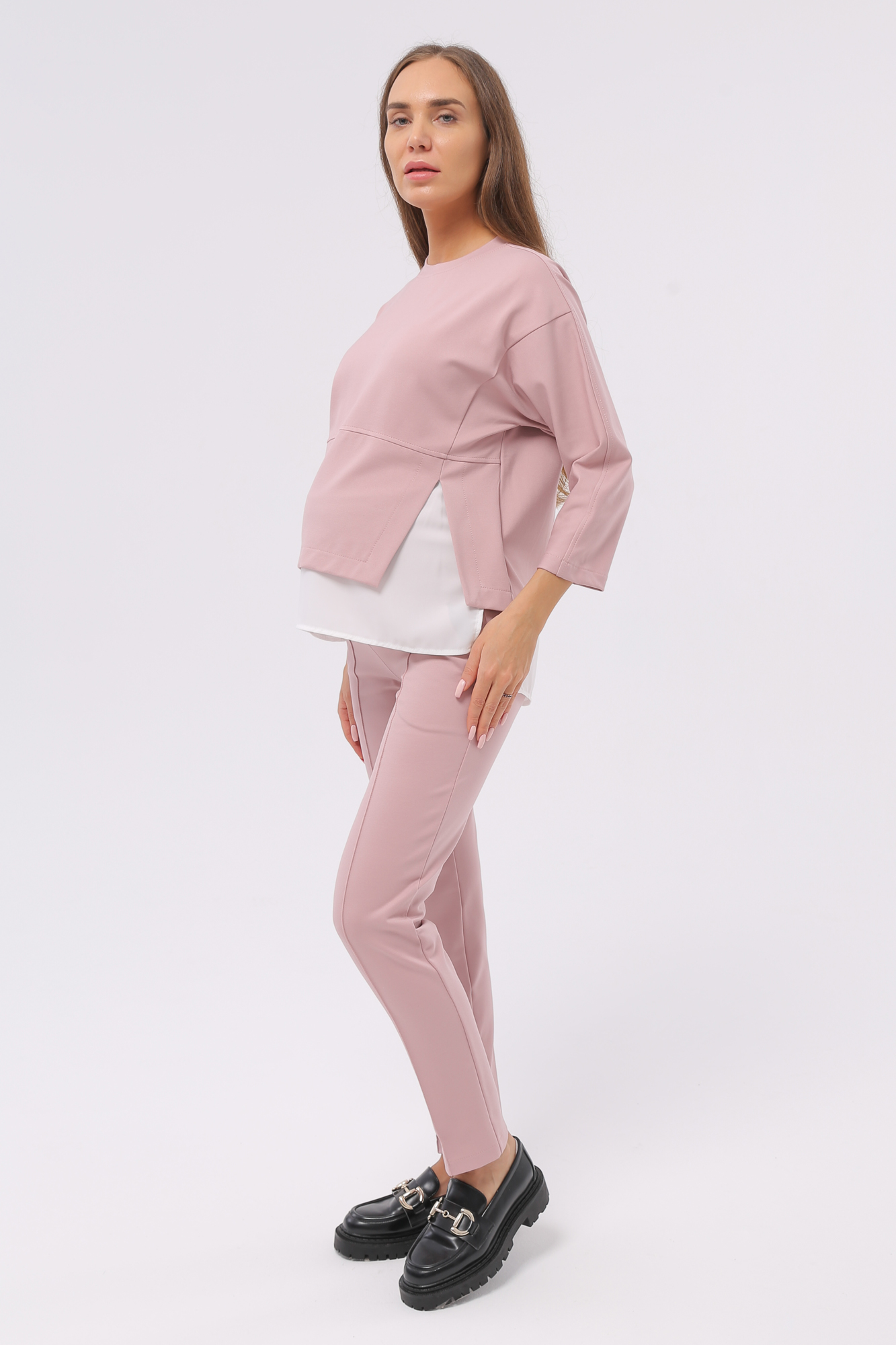 Стильный костюм для беременных выполнен из высококачественного джерси. Костюм состоит из оригинального двуслойного джемпера свободного кроя и брюк с высокой посадкой. Объем регулируется с помощью перфорированной резинки перестегивающейся на пуговицу. Брюки декорированы отстроченными стрпелками. Идеальная посадка на протяжении всей беременности и после родов. Костюм подойдет для офиса, прогулок и просто на каждый день.