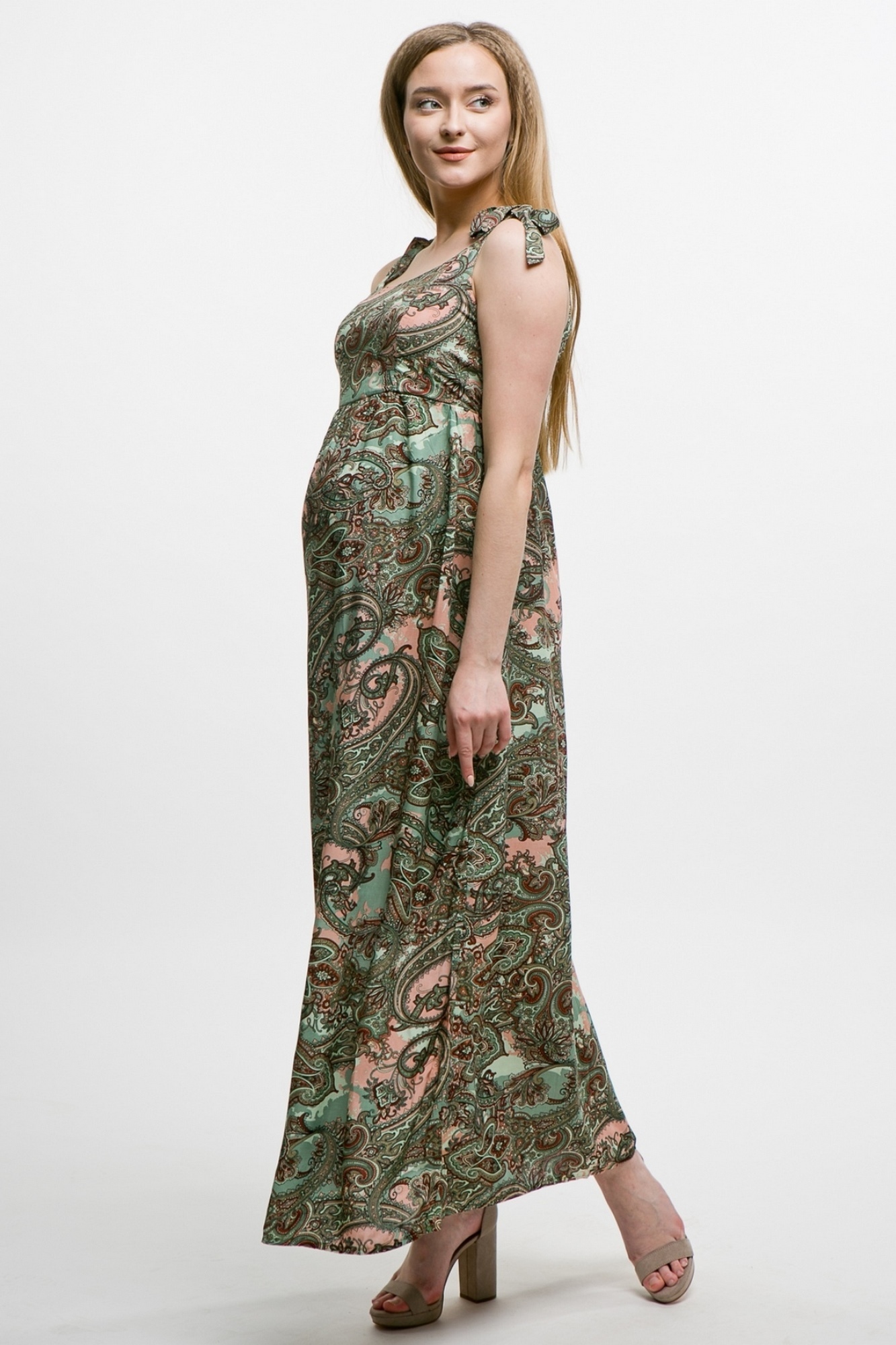 Длинное платье с яркой расцветкой для будущих мам. Округлый вырез горловины, без рукавов, бретели завязываются на плечах. Тонкий ремешок подчеркнет элегантность образа. Платье можно носить на всем протяжении беременности и после нее. Подойдет так же для особых случаев и выписки из роддома.
