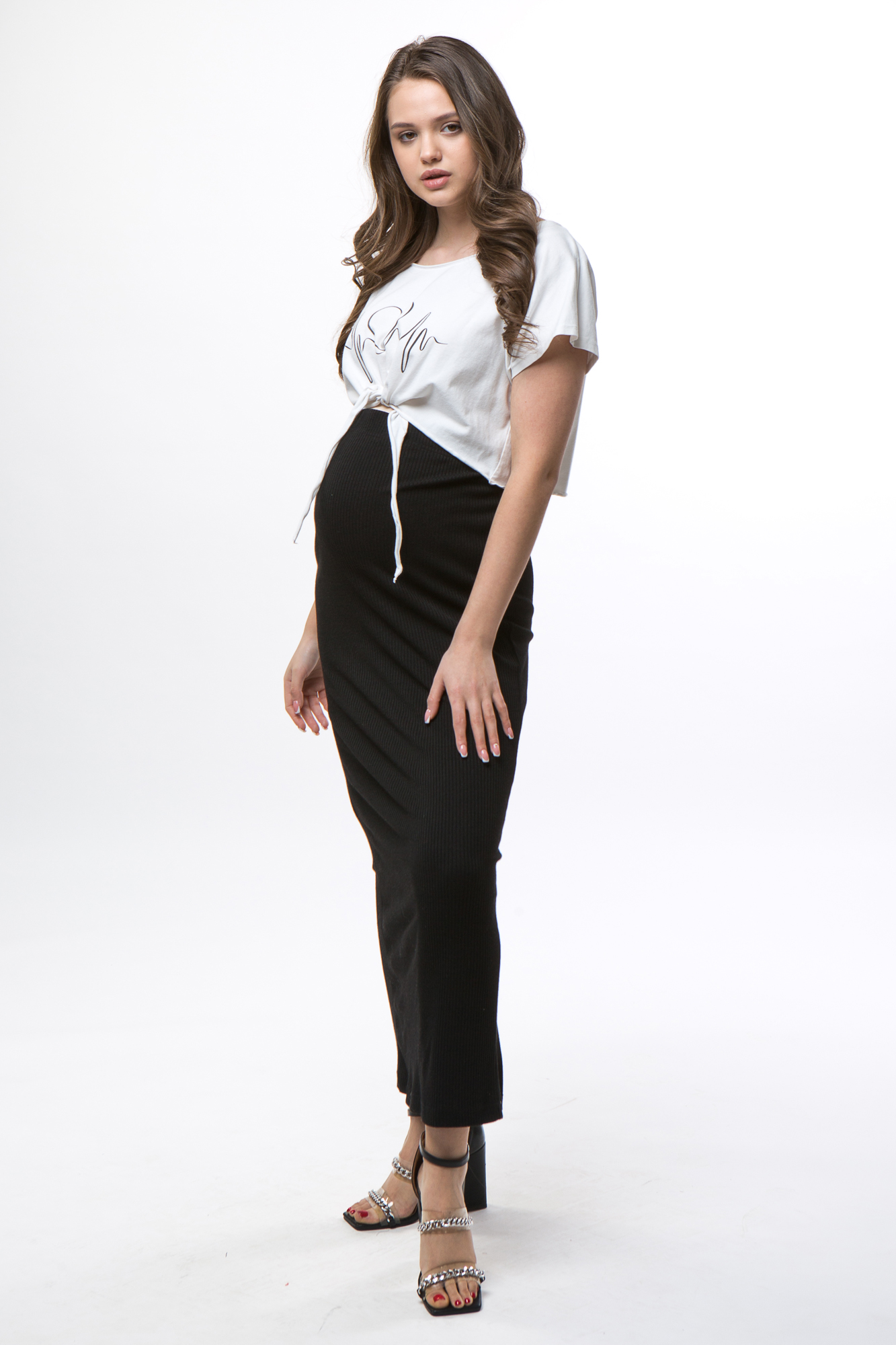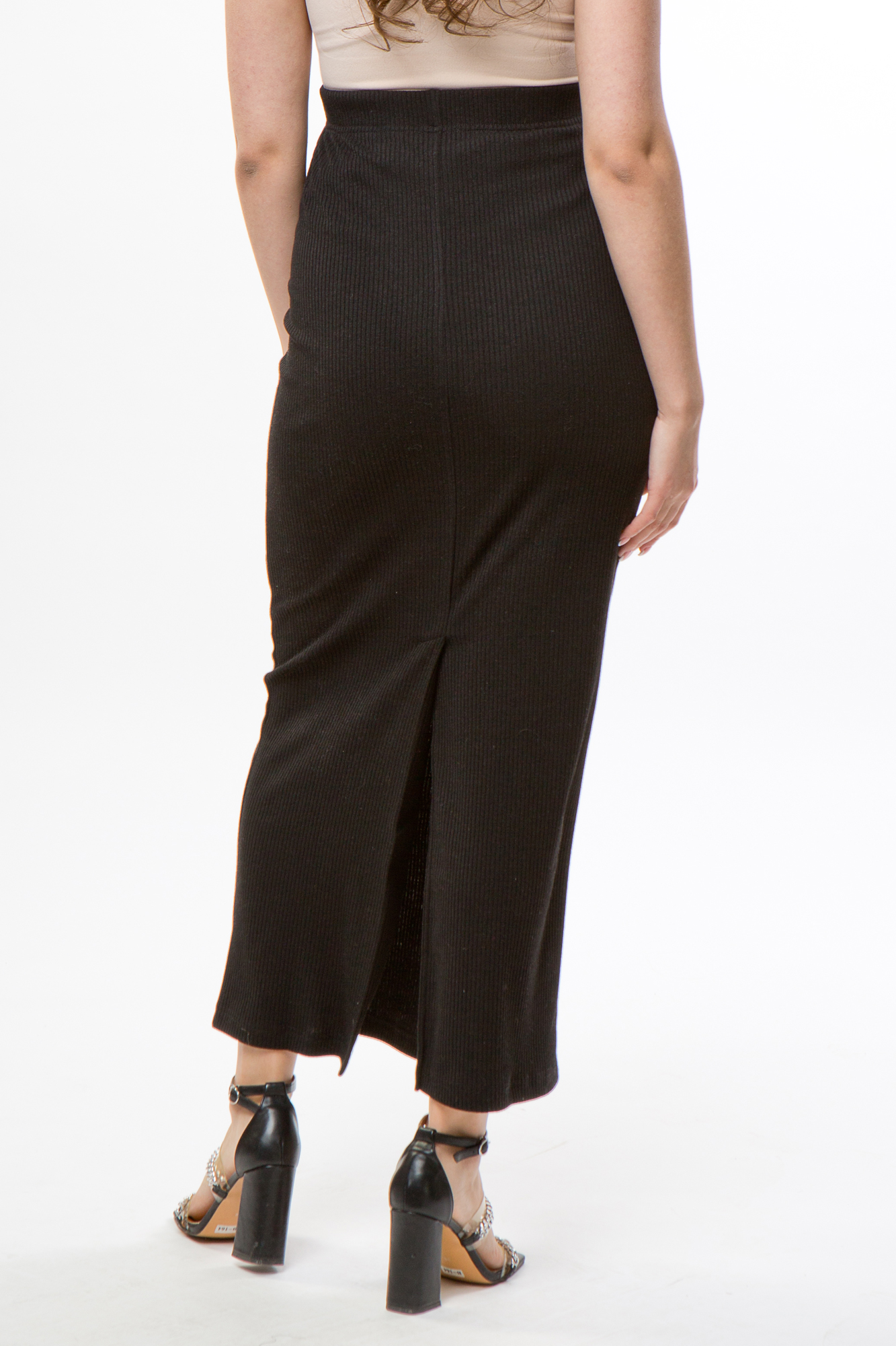 Трикотажная юбка с высокой посадкой. Удобная для повседневной носки, а также работы в офисе и деловых встреч. Юбка идеально подчеркивает округлившийся животик, облегает фигуру, но при этом не сковывает движений, предусмотрена шлица.