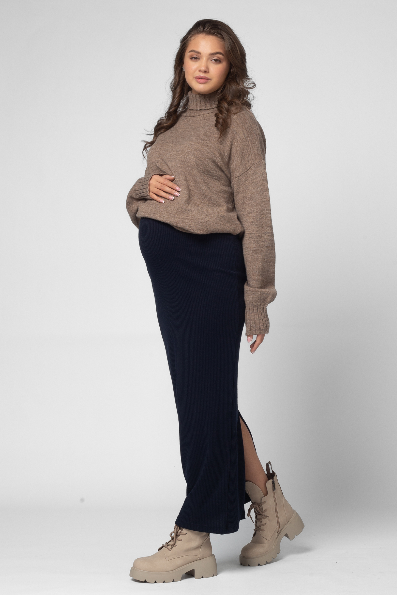 Трикотажная юбка с высокой посадкой. Удобная для повседневной носки, а также работы в офисе и деловых встреч. Юбка идеально подчеркивает округлившийся животик, облегает фигуру, но при этом не сковывает движений, предусмотрена шлица.